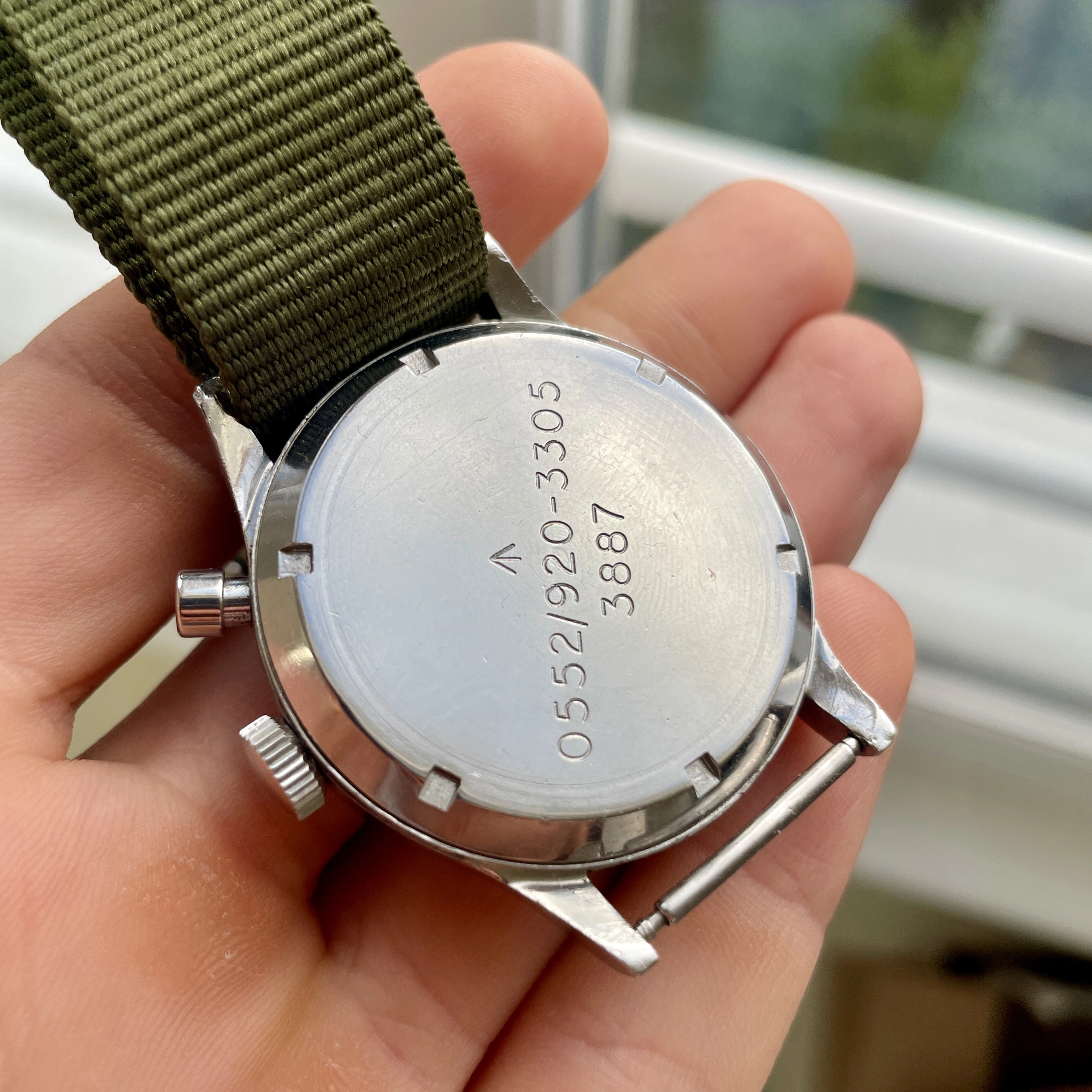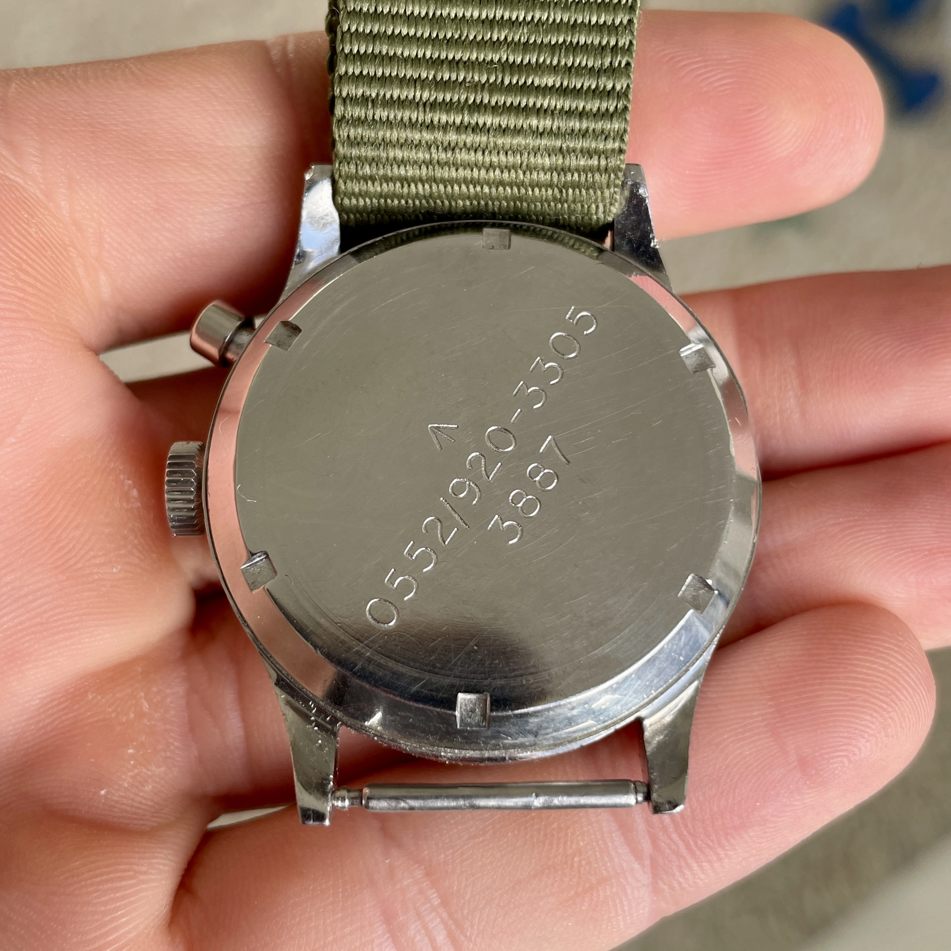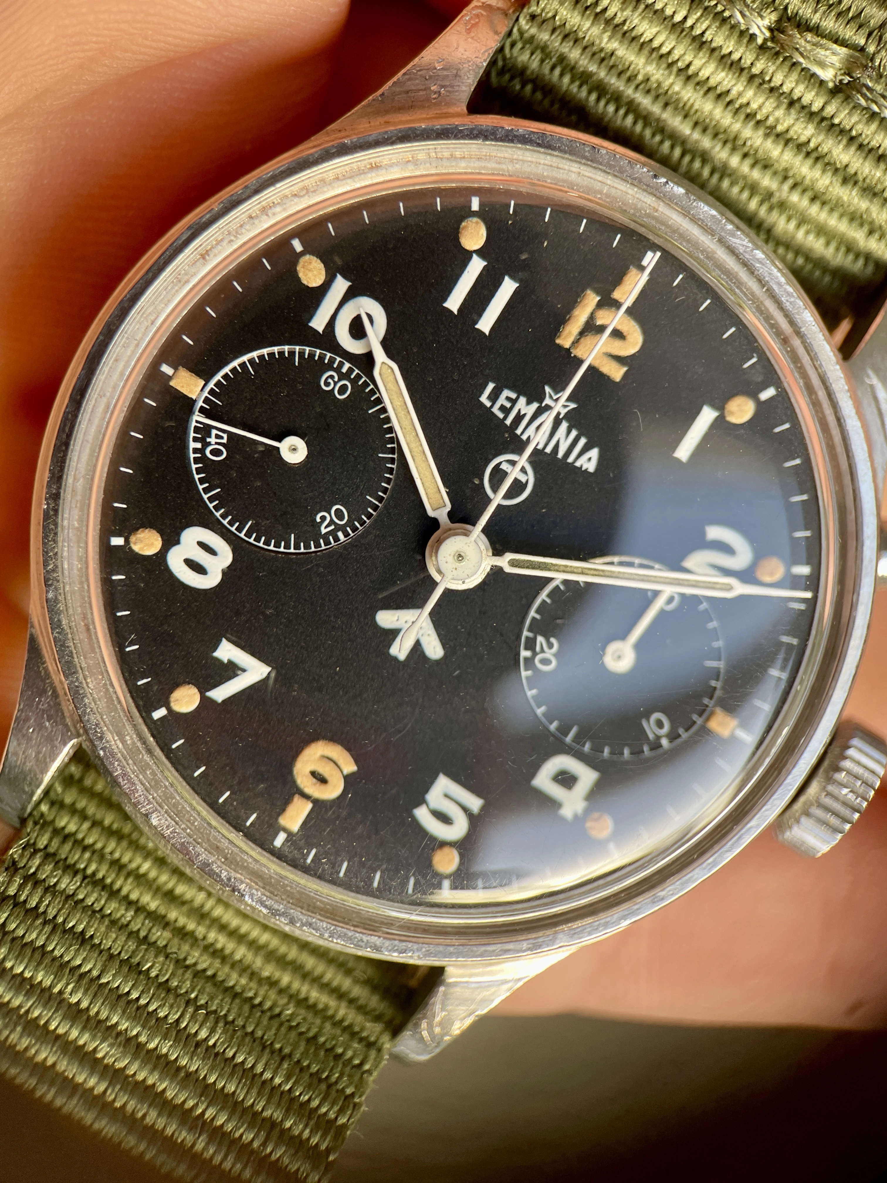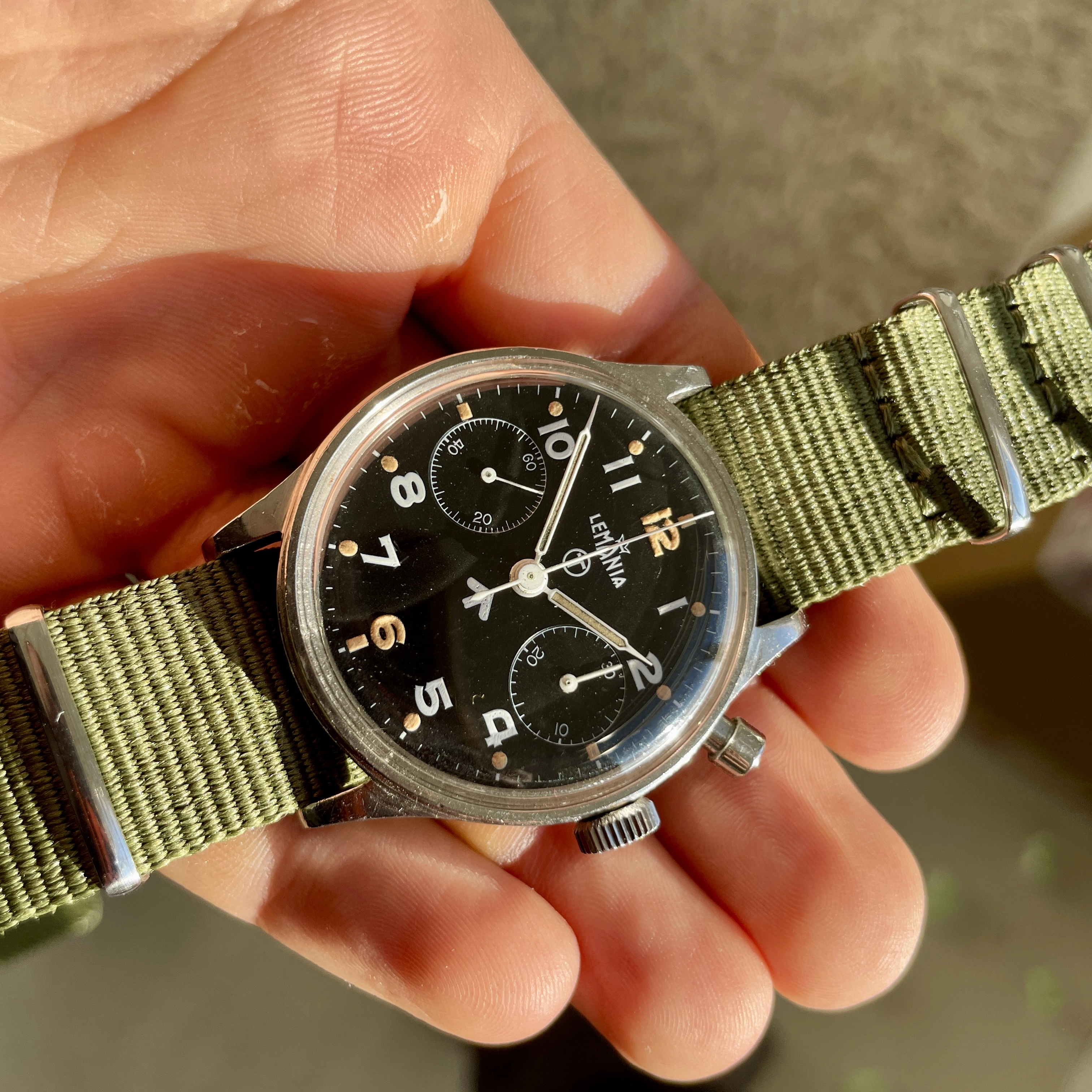 ·A spectacular vintage Lemania Single/Mono-Pusher Chronograph, Military Royal Navy Issued Wrist Watch in excellent condition. Lemania single pusher chronographs were issued to British military servicemen between 1945 and 1976. This particular example is a Royal Navy issue, identified by its model reference number, 0552/920-3305.
