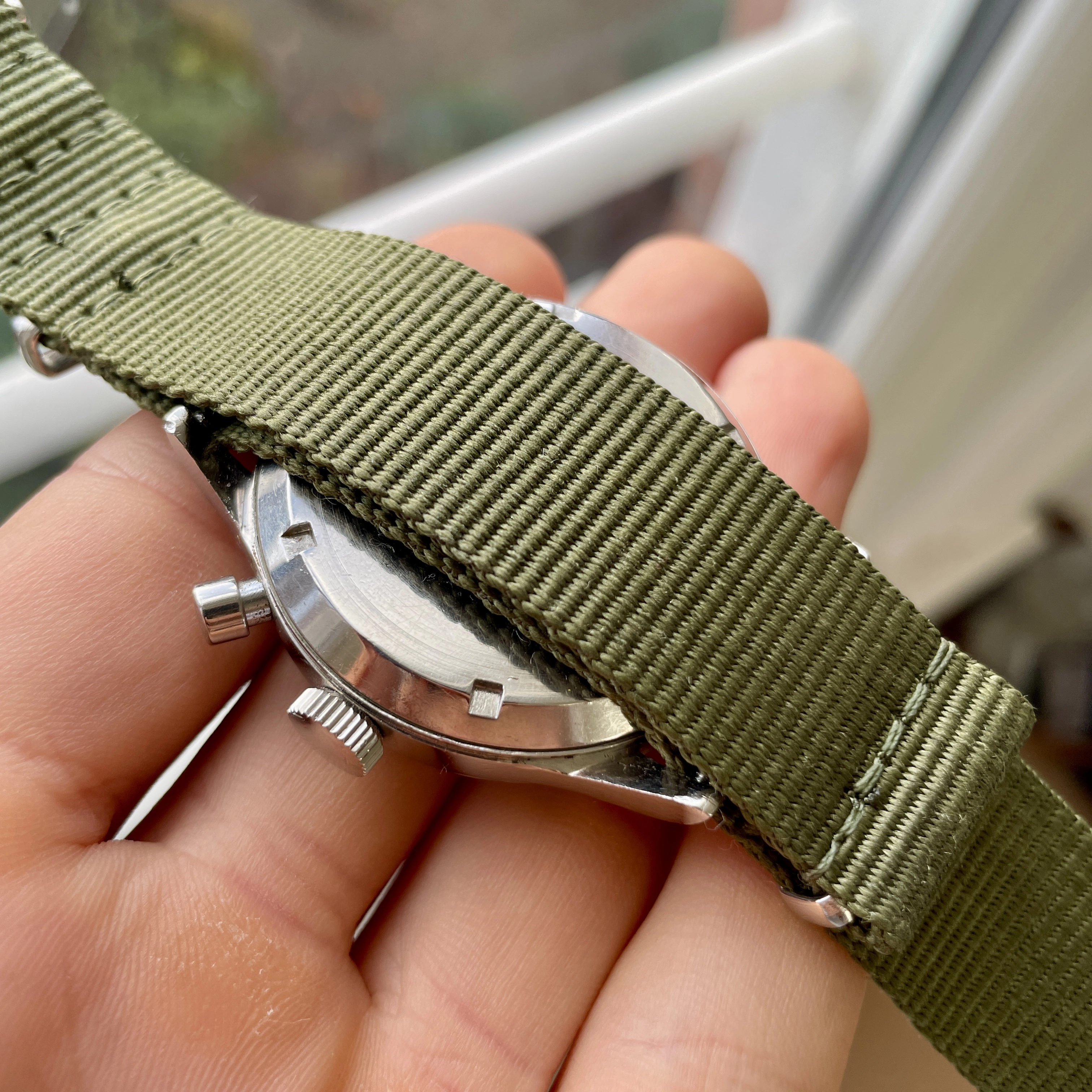All components on this watch are original. The sharp and unpolished stainless steel case has a width of 38.5mm, making this a large watch for the period. The screw back case is in excellent condition without any major scratches. The case has minimal wear consistent with age.