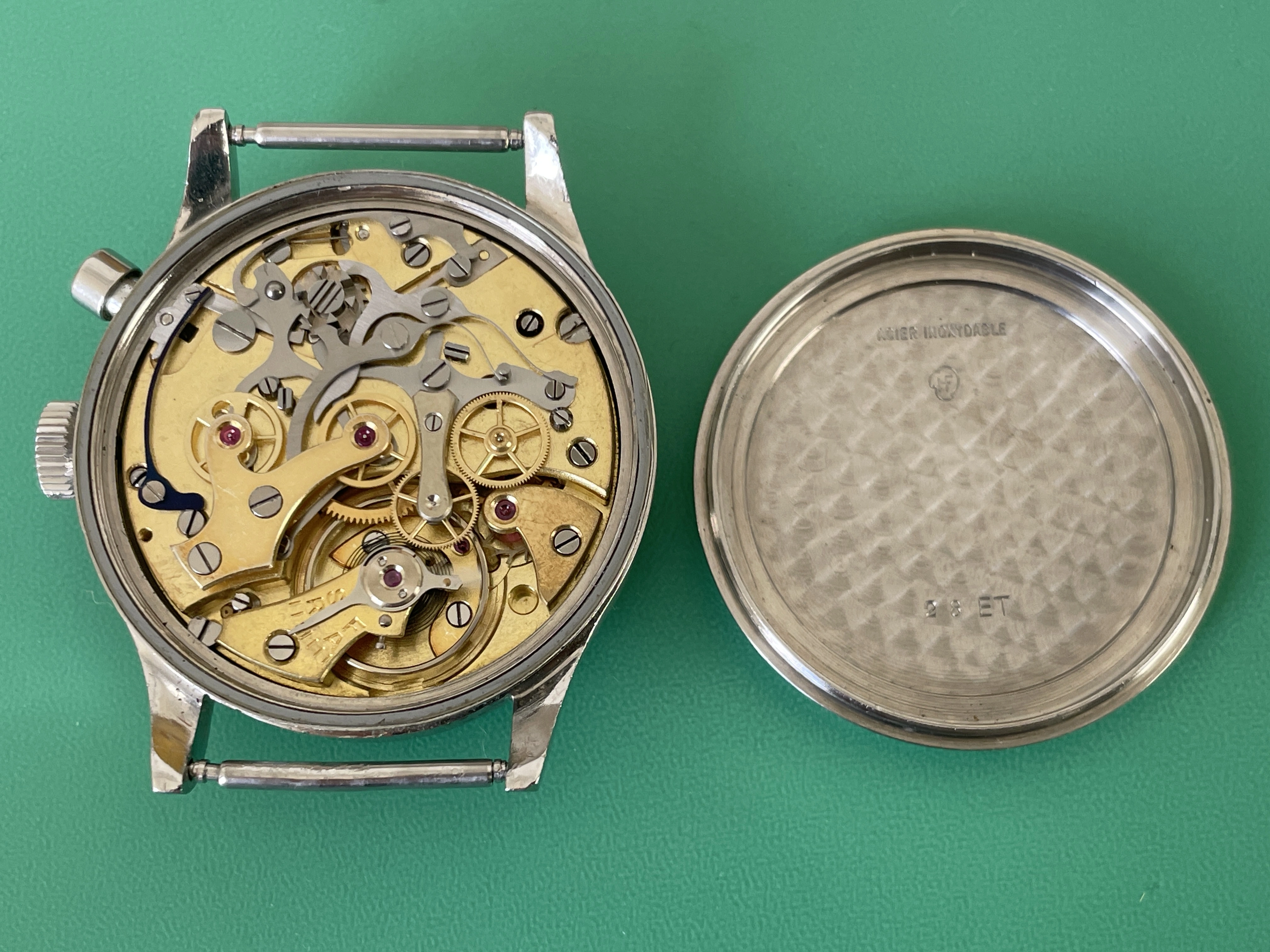 The watch is powered by the famous and much admired Lemania 17 jewelled, Calibre 15CHT movement with column wheel chronograph. The single button/pusher is fairly atypical and starts, stops and resets the chronograph (stopwatch function). Movement is running well. Service history unknown.