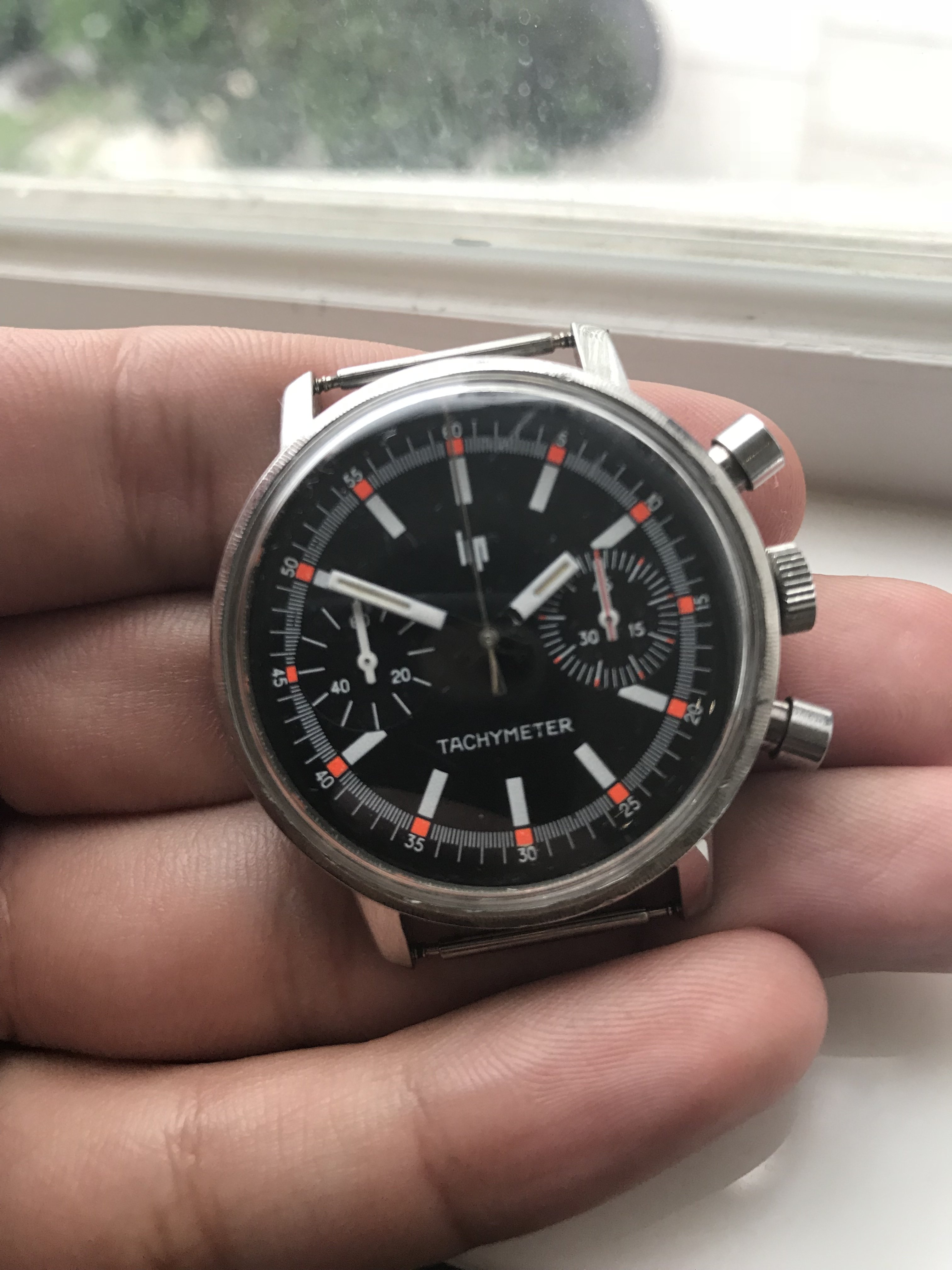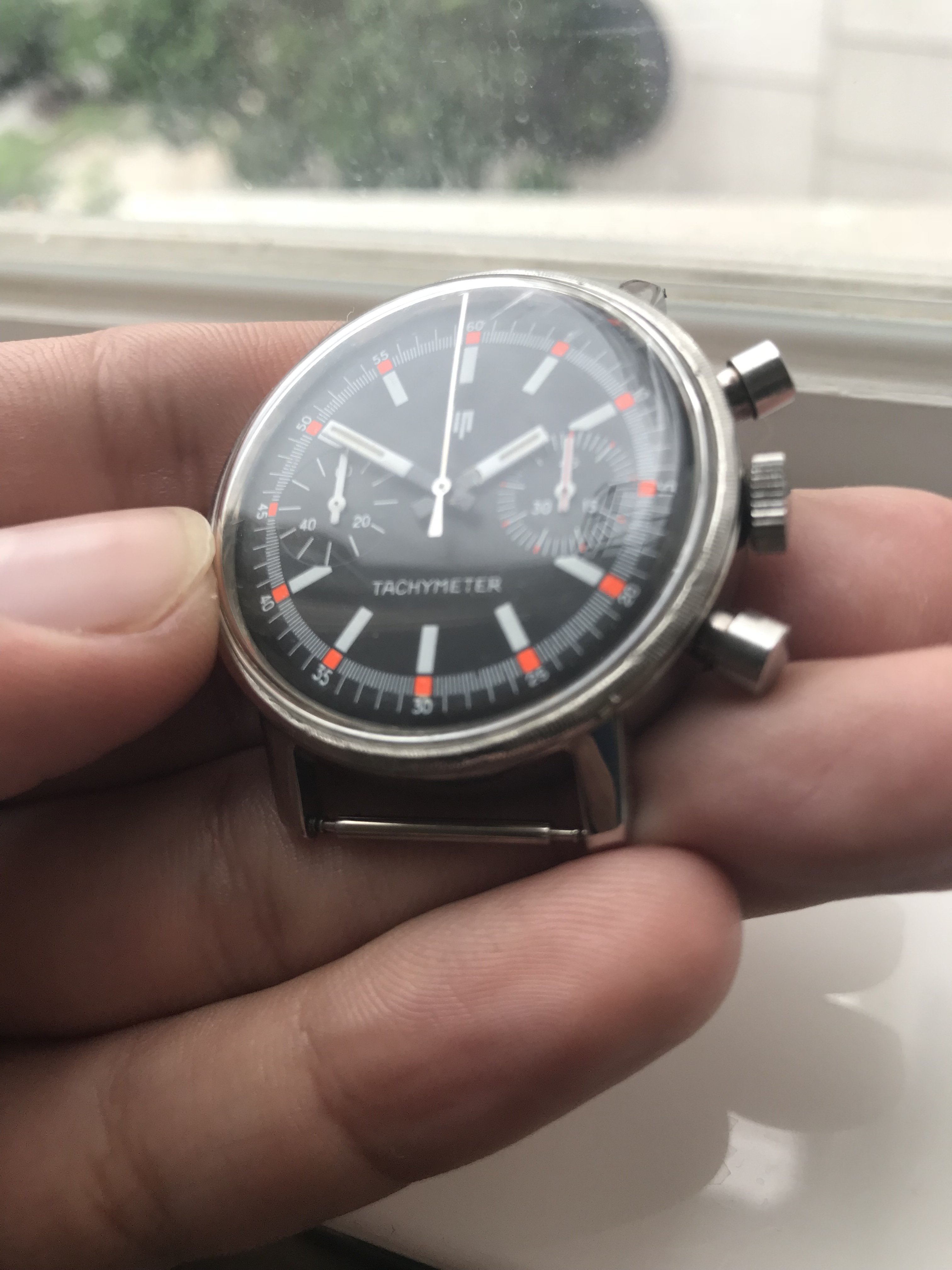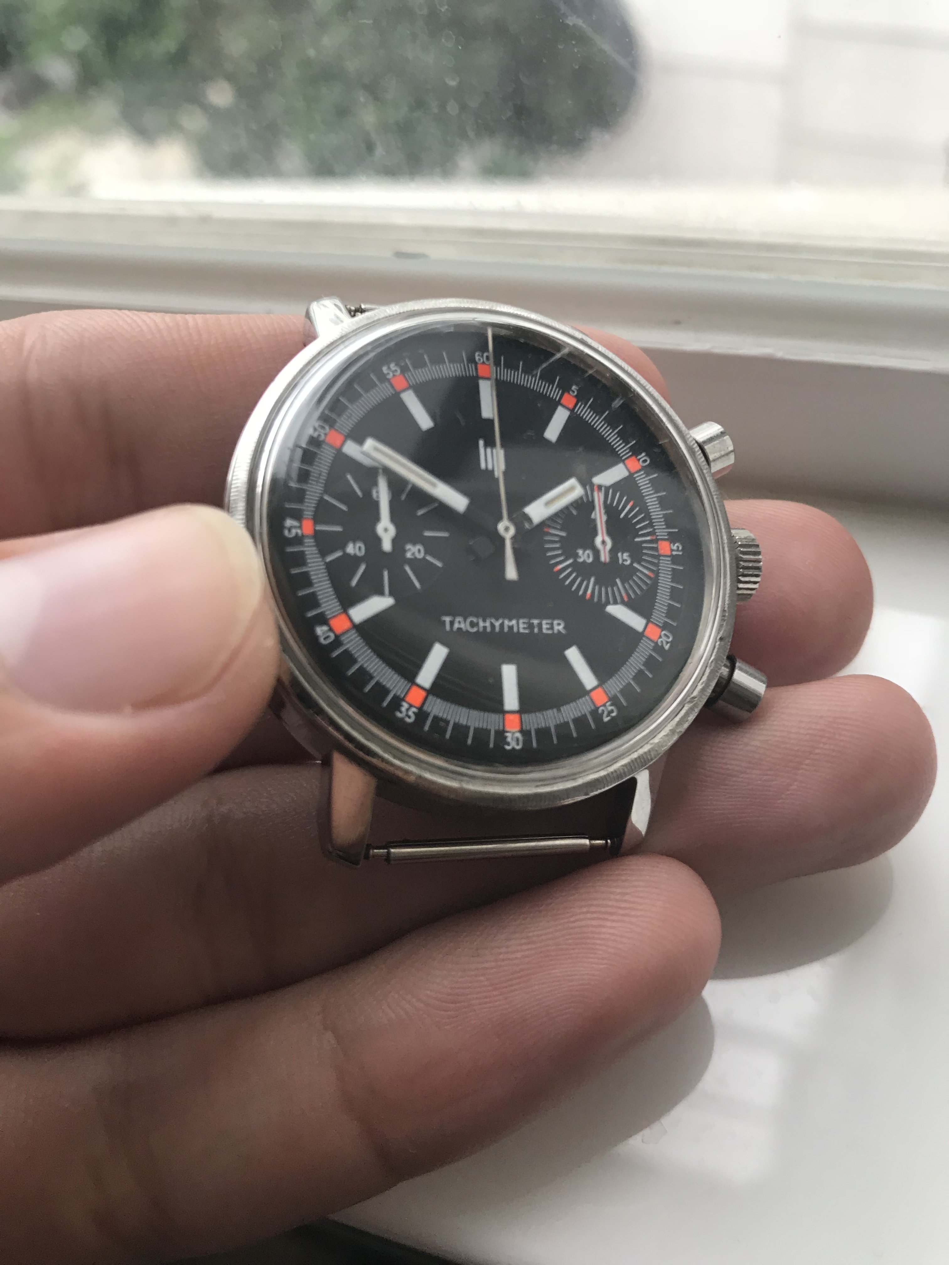 Up for sale is a nice Lip Tachymeter I picked up at the beginning of this year. I purchased it due to the similarity to the red racing Speedmaster dials from the late 1960s.