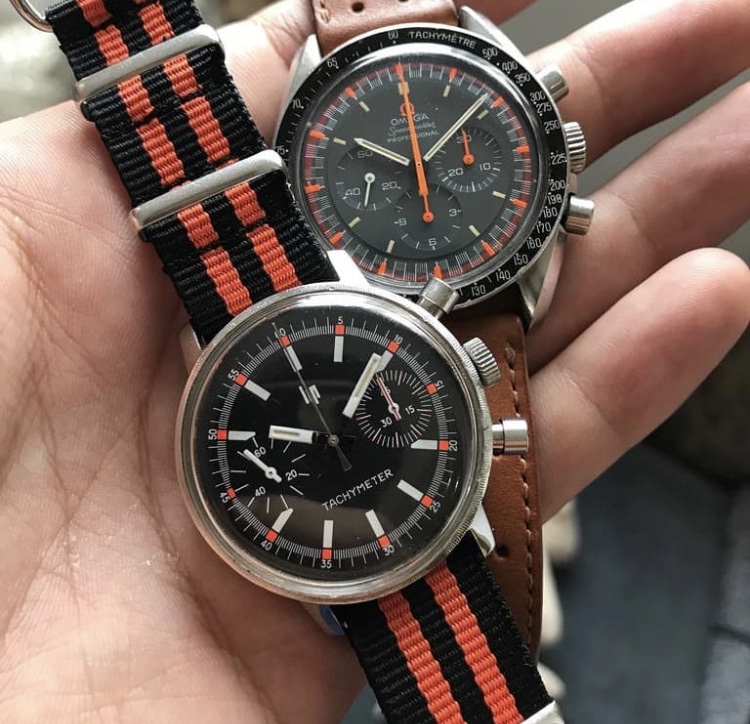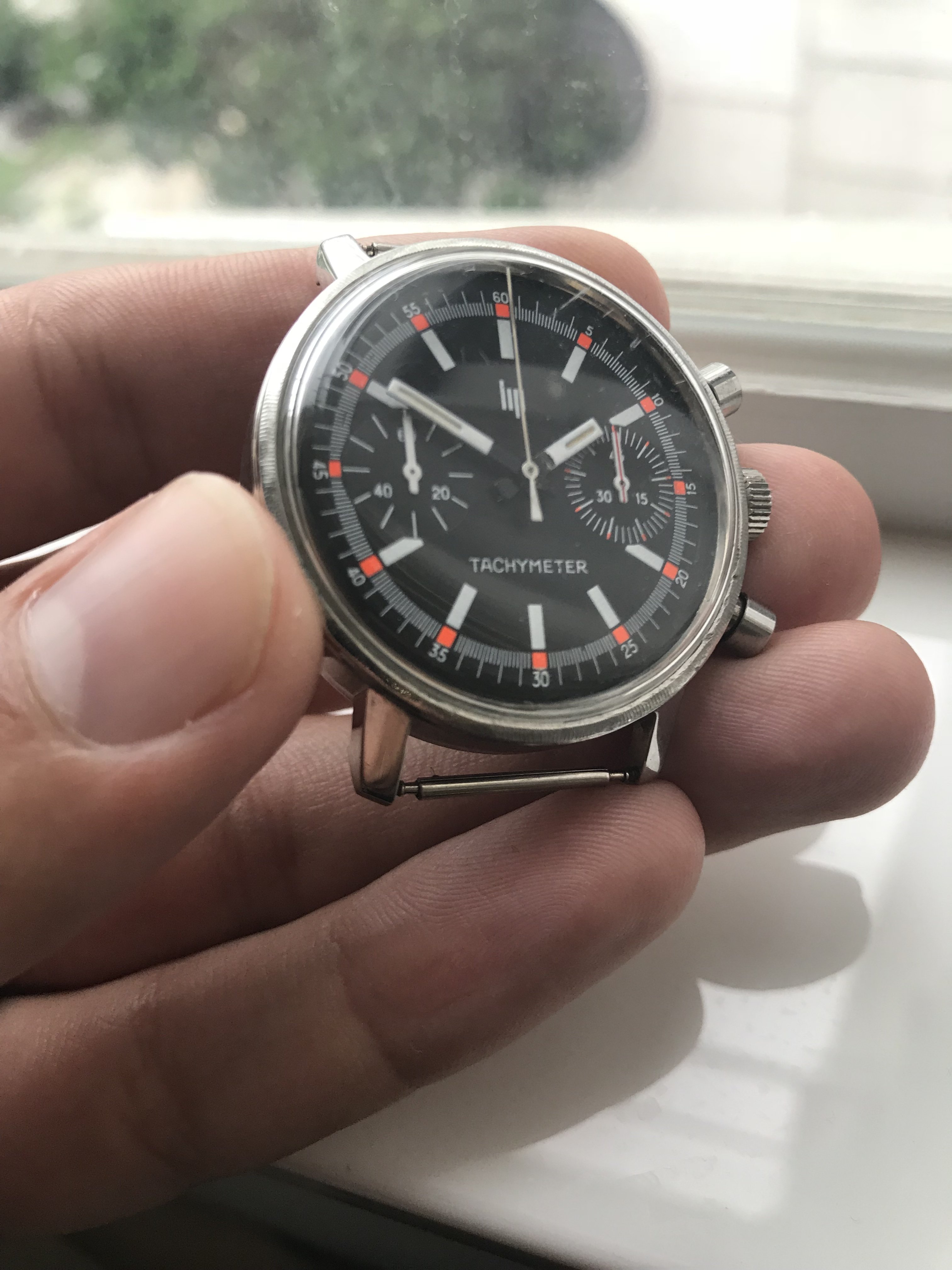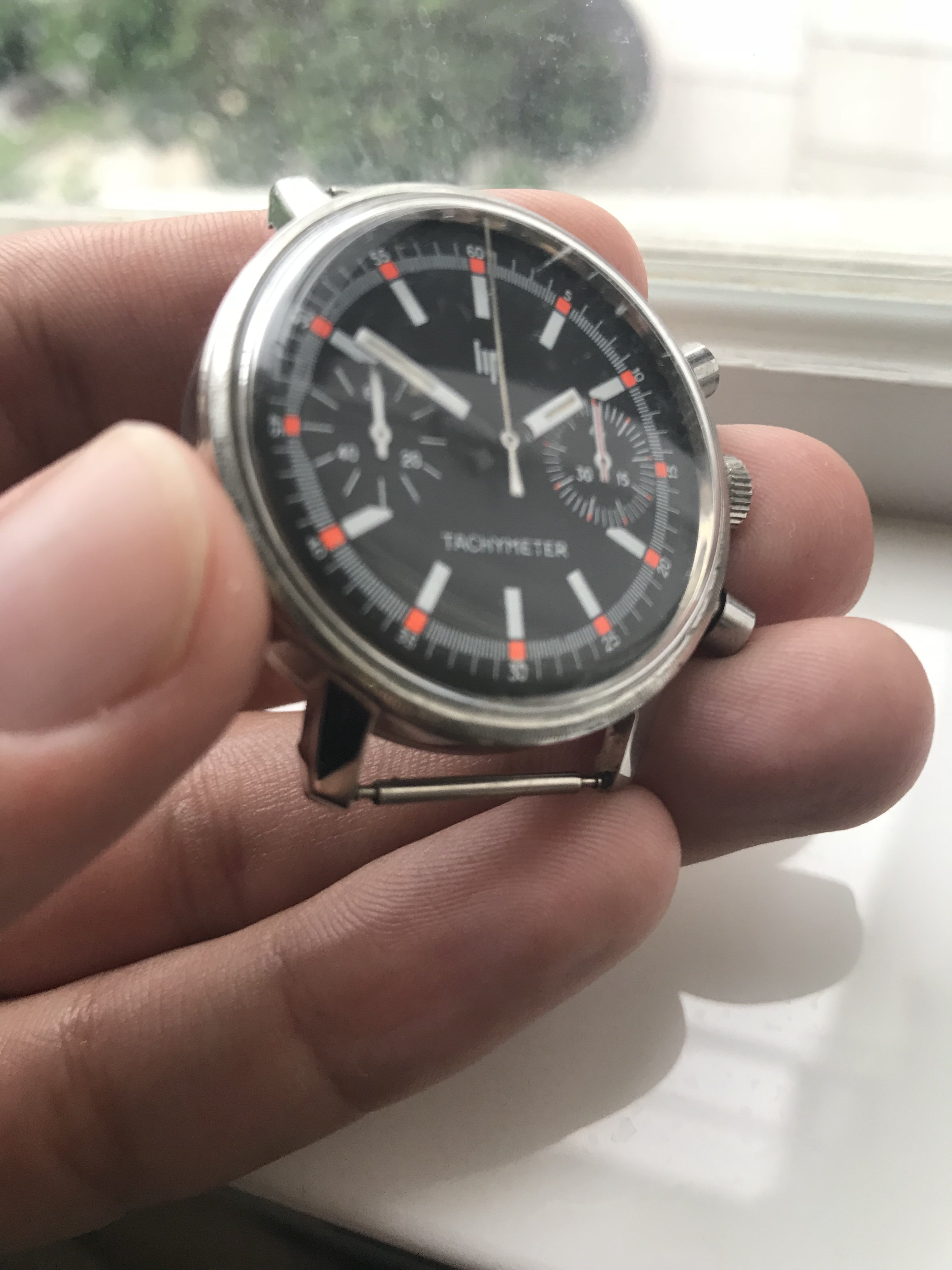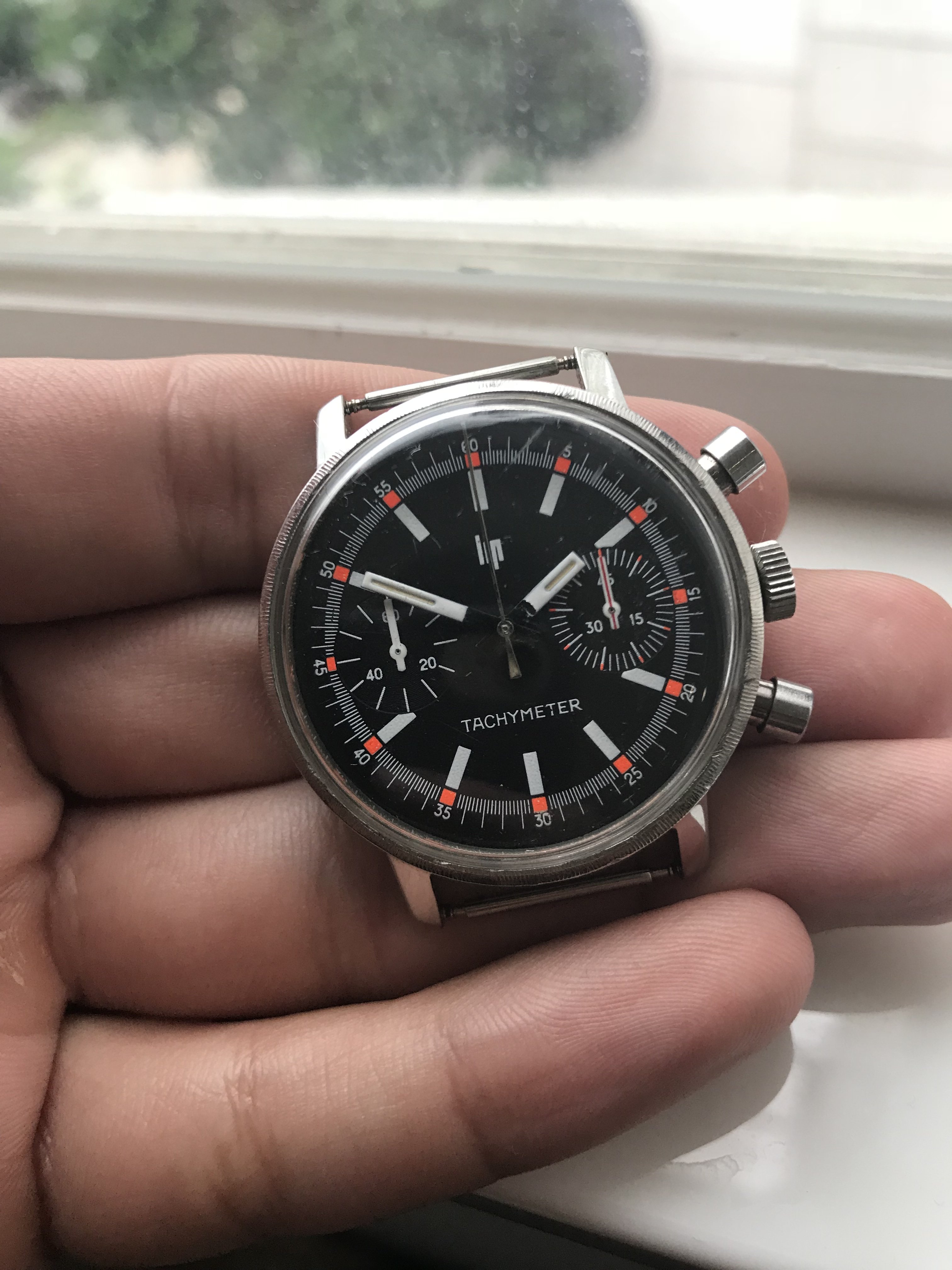 Up for sale is a nice Lip Tachymeter I picked up at the beginning of this year. I purchased it due to the similarity to the red racing Speedmaster dials from the late 1960s.