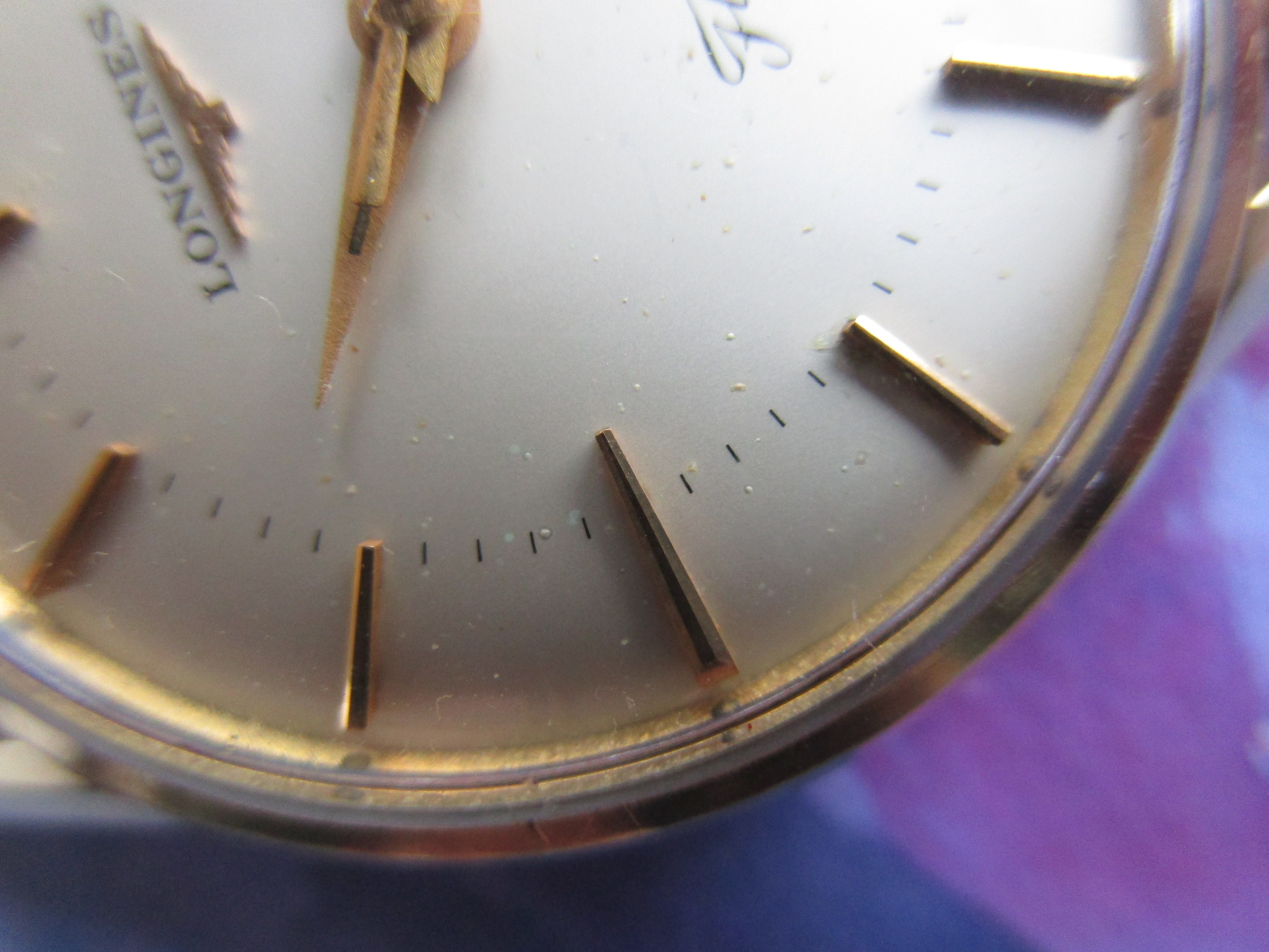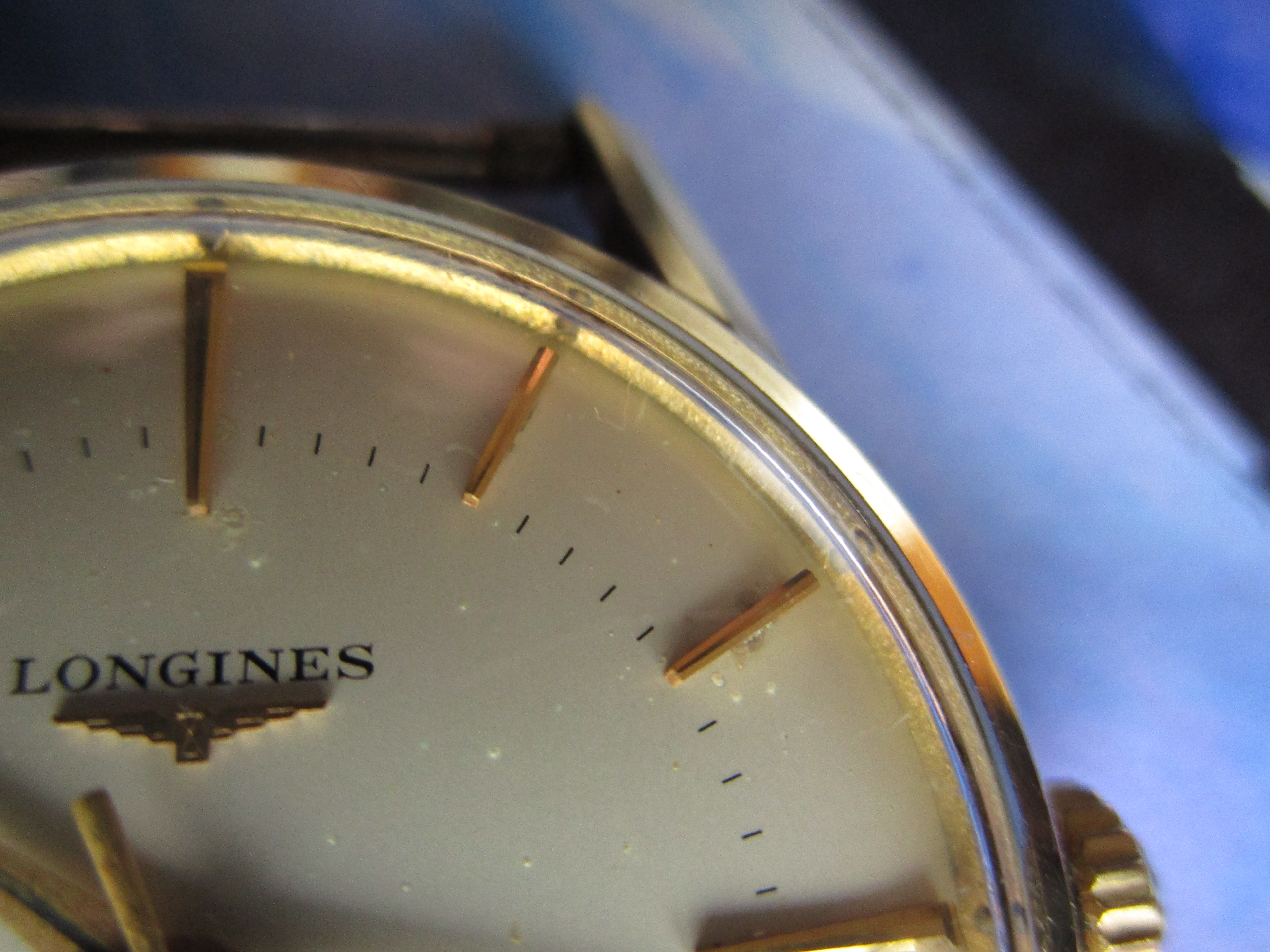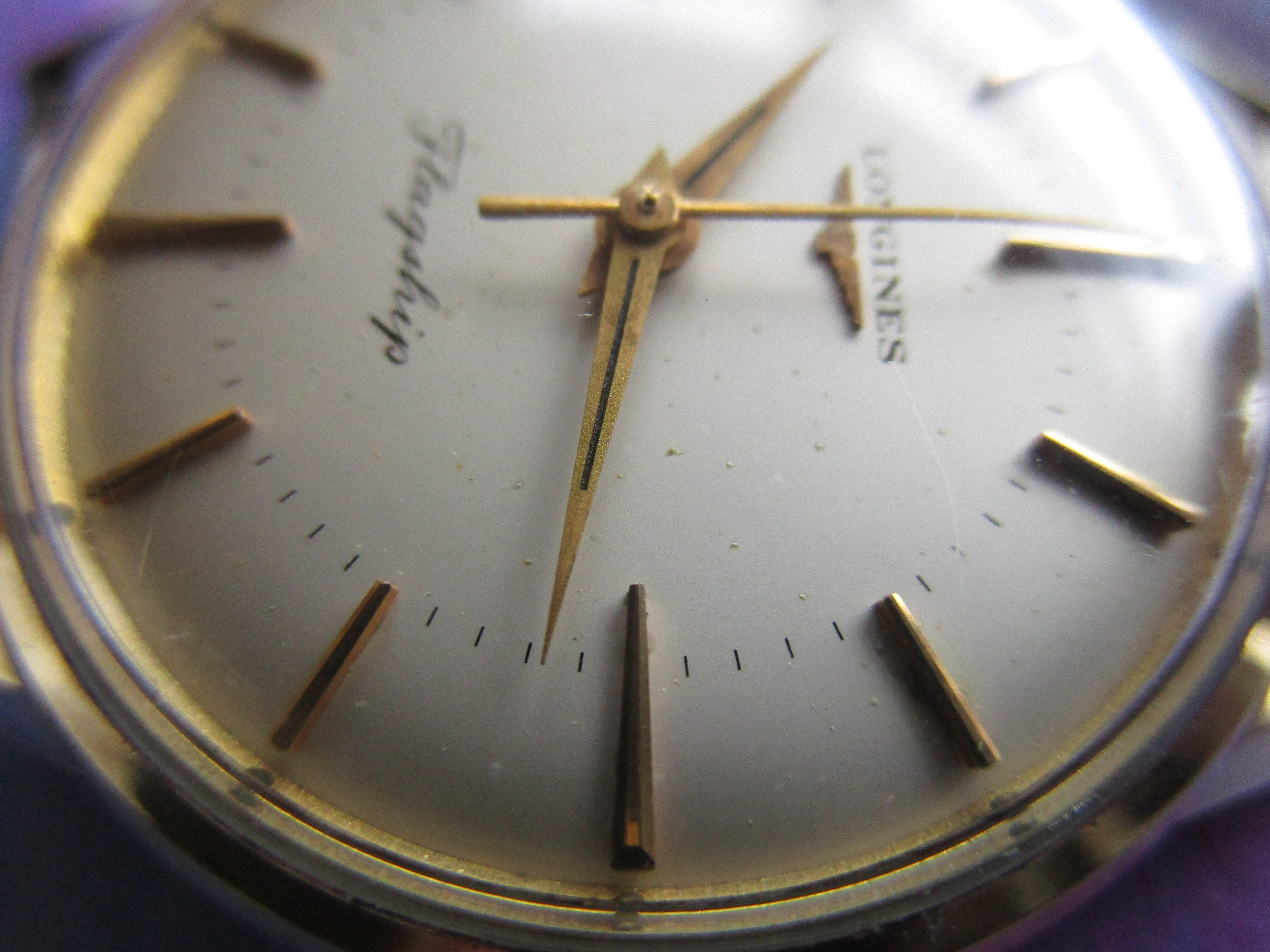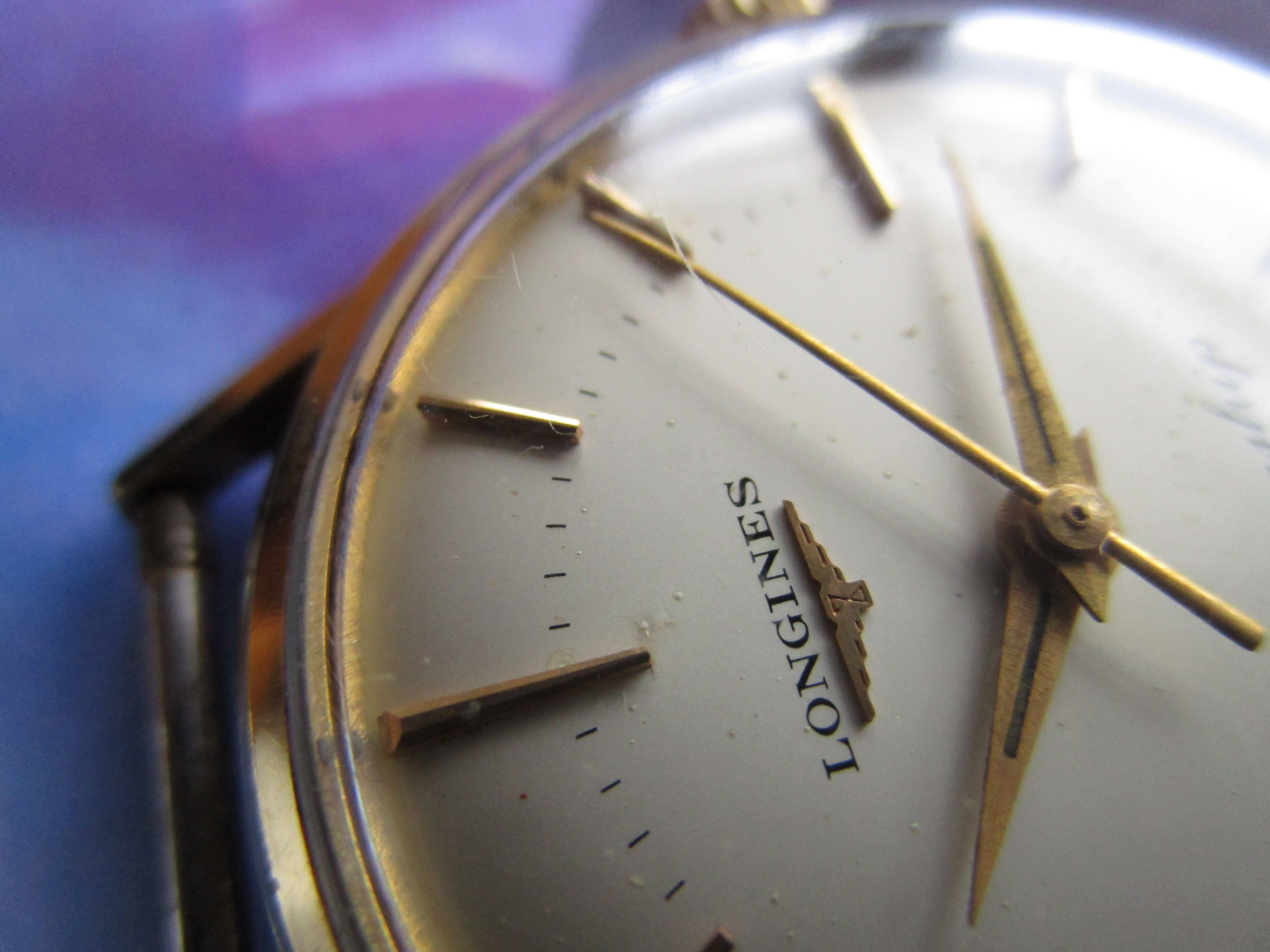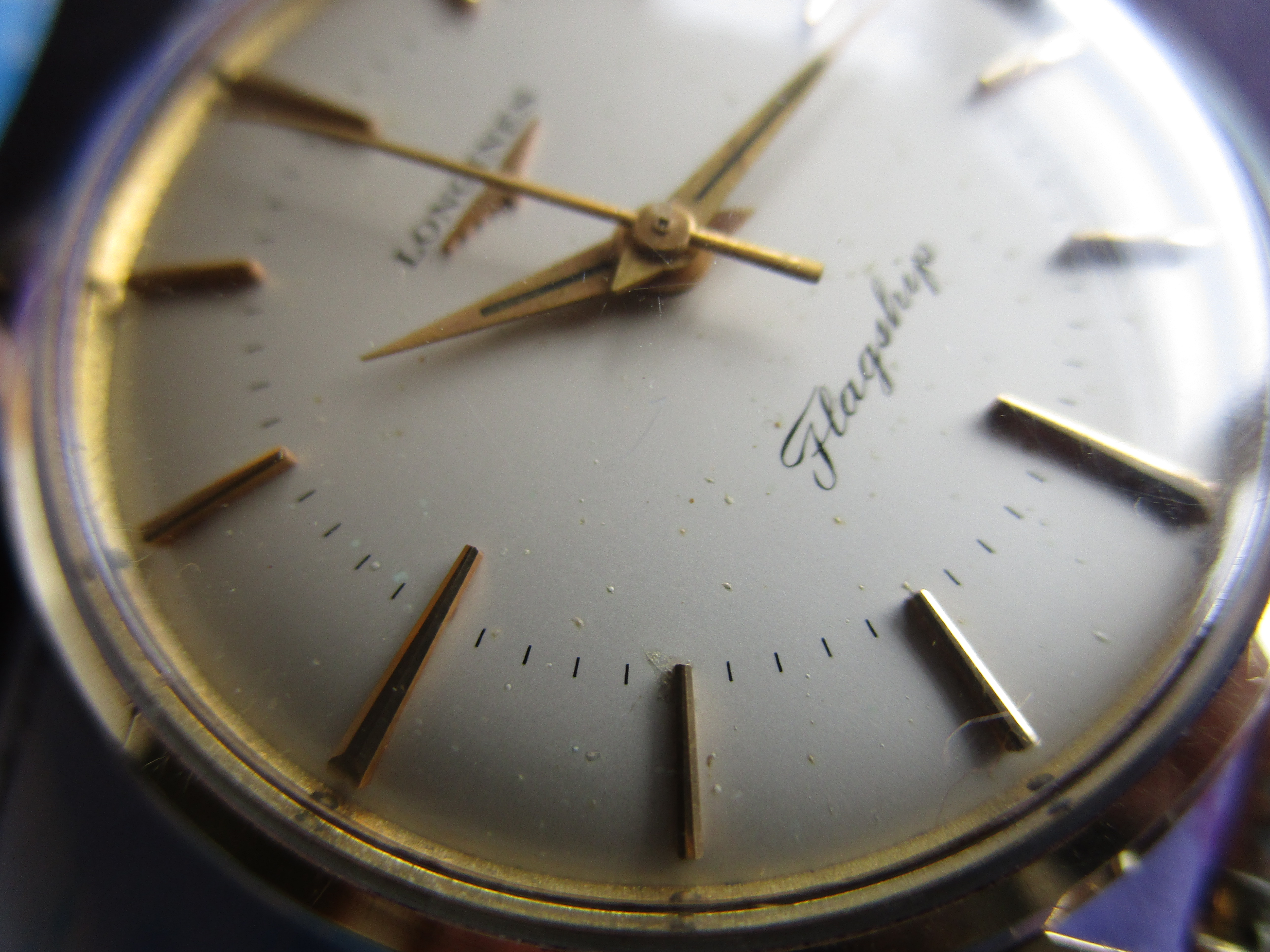 The watch is in very good to excellent overall condition. It is all original to my knowledge. The 35mm screw-back case is unpolished, and the Flagship emblem on the back is still visible, and in better condition than most of the (steel) versions. The eggshell dial shows a very light, evenly spread patina, and has a small scratch just above the center pinion. There is also a very faint trace of radium burn, which is barely noticeable. A pedantic note: LONGINES produced these dials both with and without radium, and there were two radium versions. One featured radium in the hands and above the indexes, while the other, like this one, had only a touch of radium in the hands.