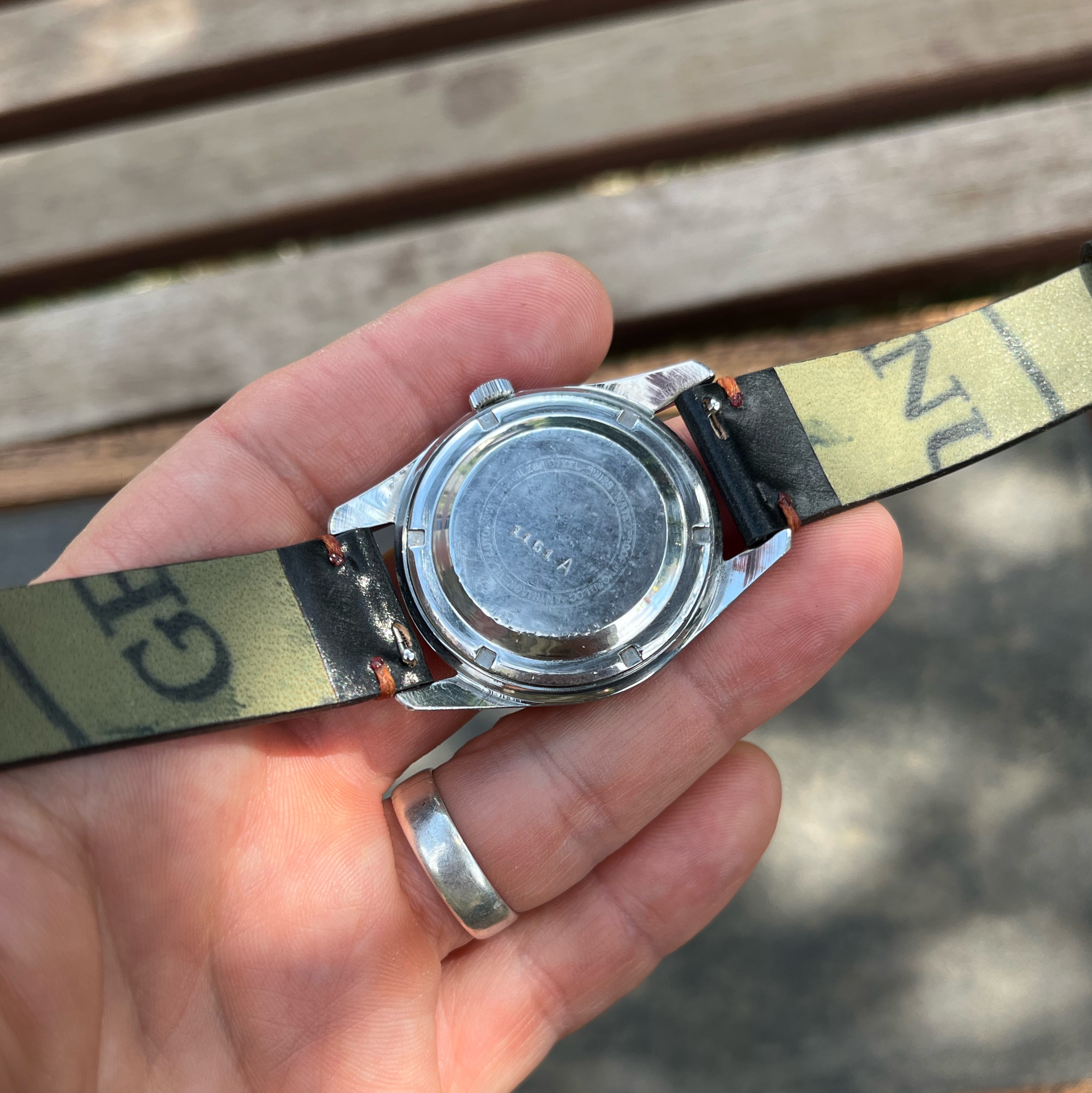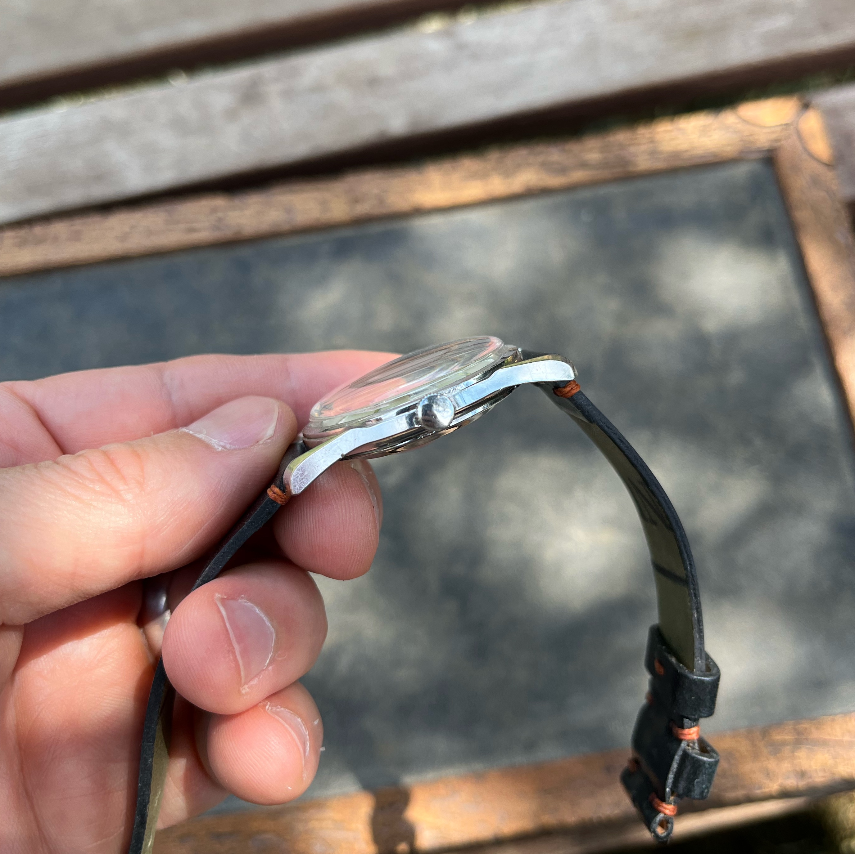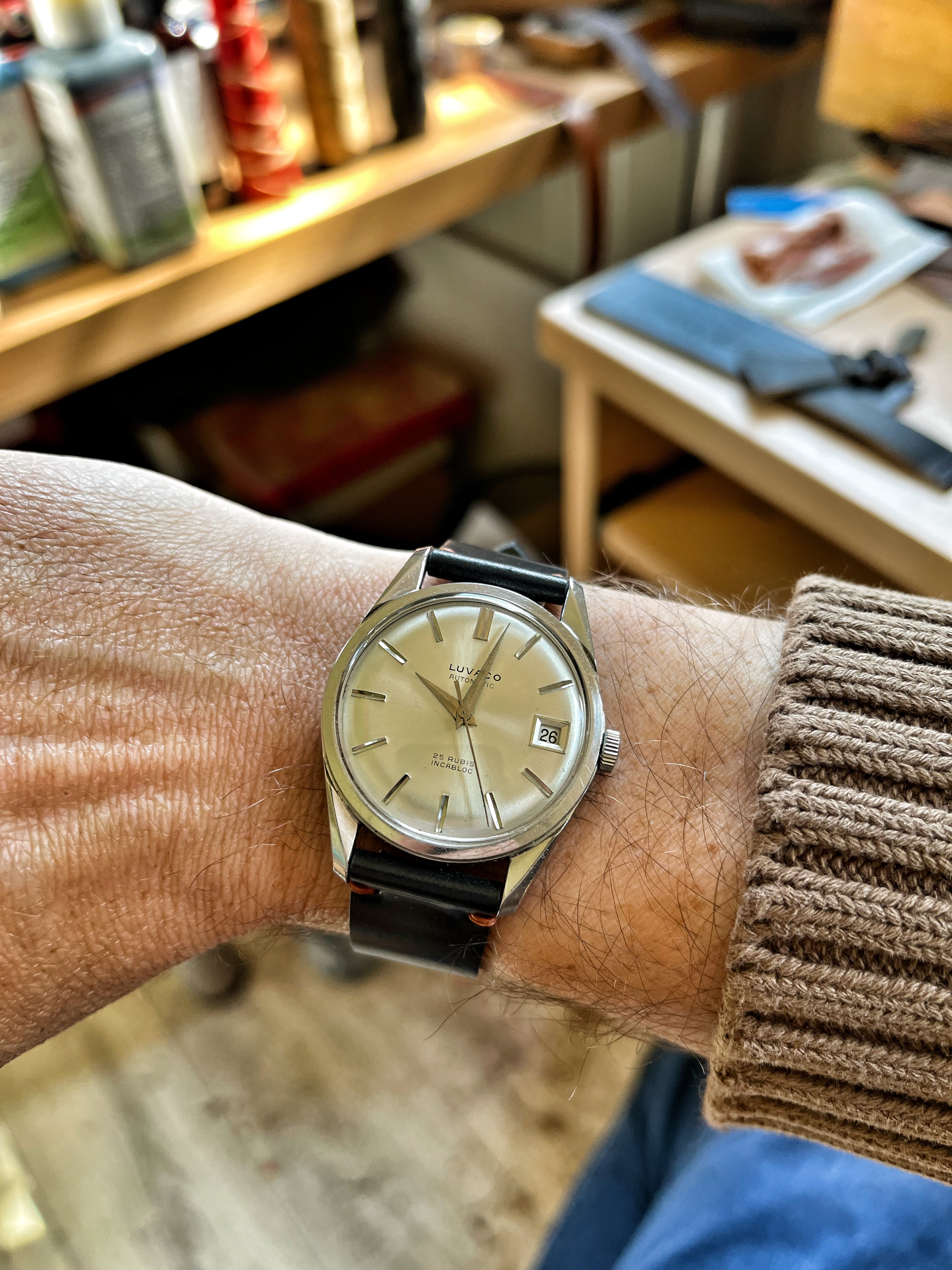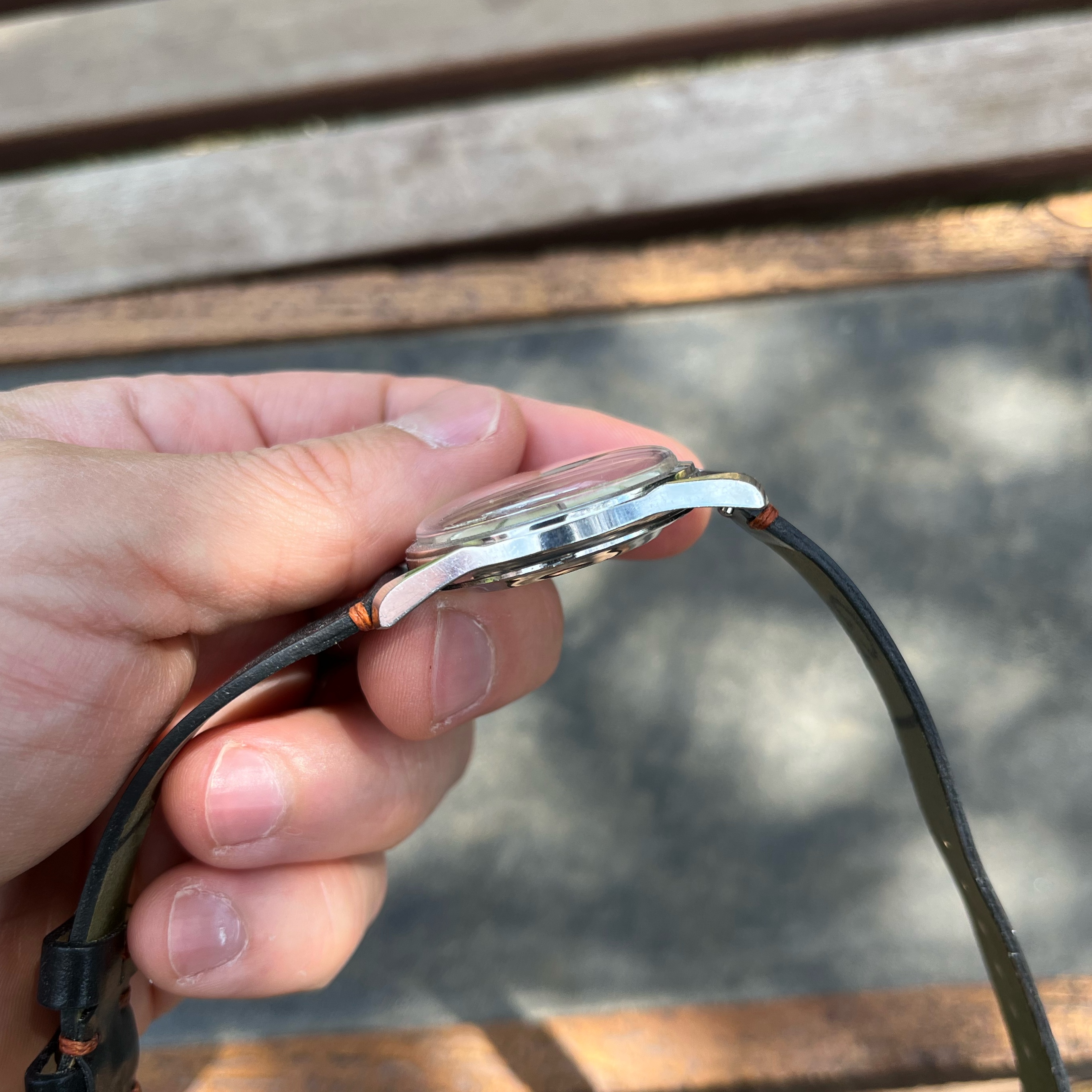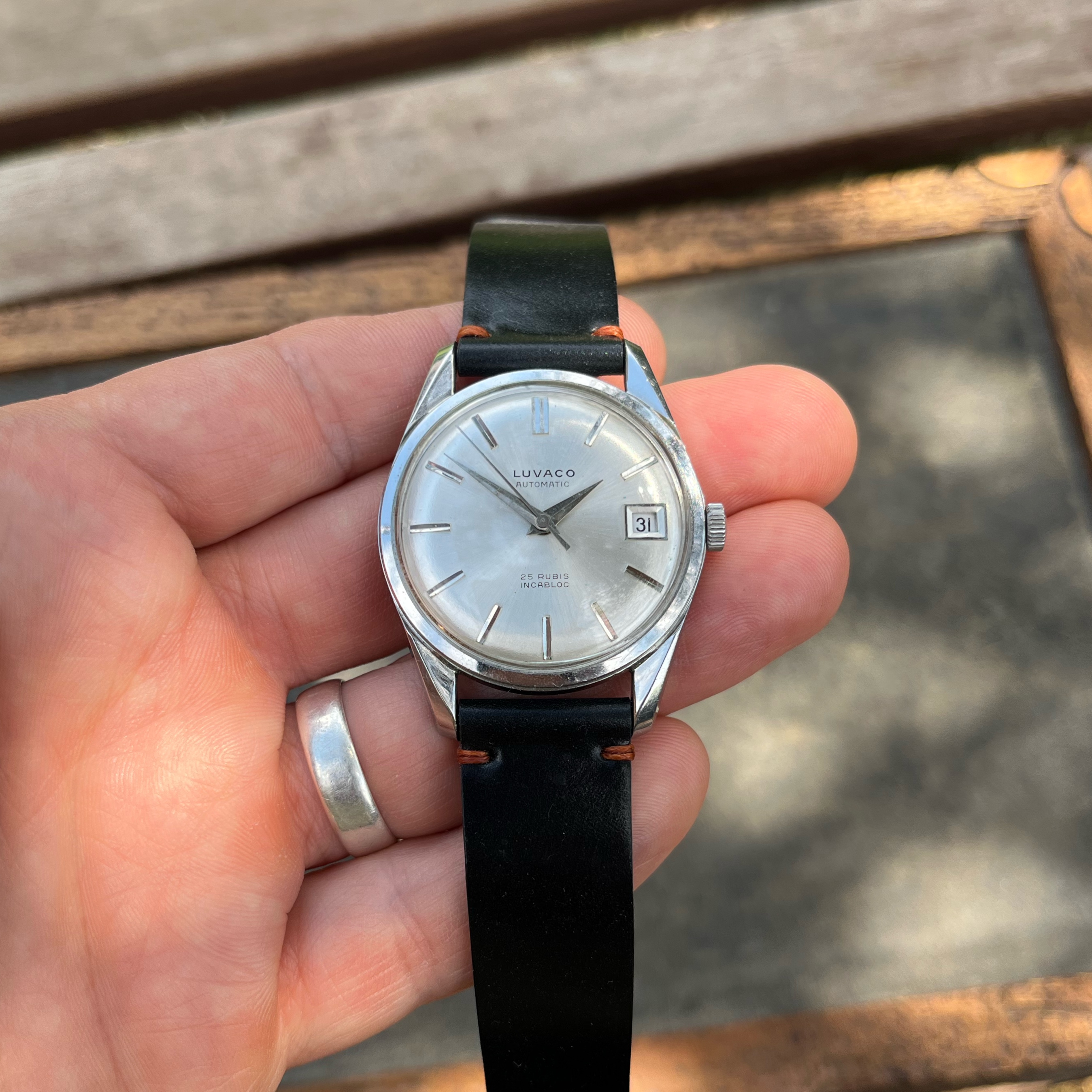 Hey guys. I have here this nice vintage Luvaco. The watch is in a nice worn condition. The dial has a silver brush. Glass is OK with light scratches. The hands have some oxidation. The watch is running with a good power reserve, but please keep in mind that I dont know when it was serviced last... The case has some wear. Diameter without crown is 34mm and lug tip to lug tip is 43mm. Have a look how it wears on my 16,5cm wrist. It will come on the black shell cordovan strap as on the pictures.