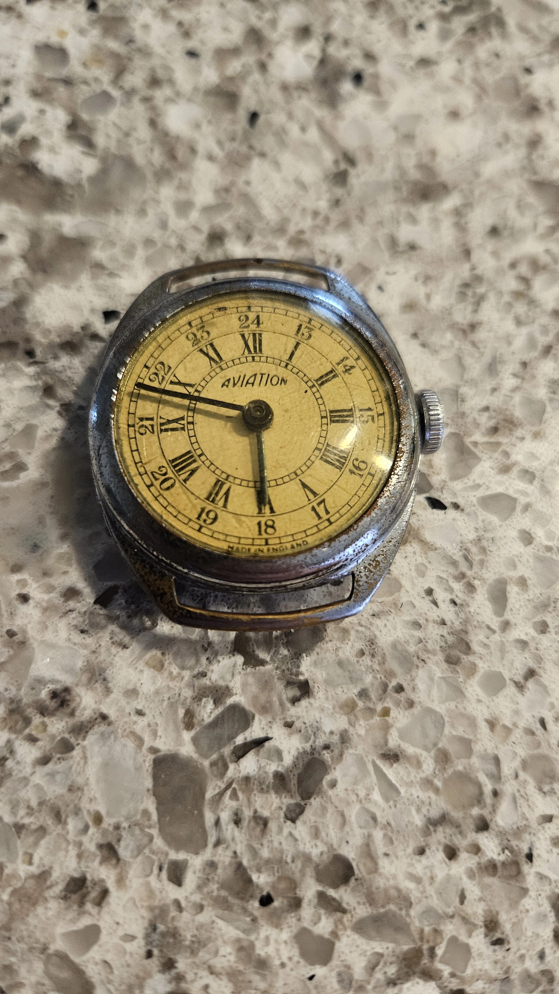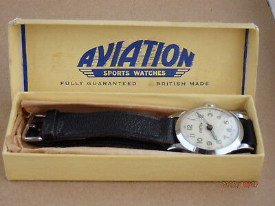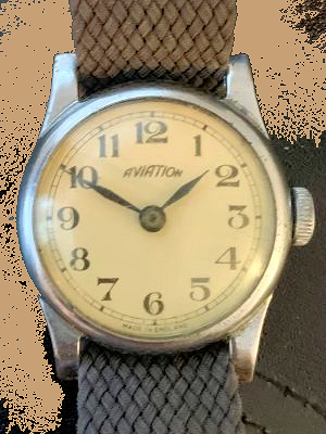 These watches were generally assembled in England using imported parts and low-cost British pin-pallet movements from suppliers such as Louis Newmark (Croydon), Anglo-Celtic (Ystradgynlais, Wales), and occasionally Smiths. The cases were simple chrome-plated brass, often with fixed lugs, and the dials bore the distinctive “AVIATION” logo (small “a”, rising mid-word, ending in small “n”).