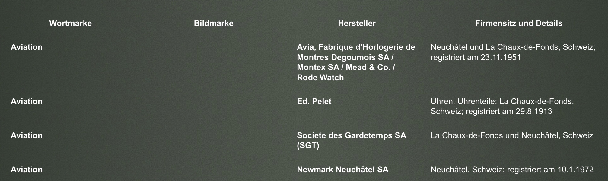 The Aviation brand was a house name of the Services Watch Co. Ltd, originally founded in Leeds in 1926 by Frank Liquorish and later based in Leicester. Around 1938, Services created an Aviation Watch Co. Ltd subsidiary to market pilot-style and affordable civilian timepieces.