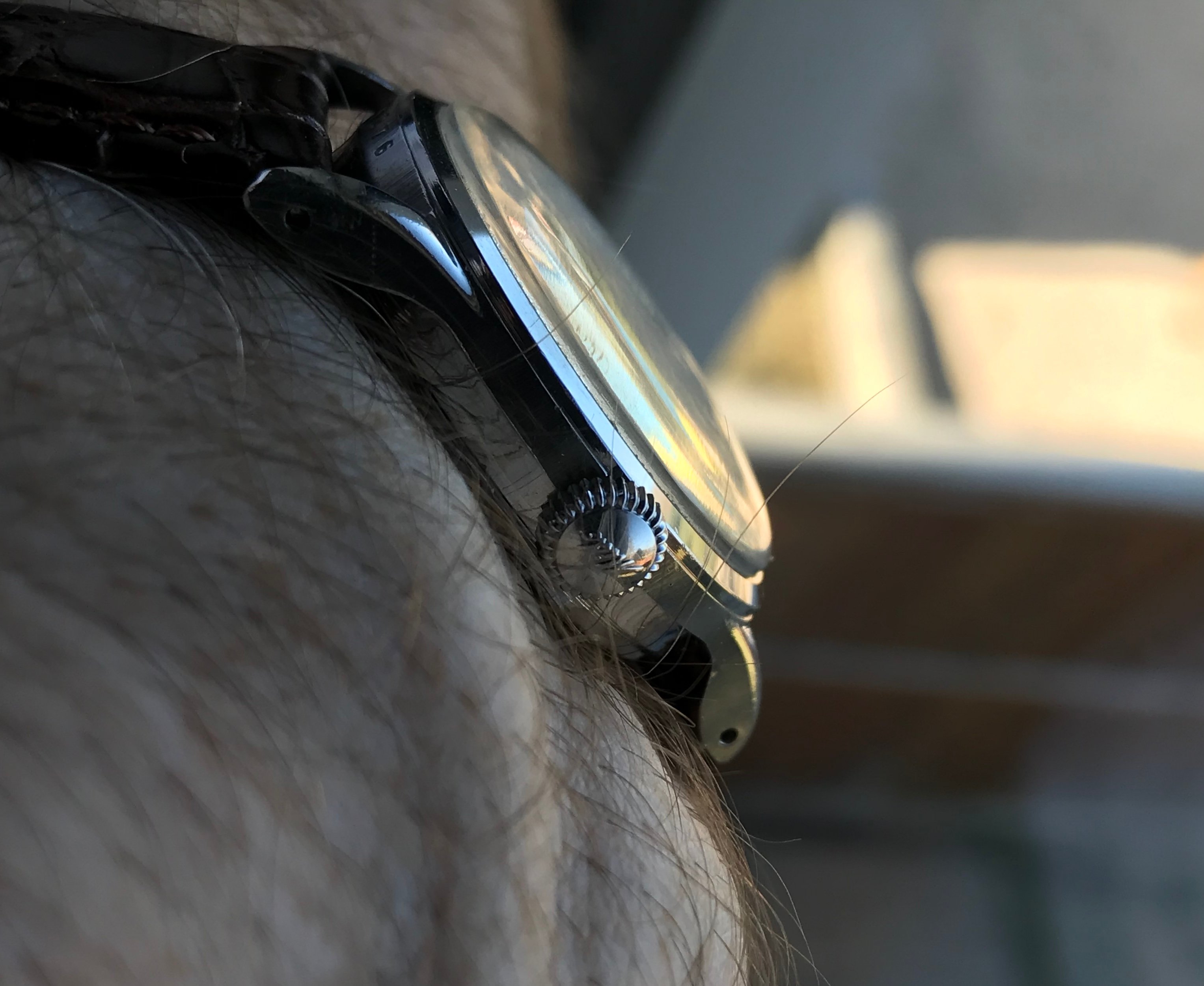 Case: 31 mm wide, stainless steel case with polished and drilled 16mm lugs and screw-down, decagonal case back. Some scratches on the case back but the case is in otherwise excellent condition for a 70 year old watch. The 4 digit number between the lugs corresponds to the last 4 digits of the serial number.