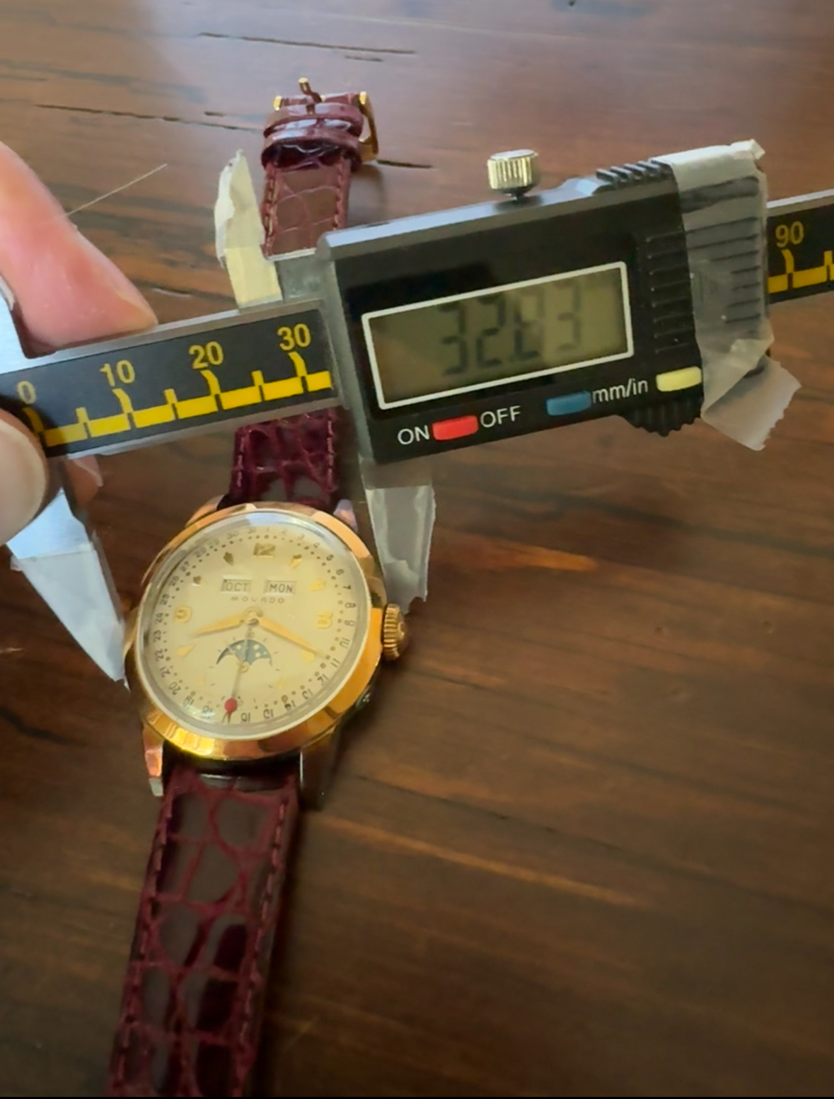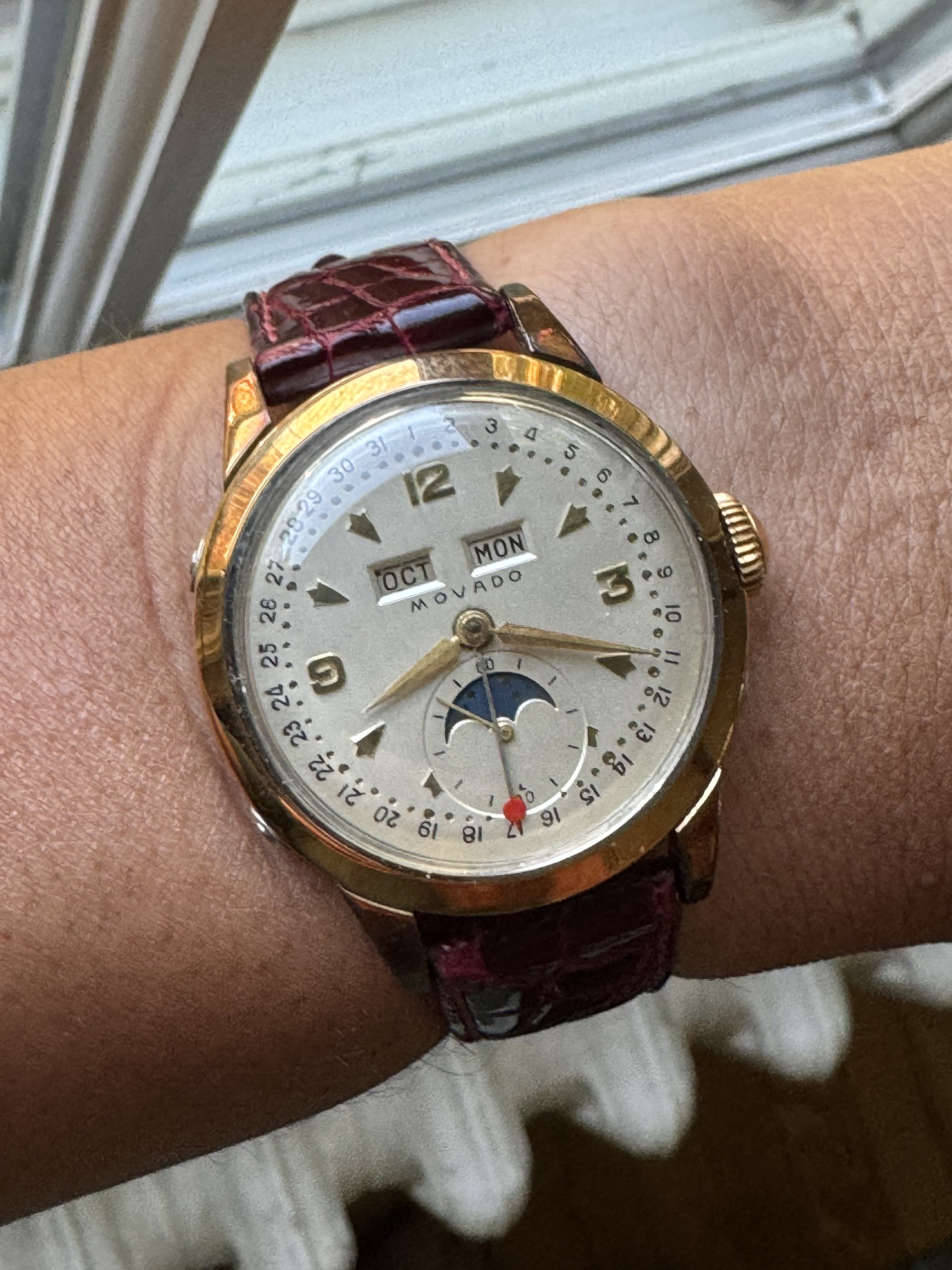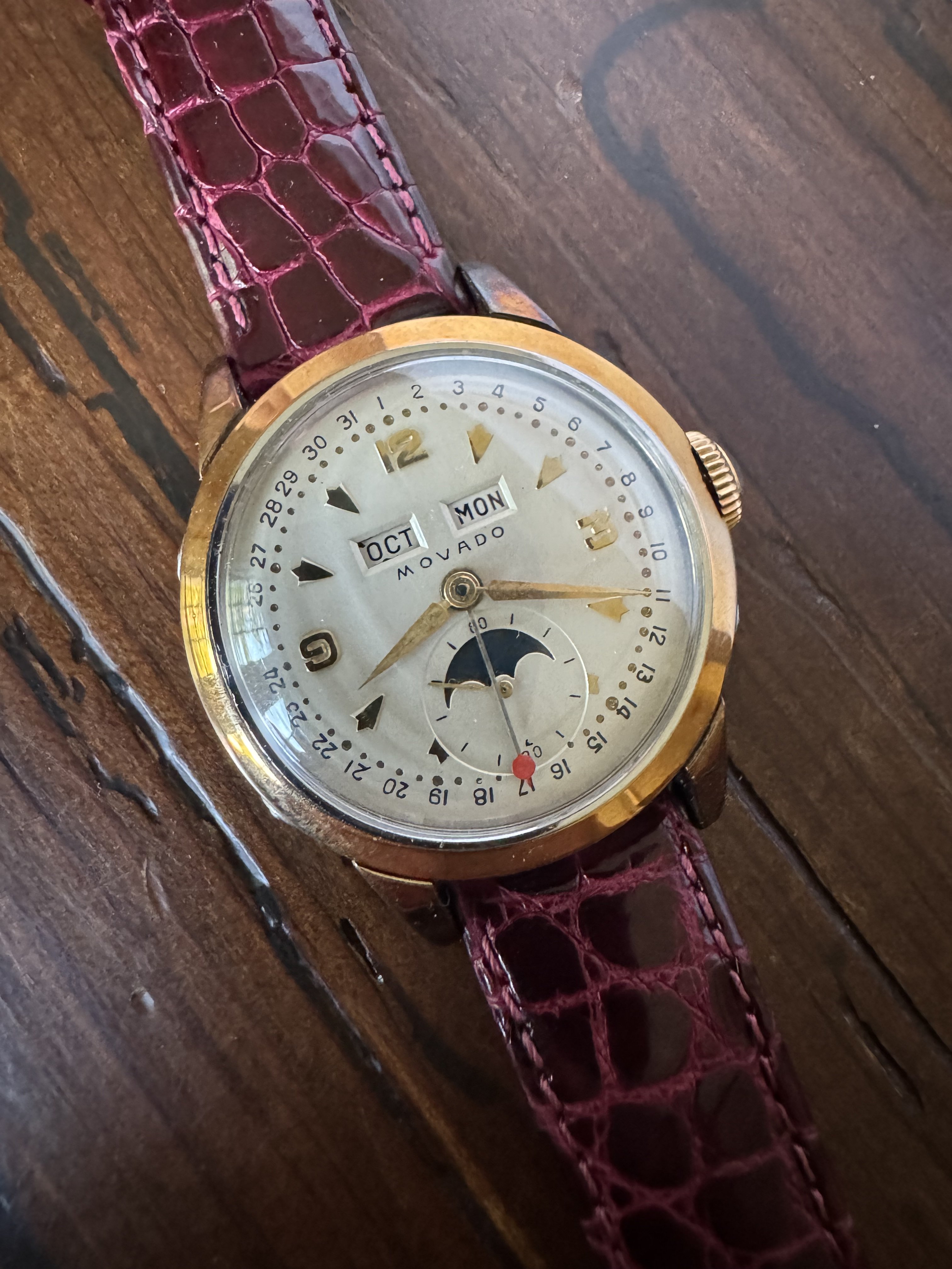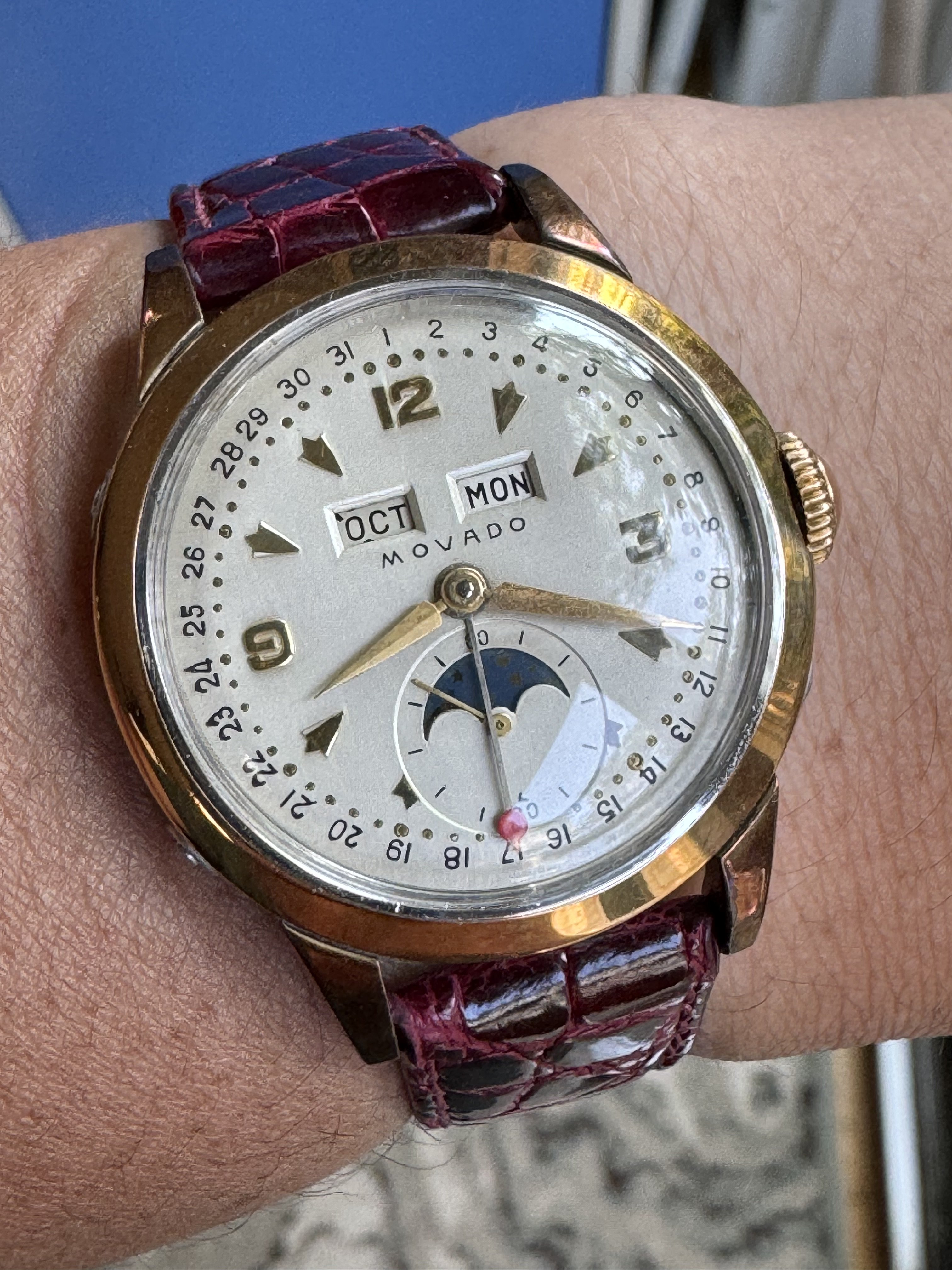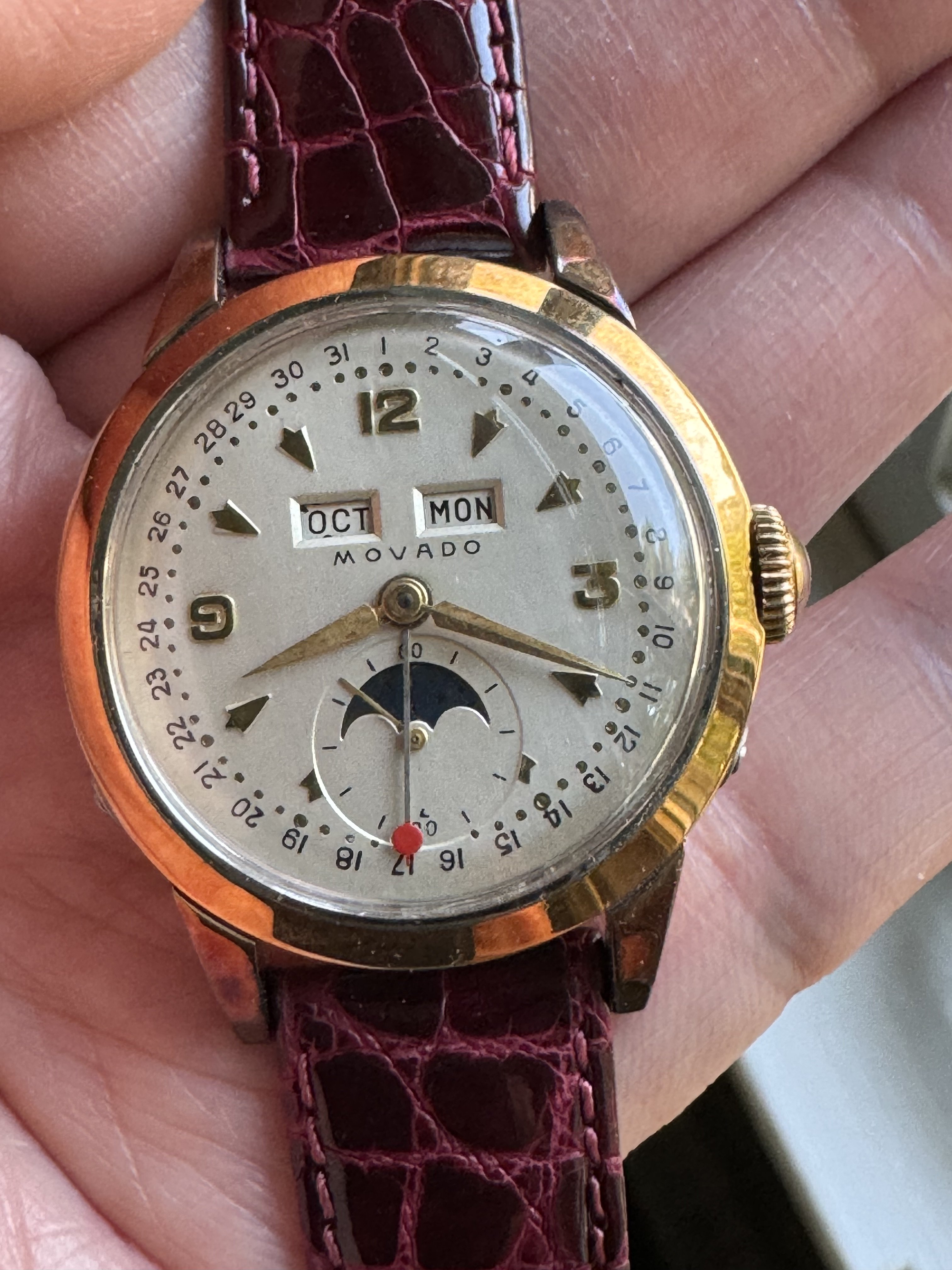 Here we have a Movado triple calendar moonphase AKA the Celestograf or the Astrograf. All the pushers are functioning well, the watch is running strong, has not been tested for accuracy but I have not noted any major variations while wearing it. I would say it keeps good vintage time.