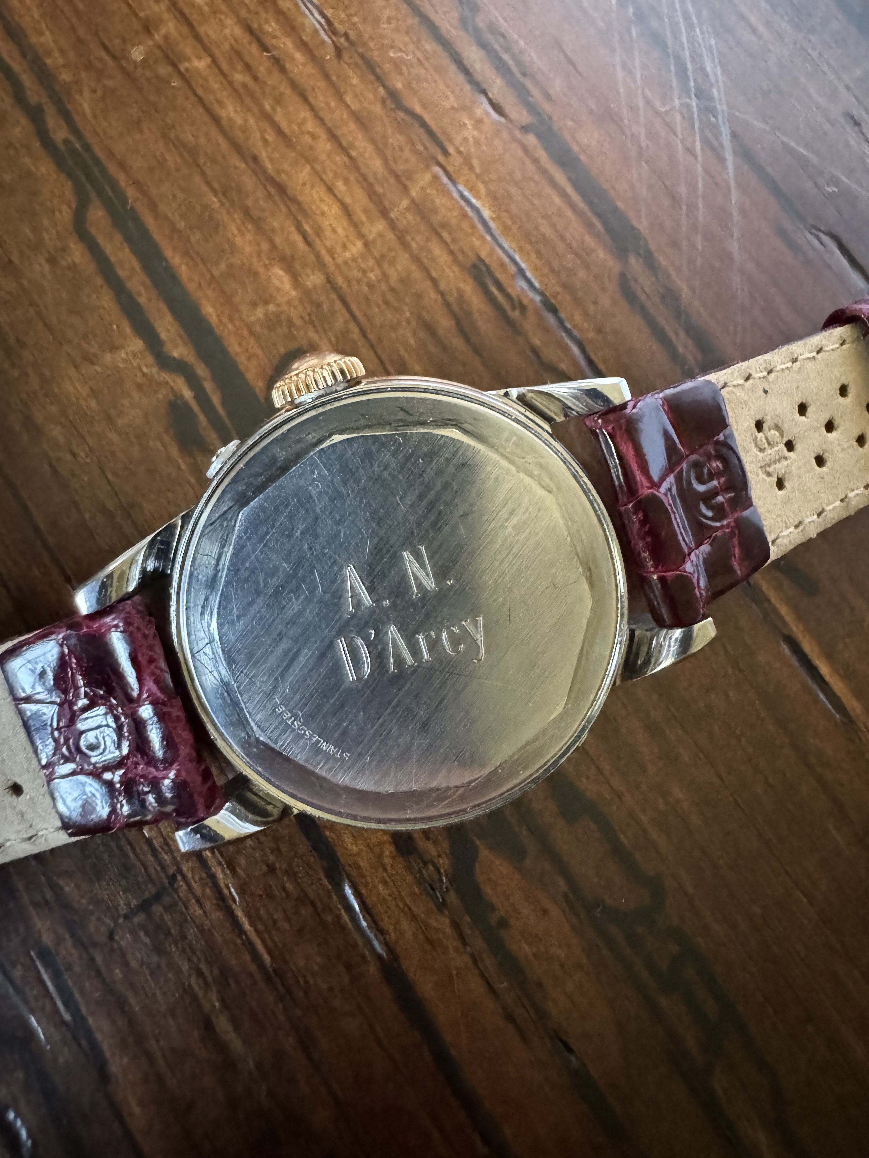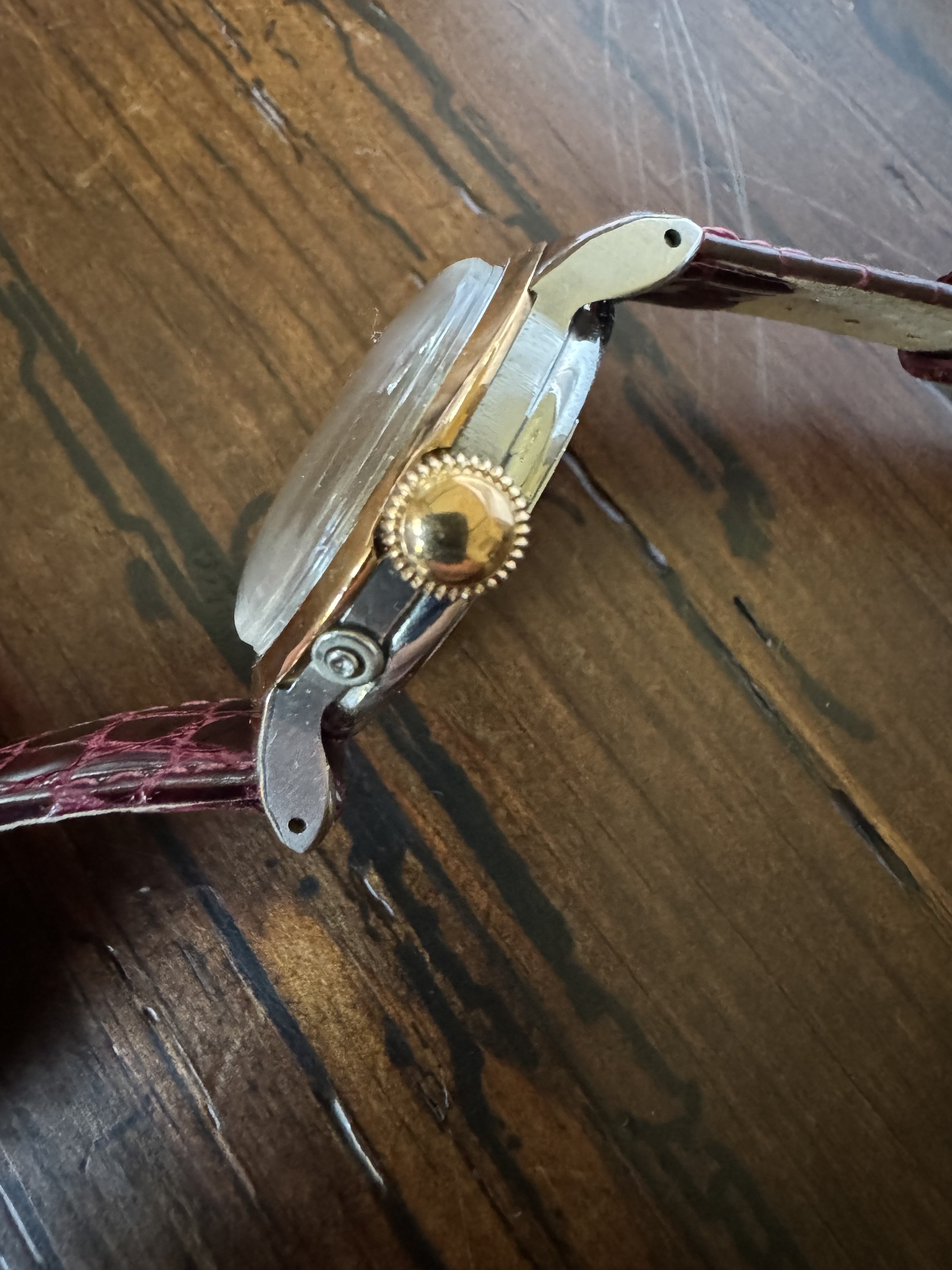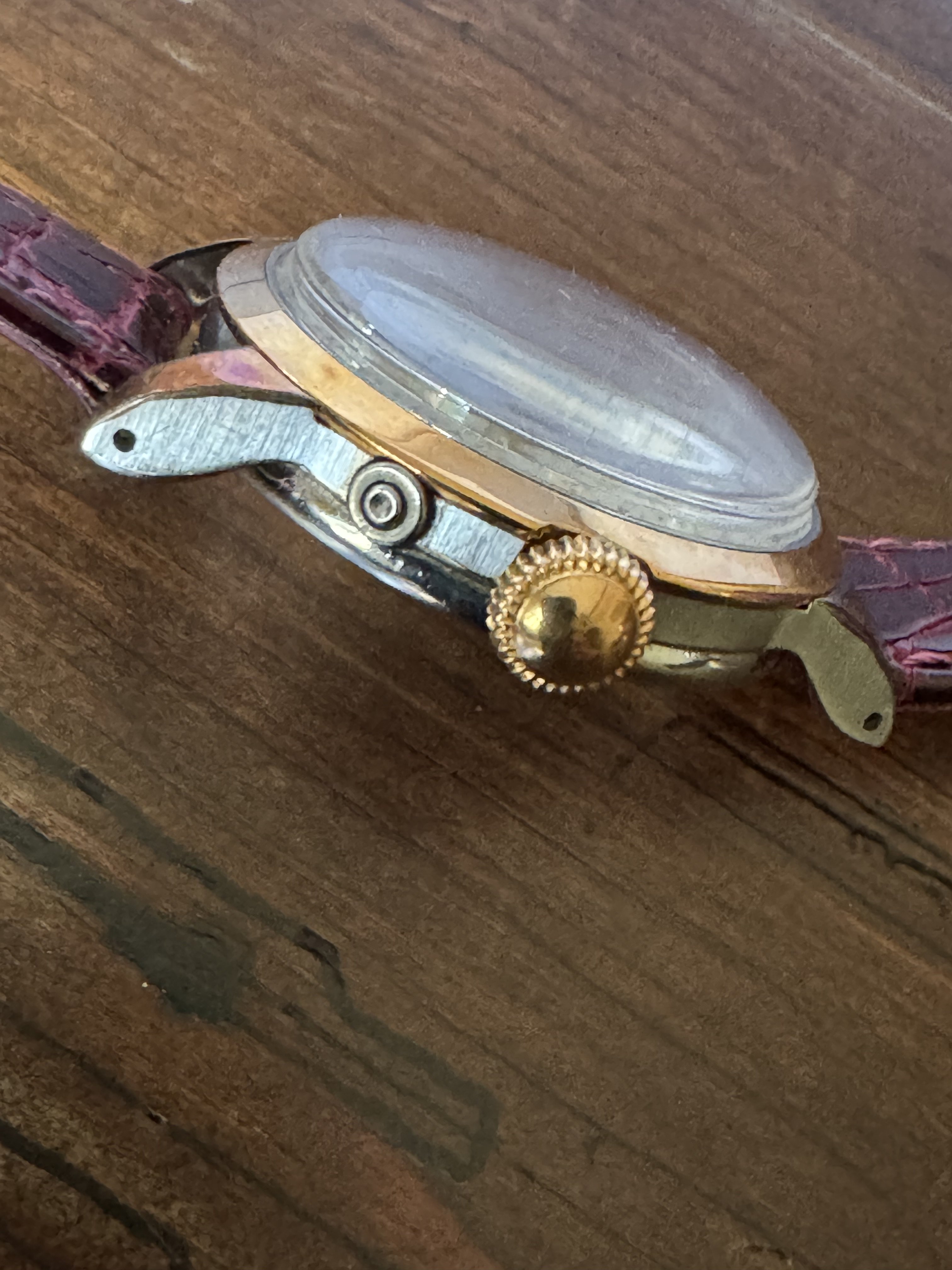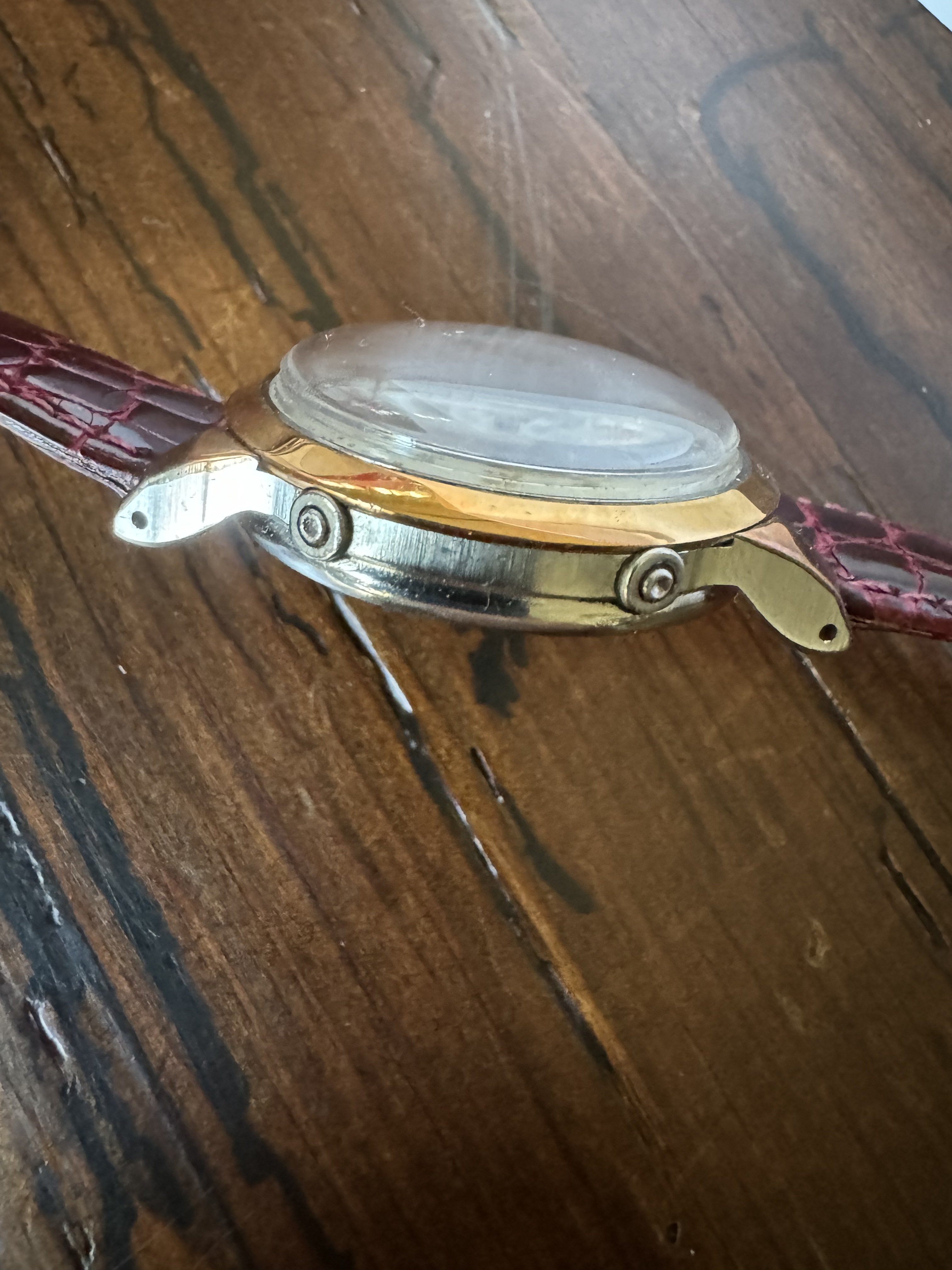 Case: Rose gold top, a thick layer of gold over the steel base. I believe it to be the original crown. It had a screwdown caseback which is a big plus. It does have a personalized engraving on the caseback. One downside of this watch is the small size. It measures about 33 mm diameter (maybe slightly under) and about 40 mm lug to lug. I provided caliper photos, please inspect them. I am not an expert but it looks unpolished to me, please judge for yourself by the photos.