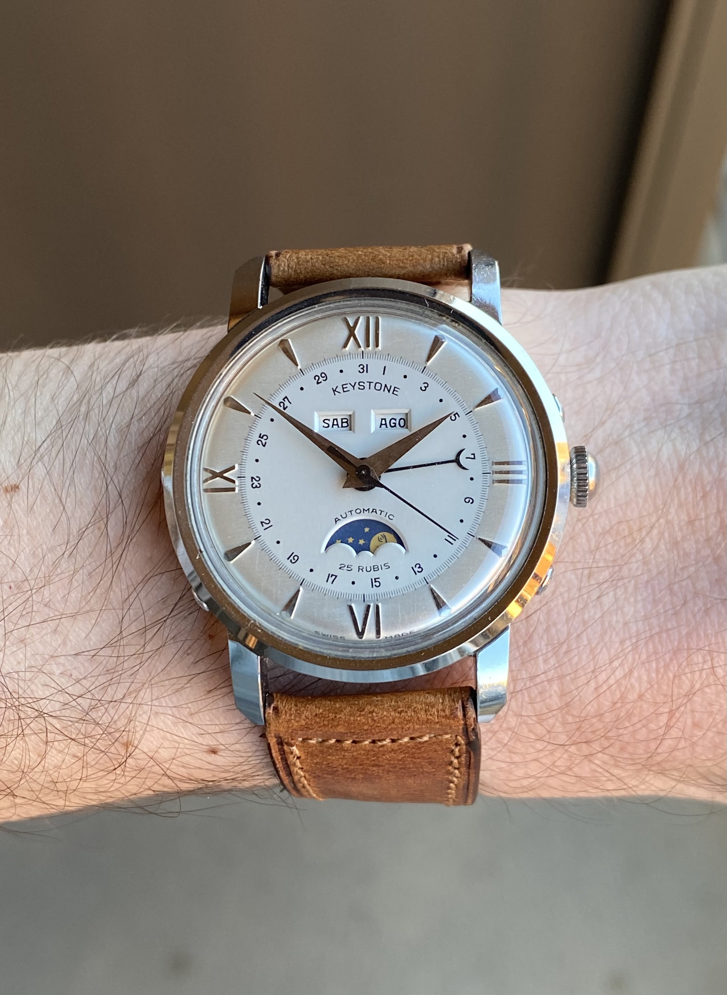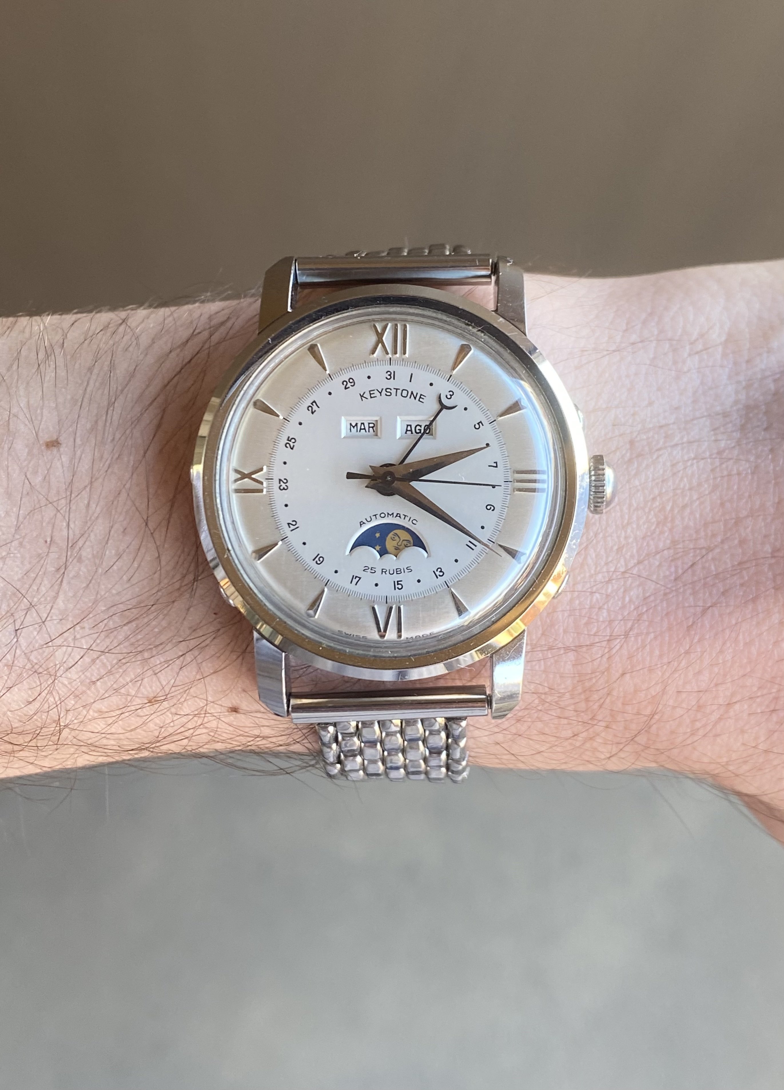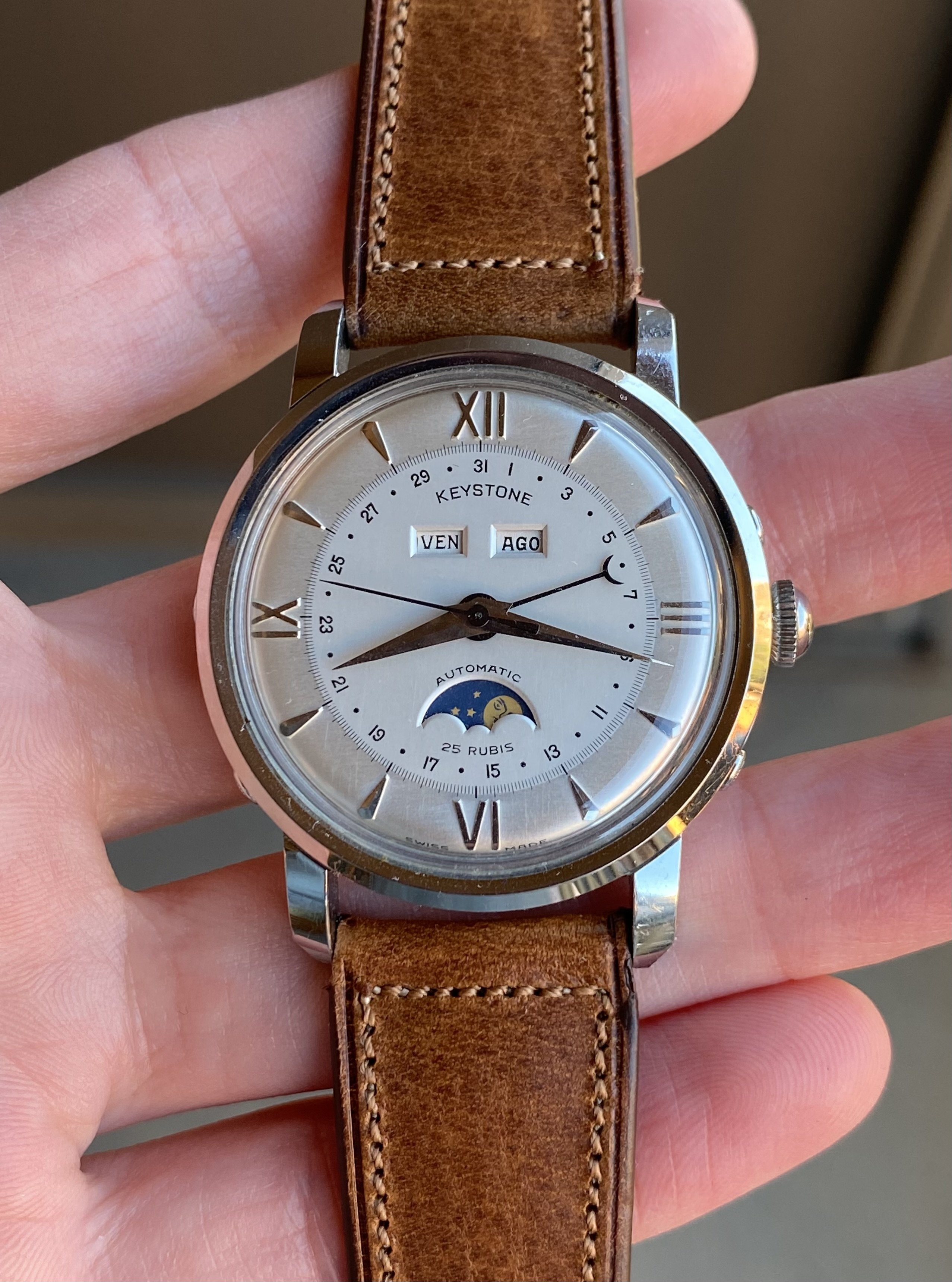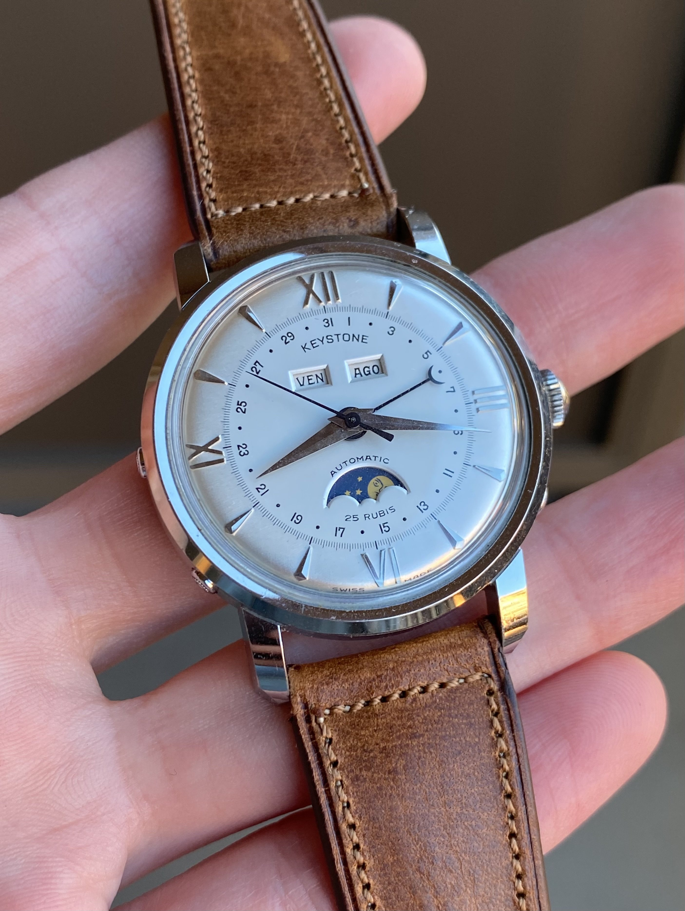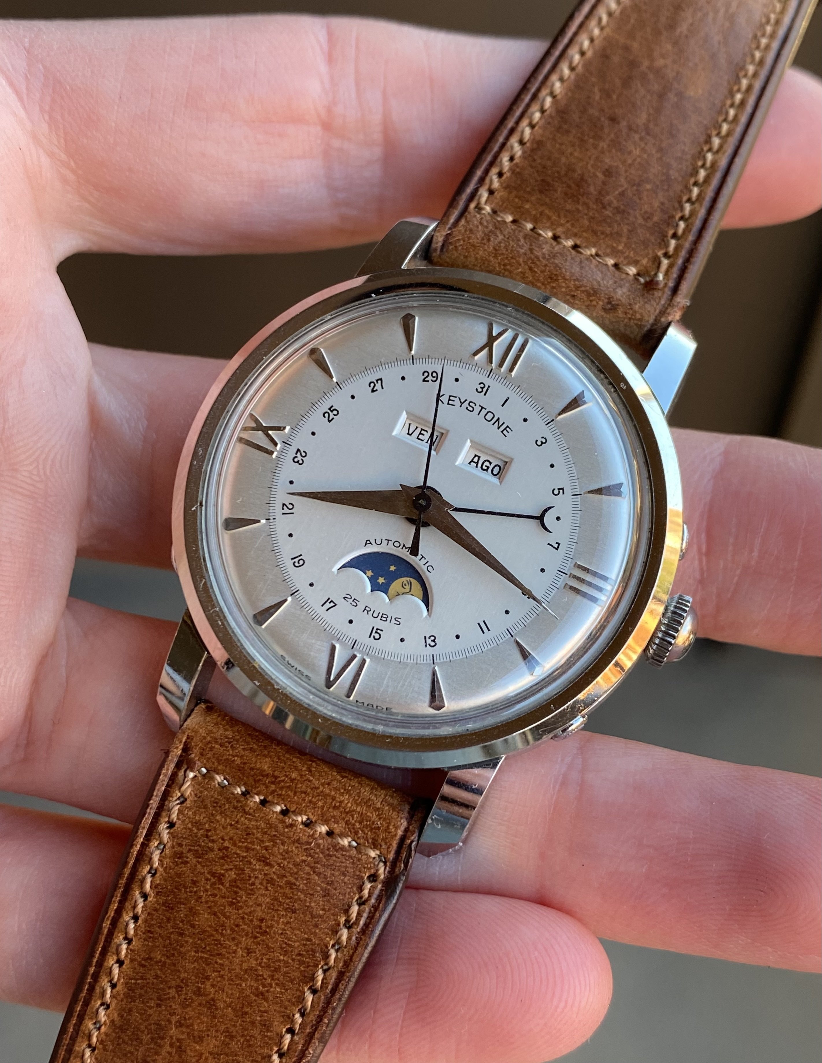 ·Up for sale is another superb near-new old stock vintage timepiece. This one’s a 37.5mm steel Keystone triple date moonphase with a Bidynator automatic movement. It’s in almost perfect, untouched condition. See below for full info, and don’t hesitate to message me with questions.