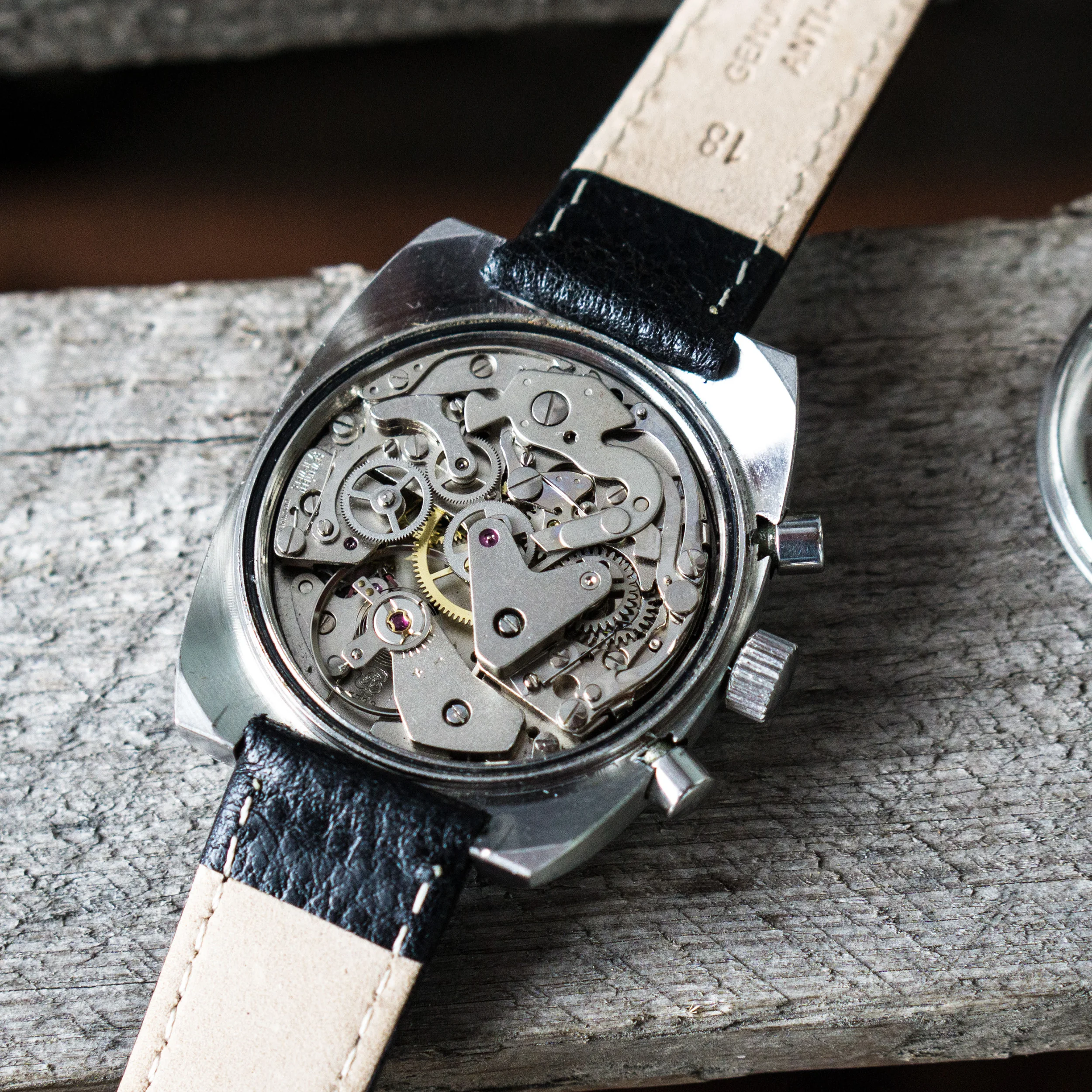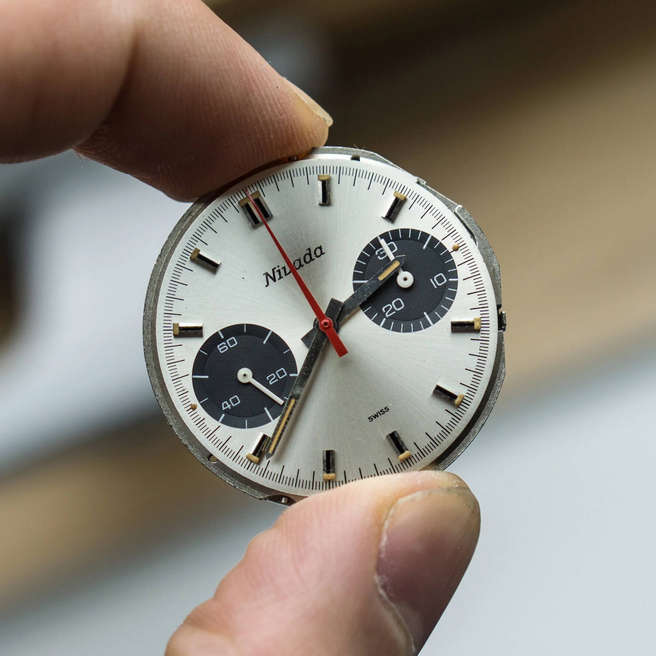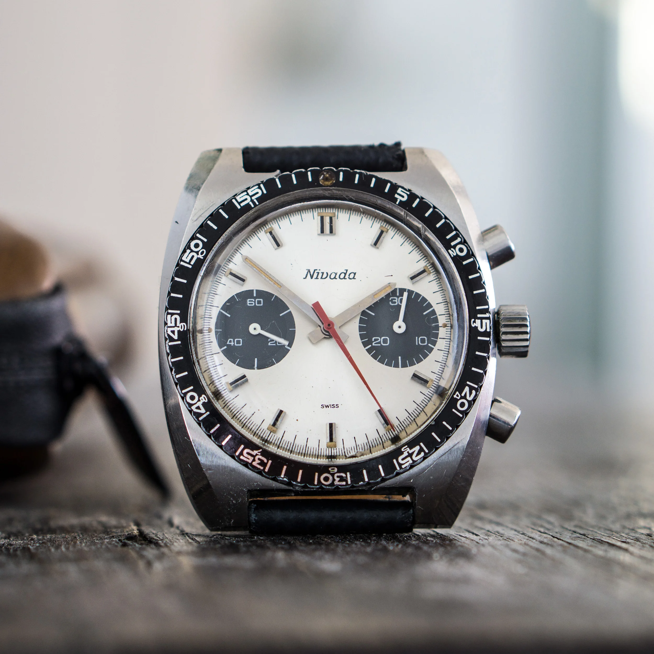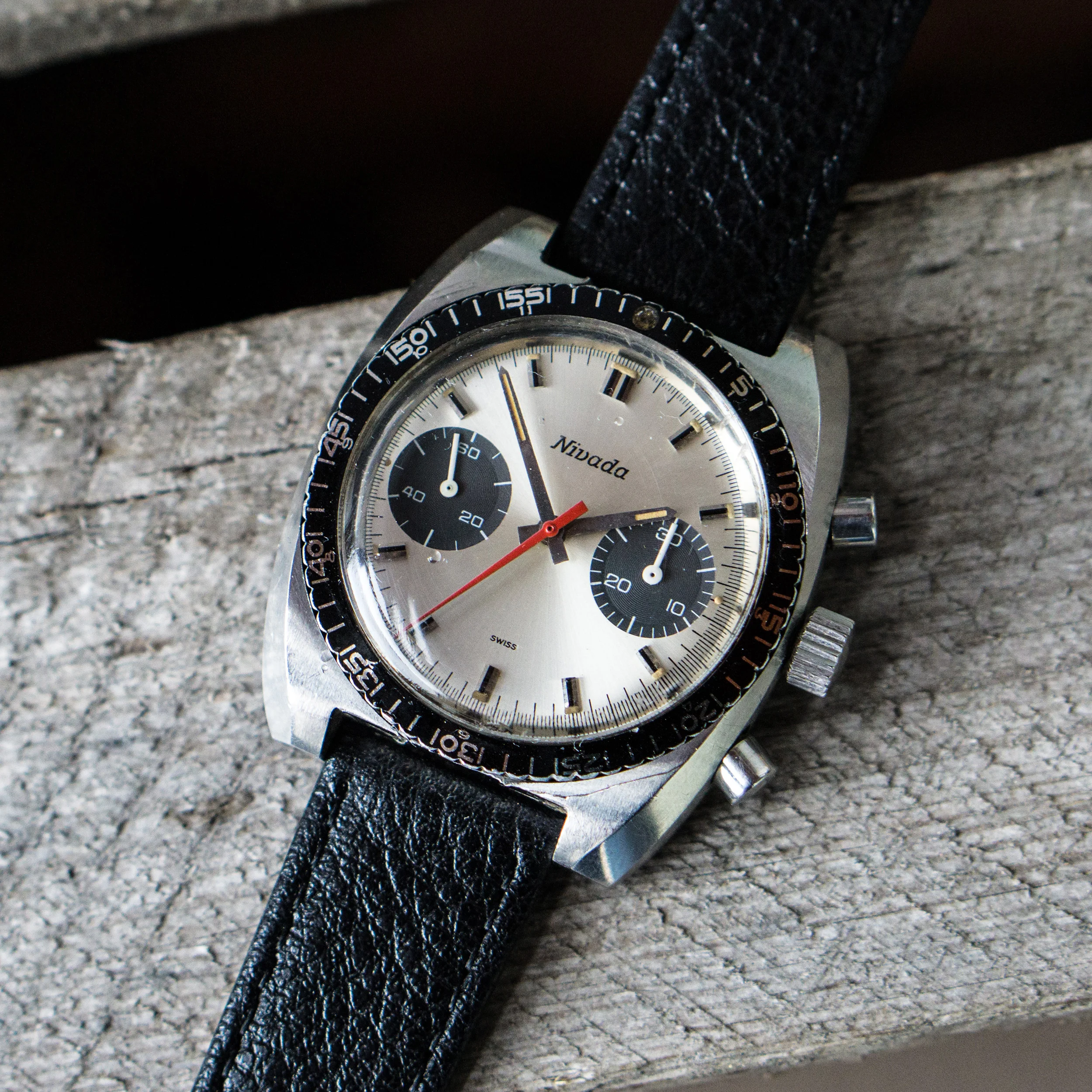 to fund something new, I am selling this obscurity. Its a Nivada with wonderful panda dial and 37,5mm stainless steel case, that houses a Valjoux 7733. Obscure, cause until today there is just one watch of this kind known. It uses the later known Nivada Chronosport case and an interesting dial, that is the same as for the panda Heuer Carrera 73353, just with the Nivada lettering. It also uses the same hands, that we find on Heuer Chronographs. The dial itself was unknown as was the whole watch. I had some interesting conversations with Nivada guys, who are pointing that it was a potential prototype or design patent. I bought the watch from Switzerland
