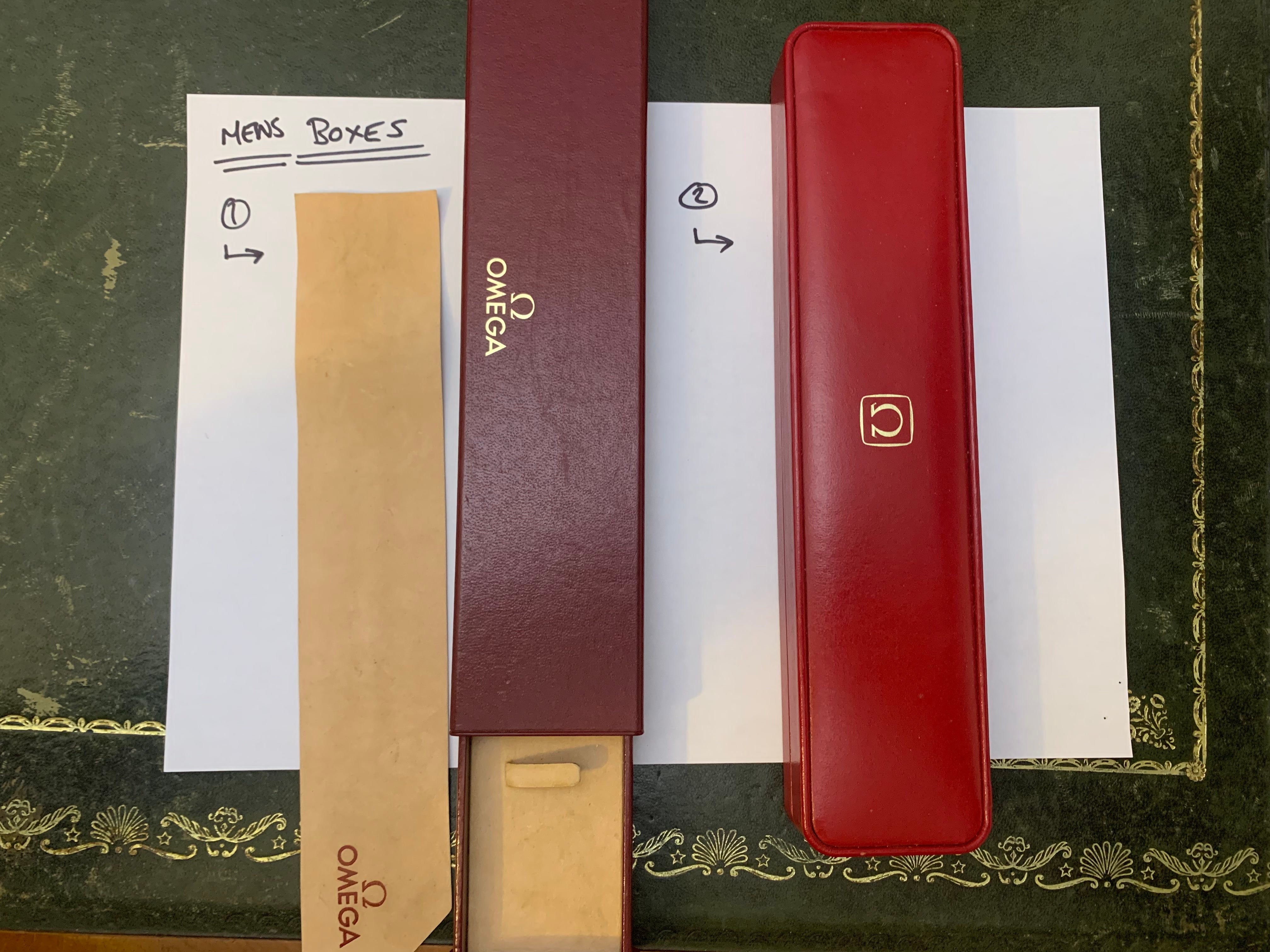 2. Circa 1960s-1980s Omega hinged box, made of leatherette outer and red velvet and satin lining, Fantastic condition: £100