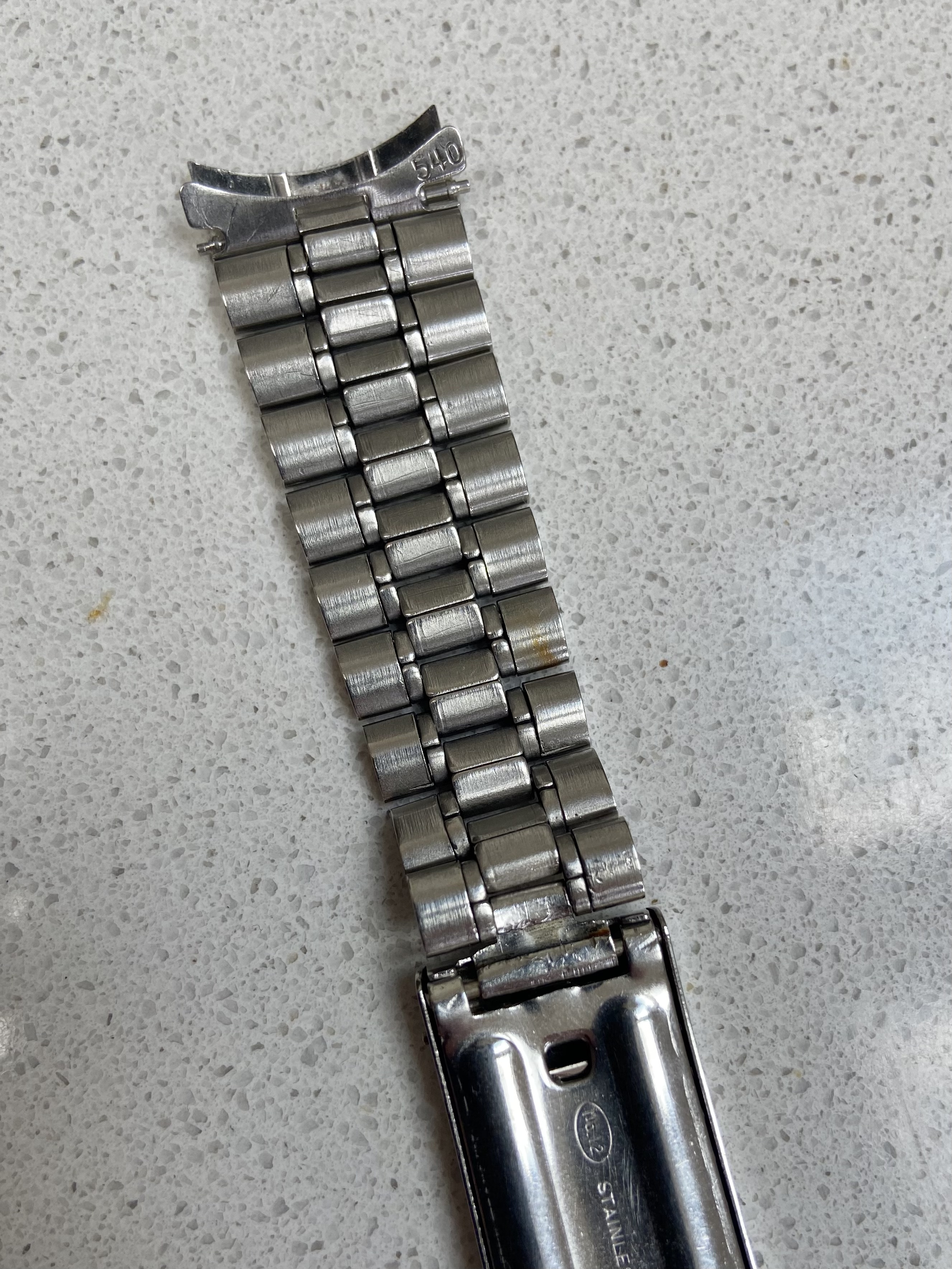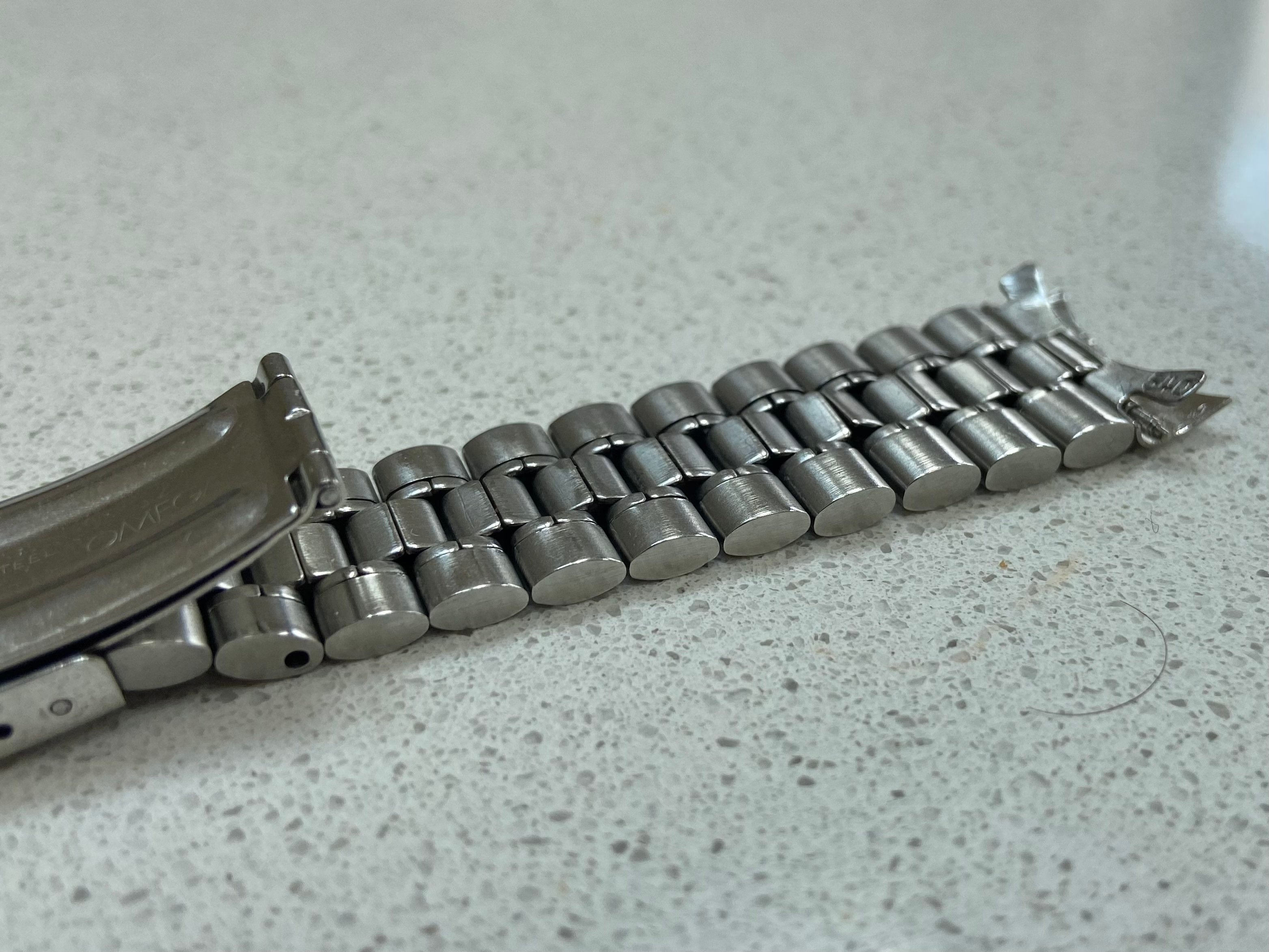 This bracelet is in good overall condition with average stretch. All the links are good with the exception of the link that attaches one side of the bracelet to the clasp. This is stretched (see pics), however, it’s still completely functional and I’ve worn this bracelet in rotation for several months without issue. Nevertheless, price adjusted accordingly.