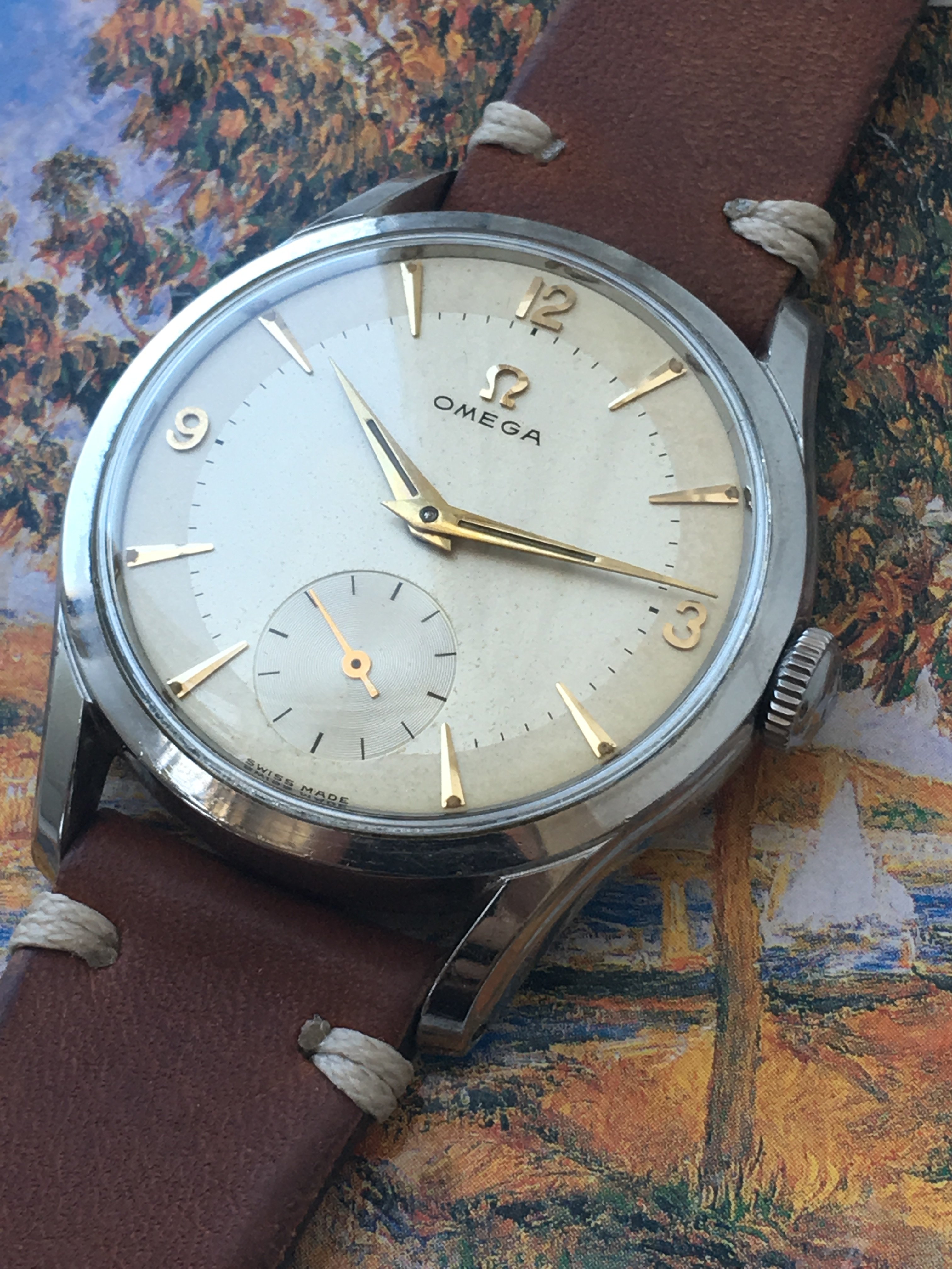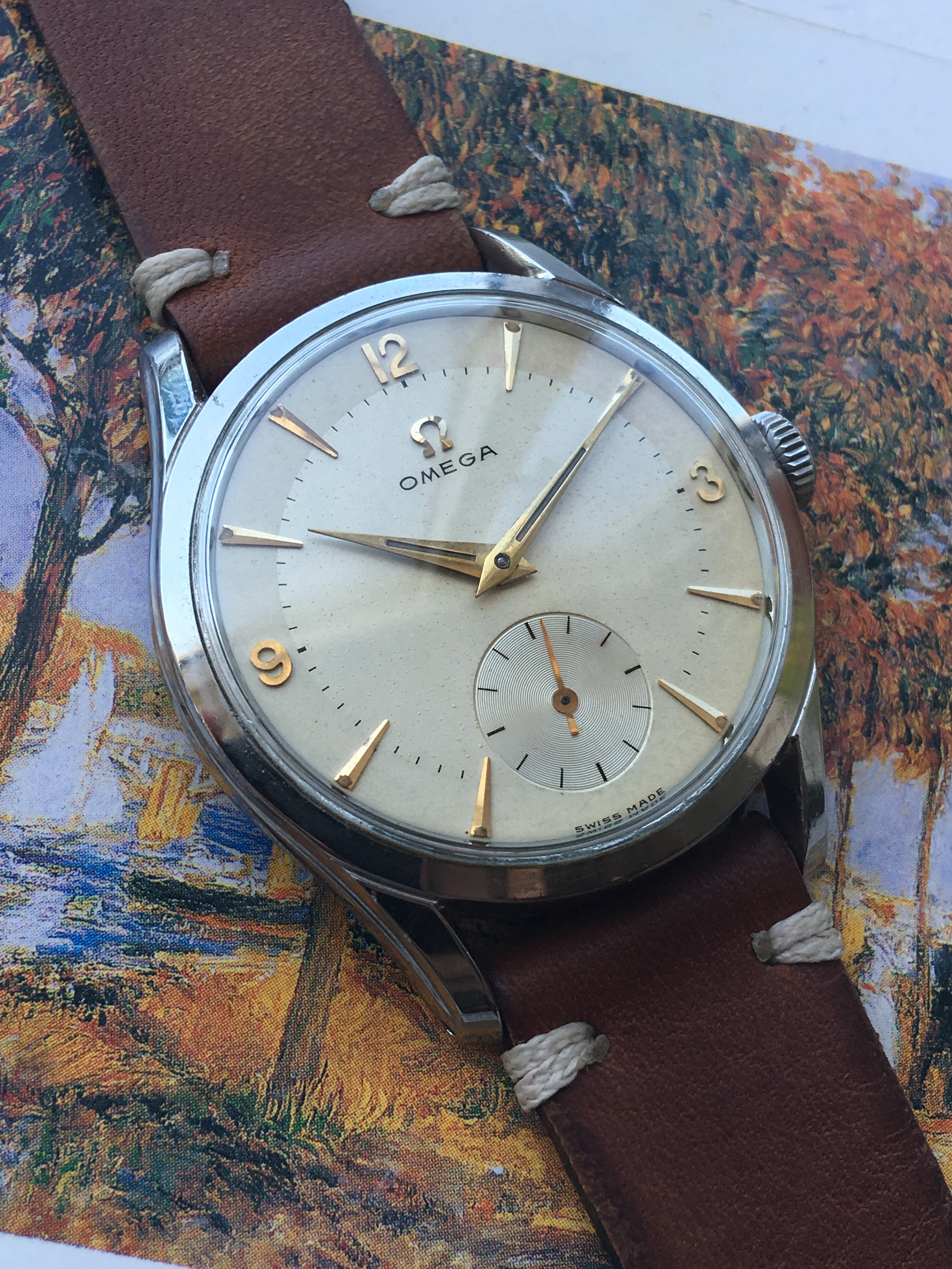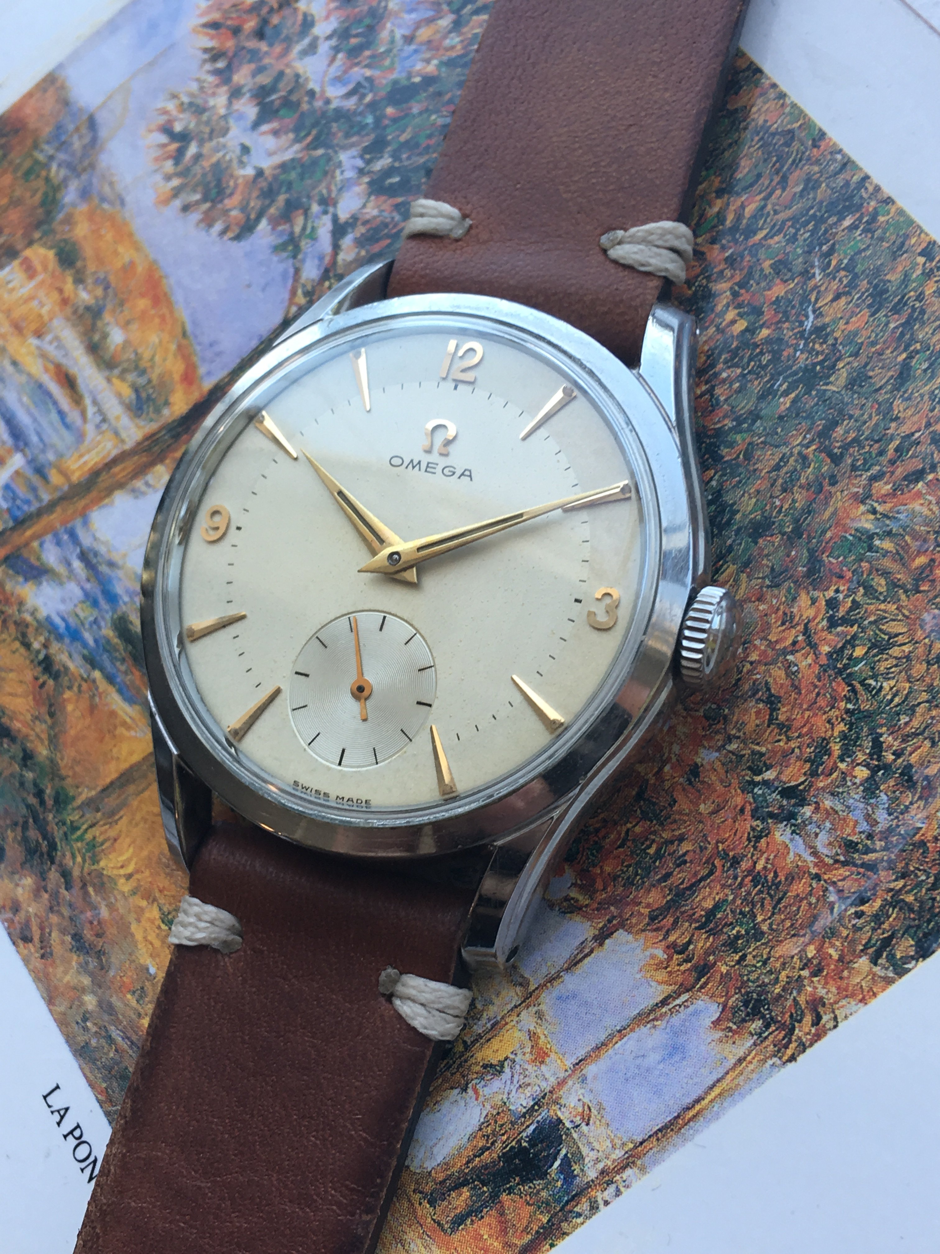 For sale is a beautiful manuel-wind Omega cal. 265 from 1952 with a wonderful and very well preserved two-tone dial.