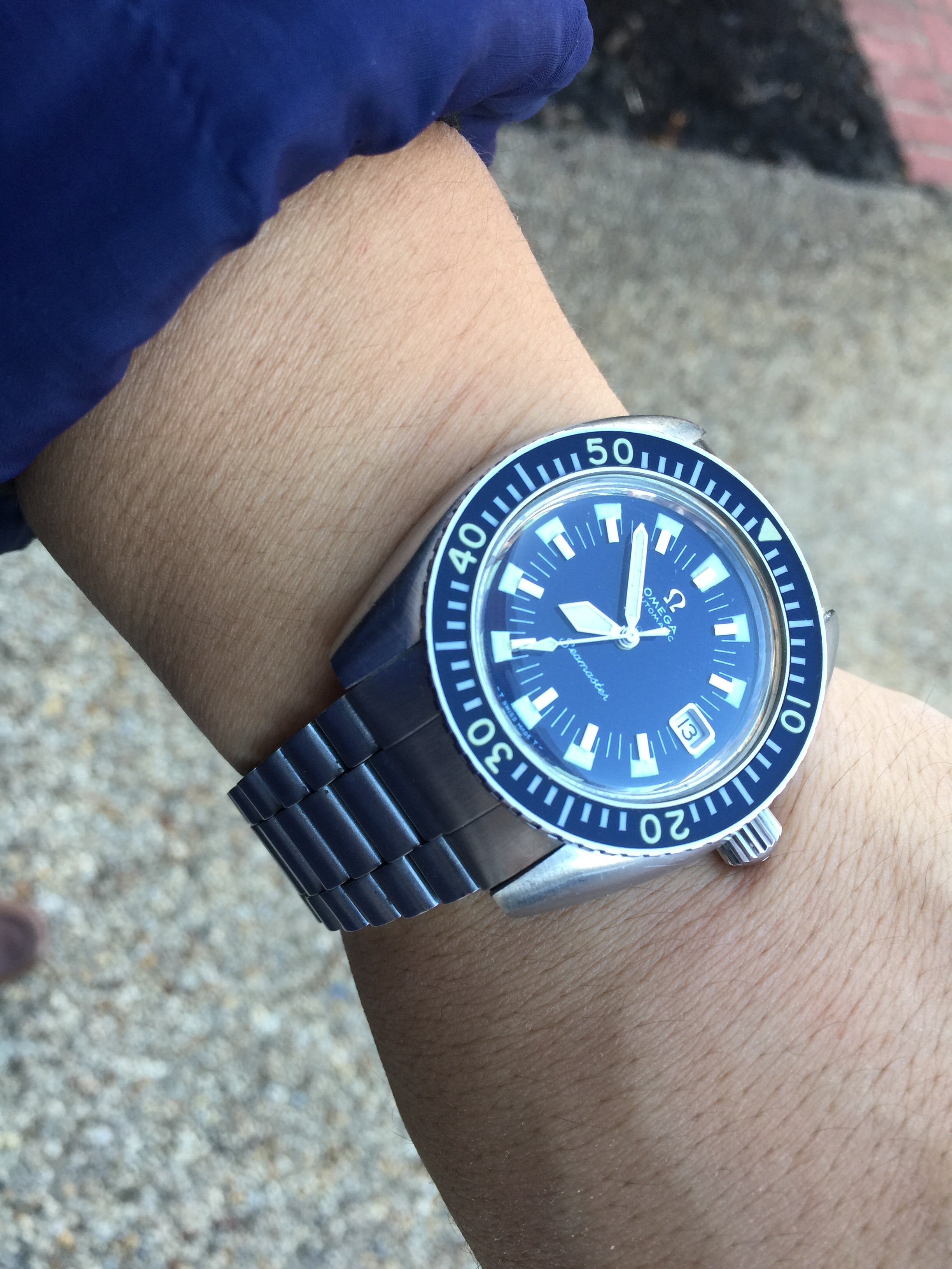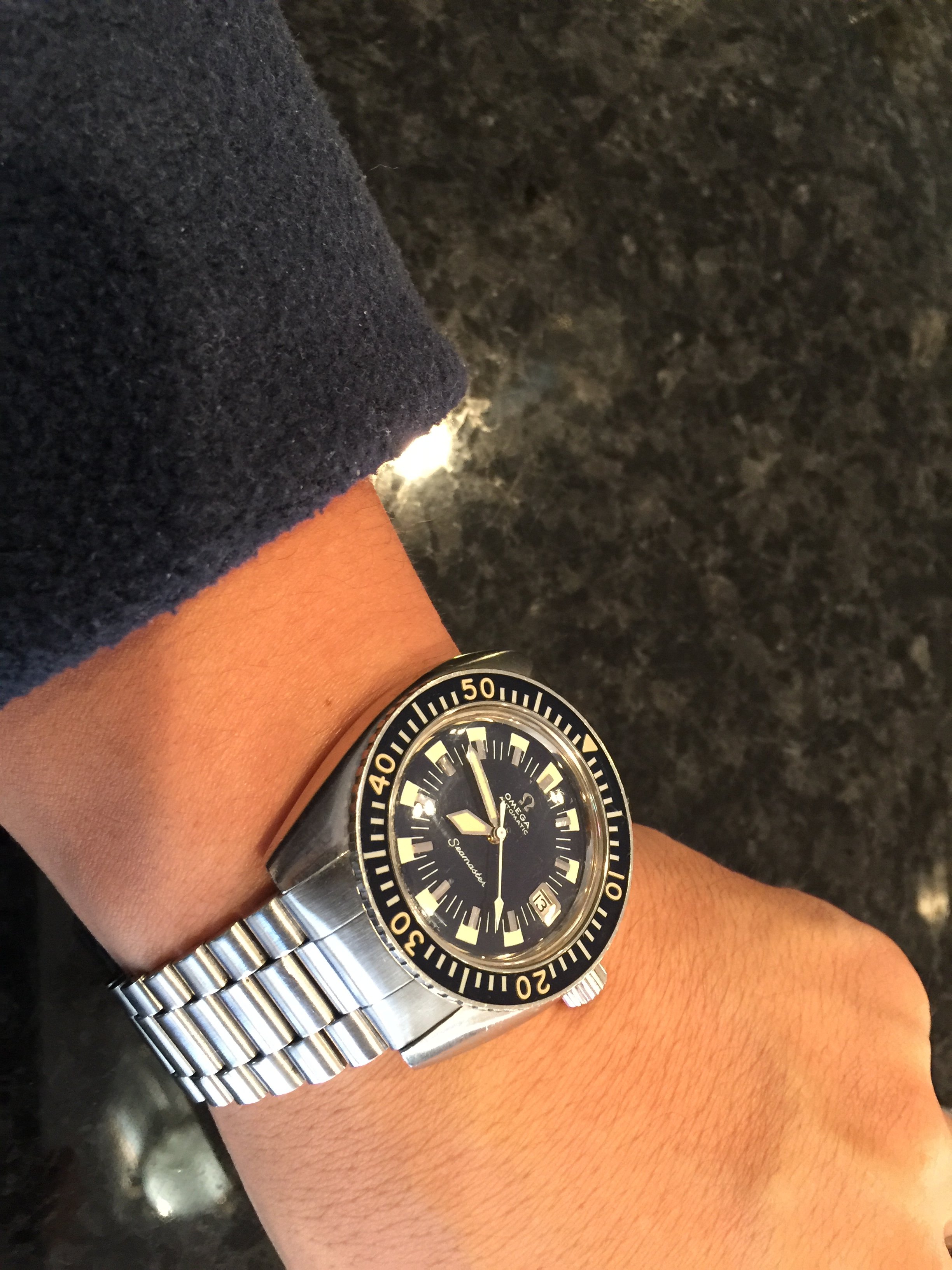 I have a sub-7" wrist so large watches are out and modern divers tend to be a problem in that category. I prefer vintage watches in every way but vintage divers are tough to find in good condition and the fakes are rampant. I seem to gravitate towards watches that are 35-38 mm's so this Omega is perfect.