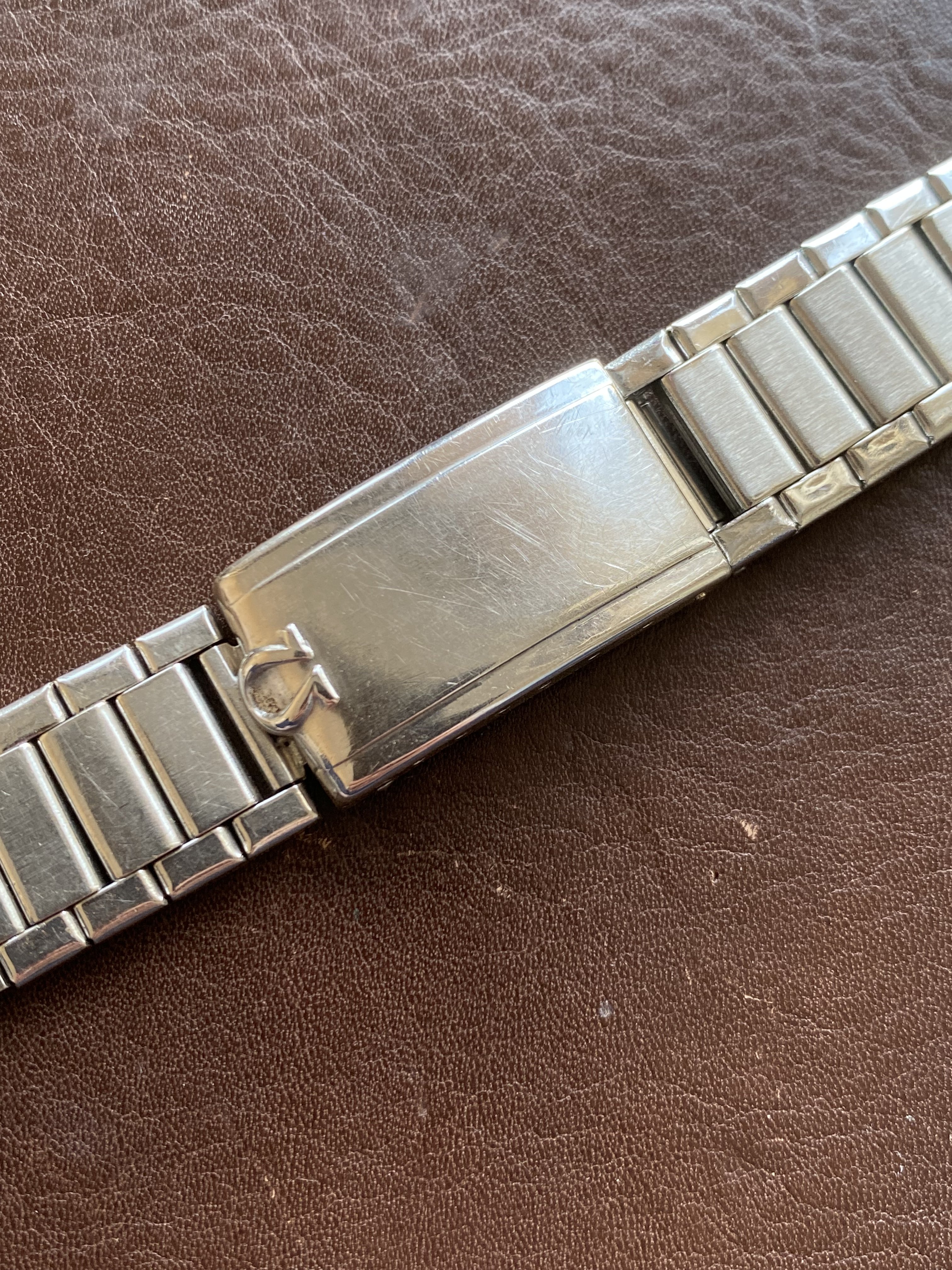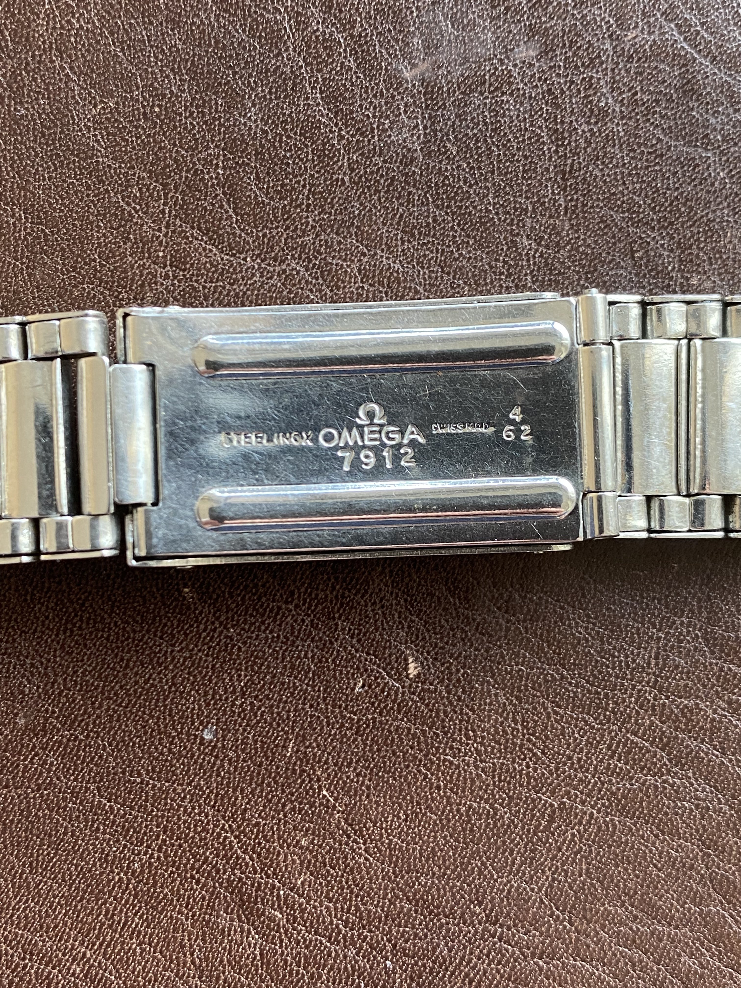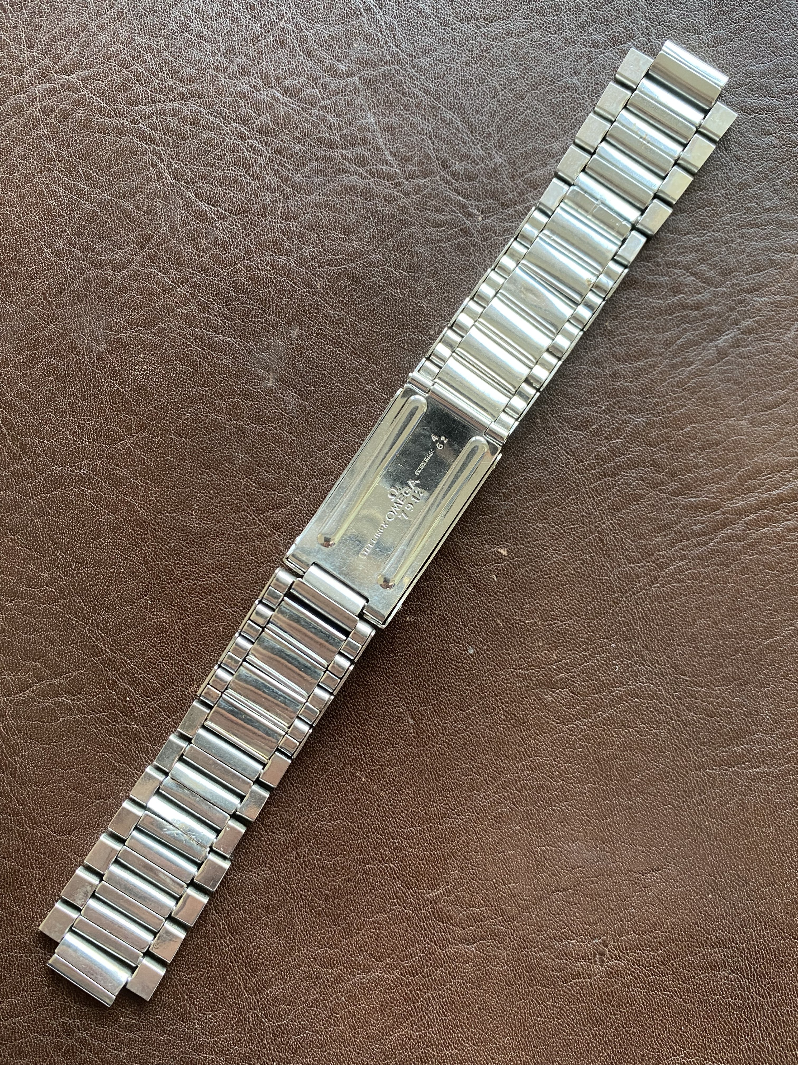 Fits early Speedmasters, Seamaster 300s, and other references from the early 60s (with the appropriate endlinks, see this chart for more info). Bracelet is in decent, unpolished condition. Comes with 10 stretch links, all of which are fully functional (I recently replaced the springs on four of them). Length is a little under 15cm from springbar to springbar (unstretched). Bracelet clasp is dated to 4/62 (Q4 1962).