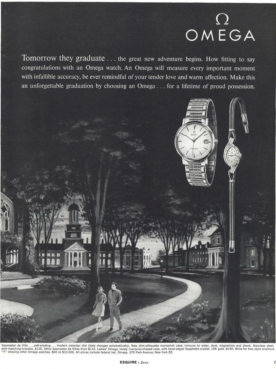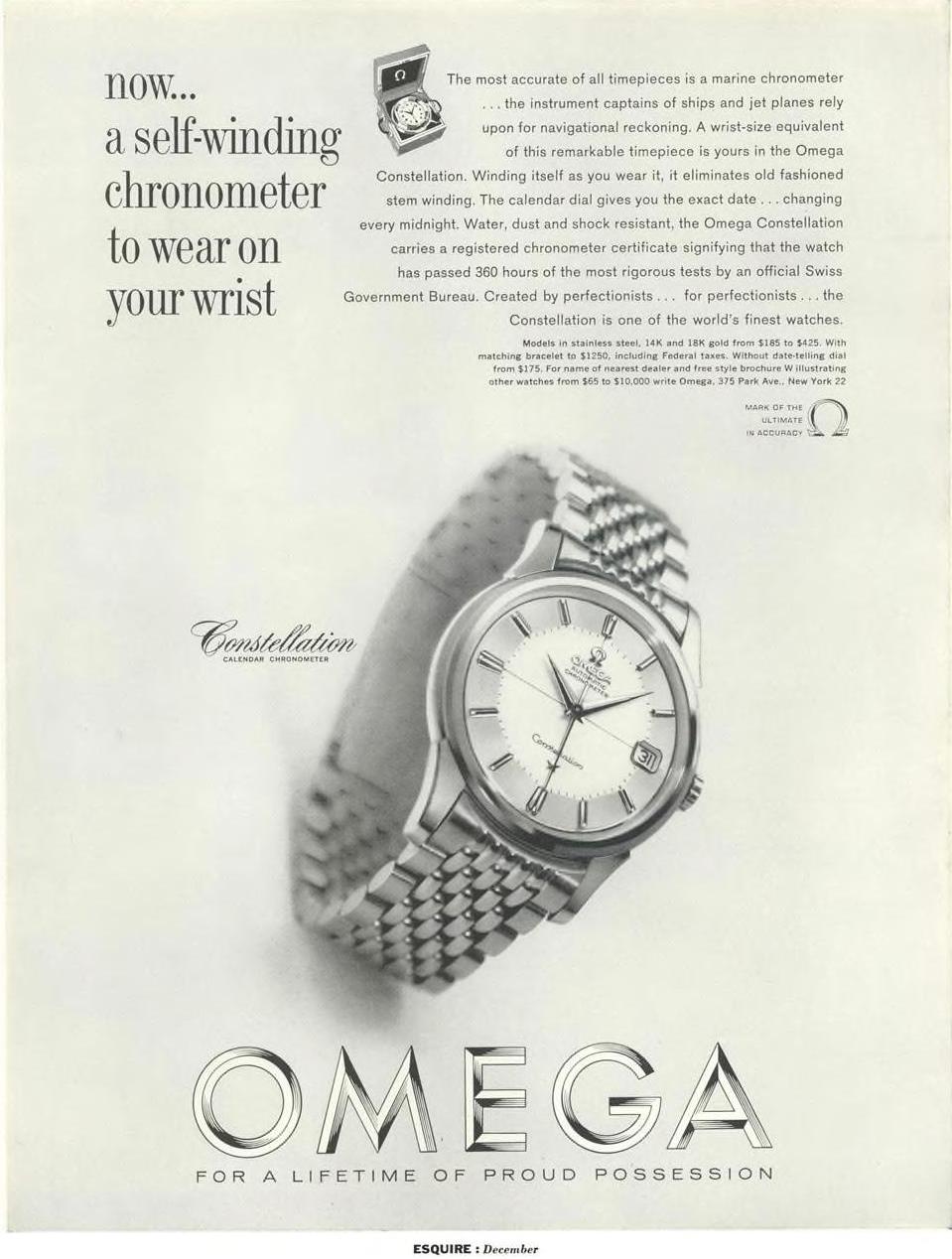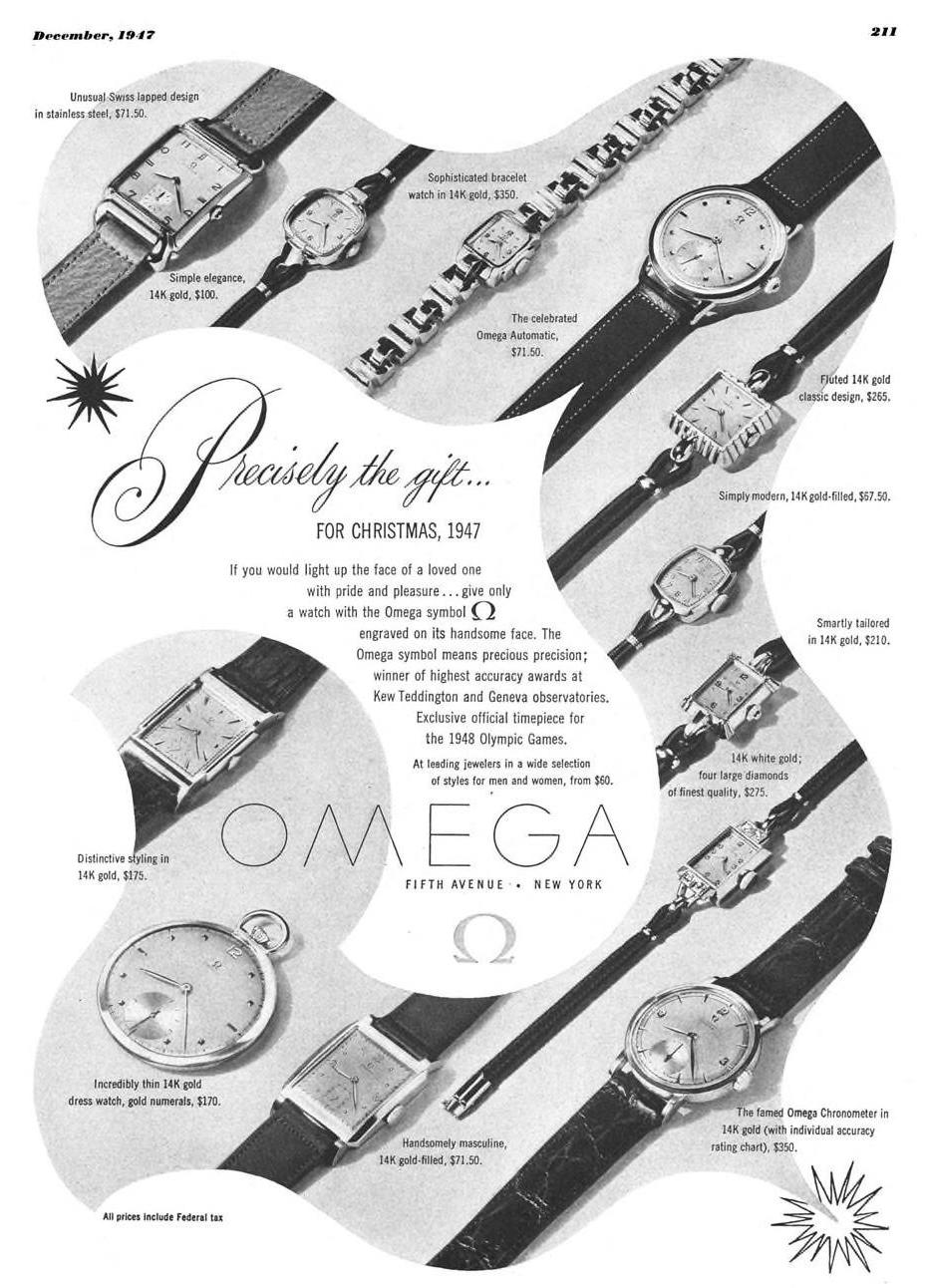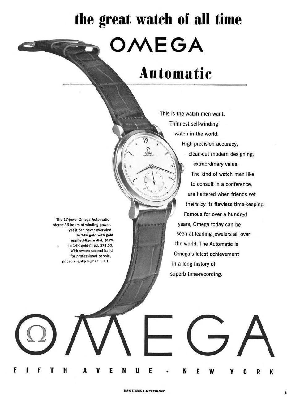 ·Back in the beginning of quarantine I amused myself by trawling the archives of Esquire magazine for watch ads. (The internet archive hosts a complete searchable run from 1934-2015). Esquire is an American men's magazine; it ran few watch ads in the 1930s, but from the mid-1940s there might be a dozen ads per issue - two dozen around Christmastime. Here's a peek into the ways Omega presented itself to the American market from 1946 to around 1970.