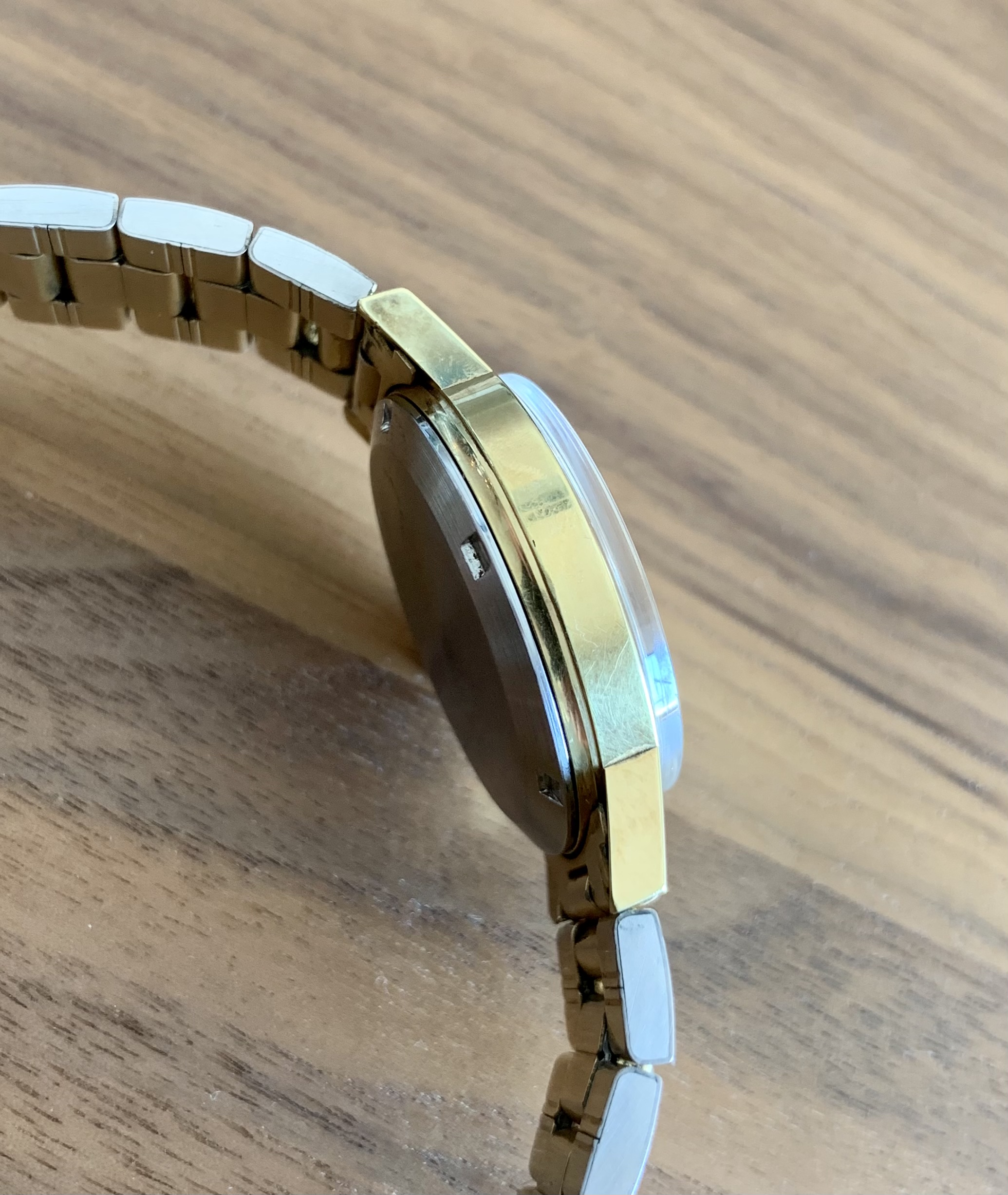 Gold plated case/bezel with stainless steel back. Very nicely size at approximately 35mm not including the crown. A bit more bulk to this reference than earlier models, giving this watch a more modern presence/feel on the wrist.