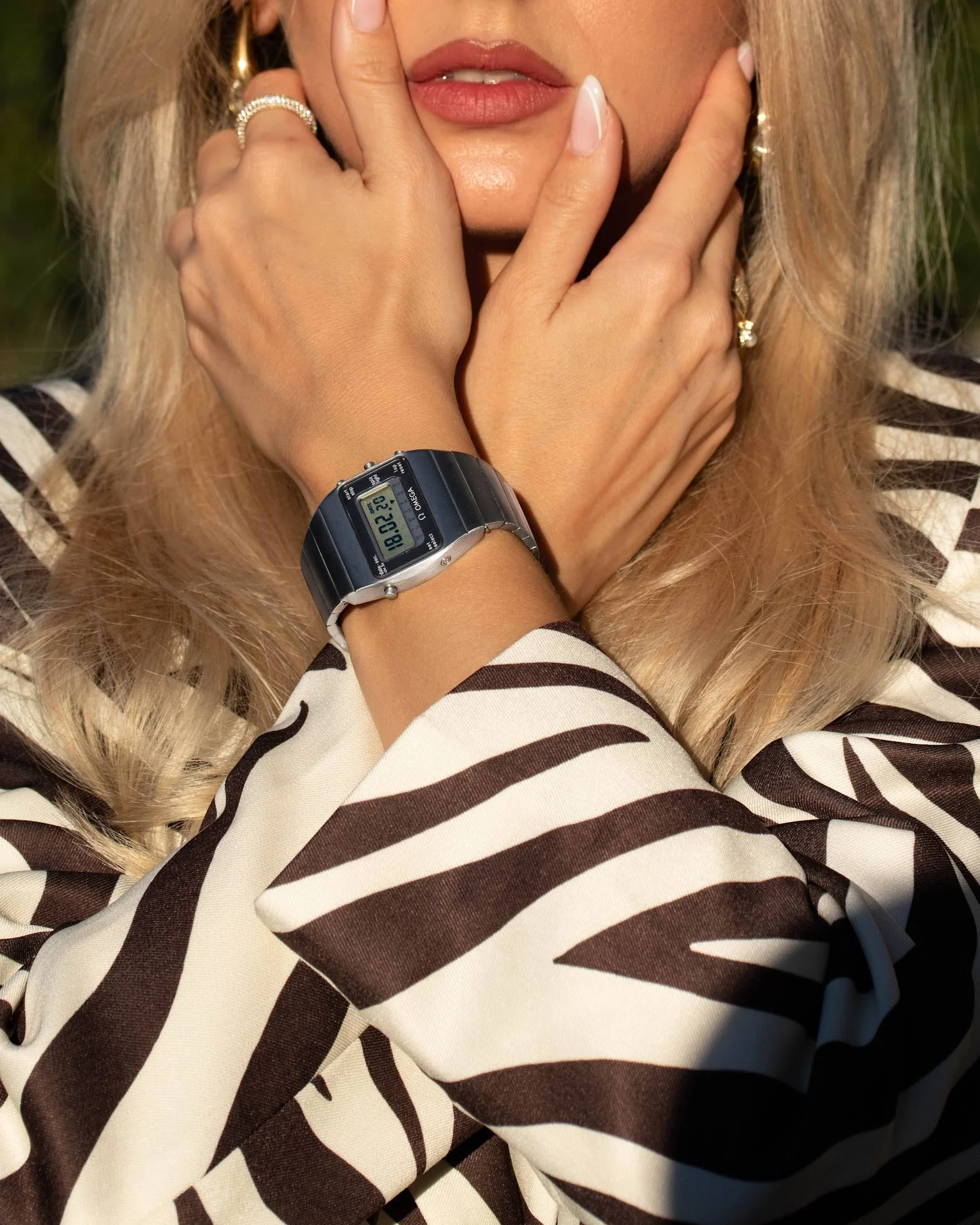 An integrated bracelet, LCD module (caliber 1620), and a multifunction chronograph with date and day of the week display. Very slim and elegantly designed, with a bracelet that looks and feels like a single piece of metal.