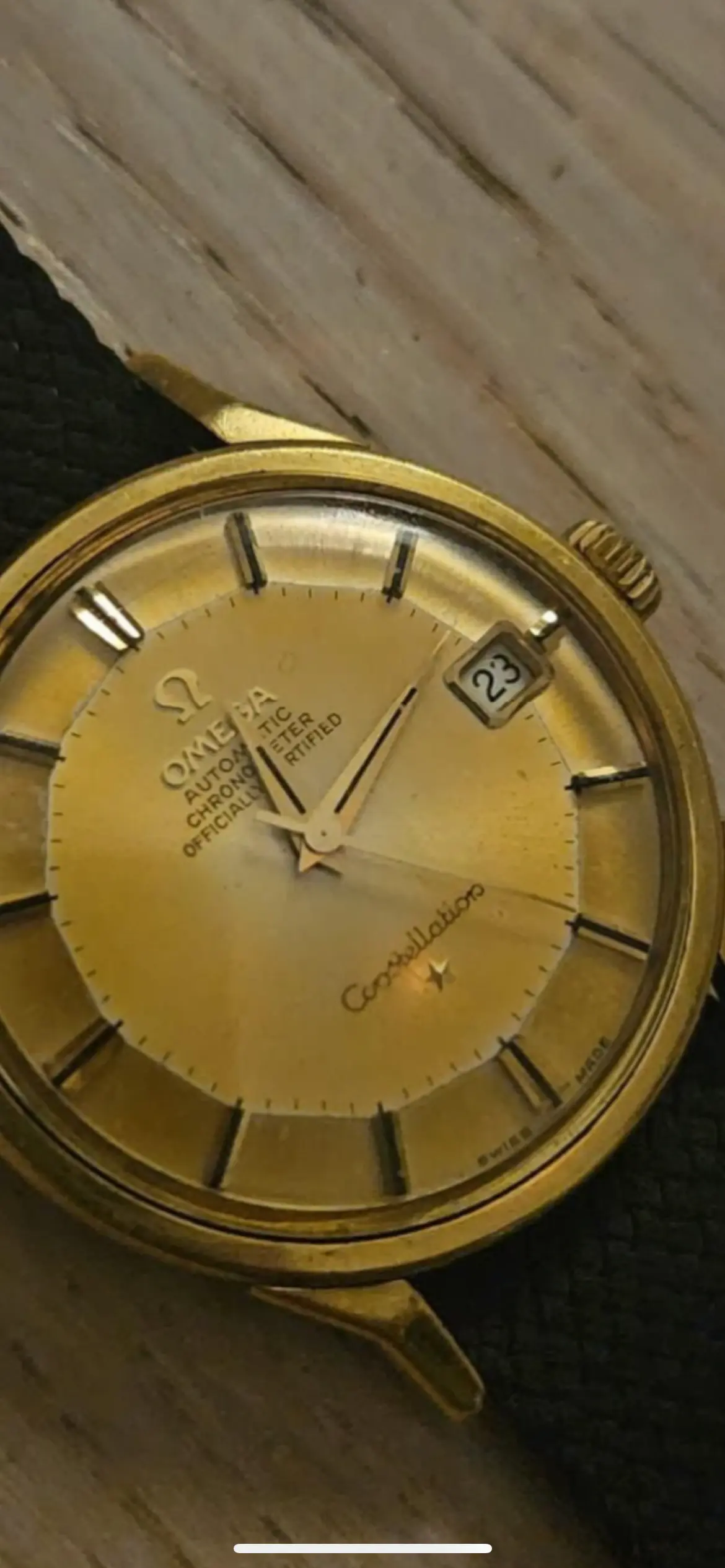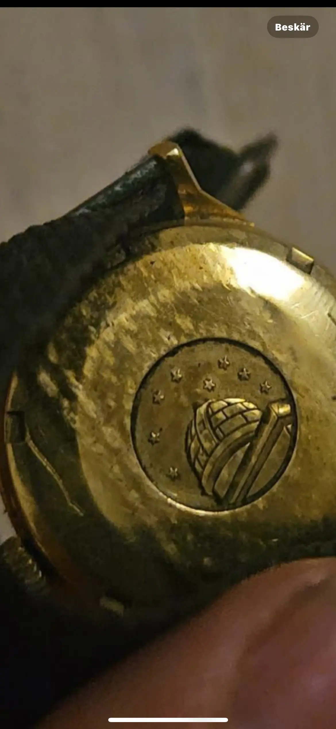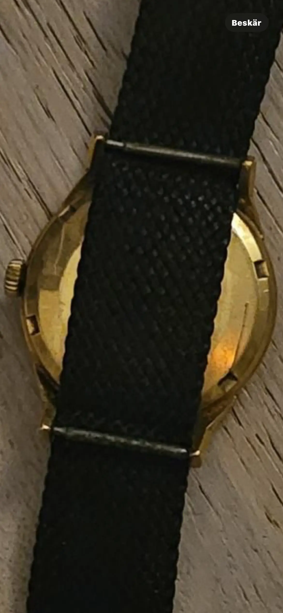 The condition, unfortunately, is very, very rough. Heavily polished, it’s lost its original shape. Dial is discolored. The spots / damage on the back is caused by that strap and is often referred to as „NATO“-burn. NATO is the common name for those straps and the material destroys the soft gold case back.