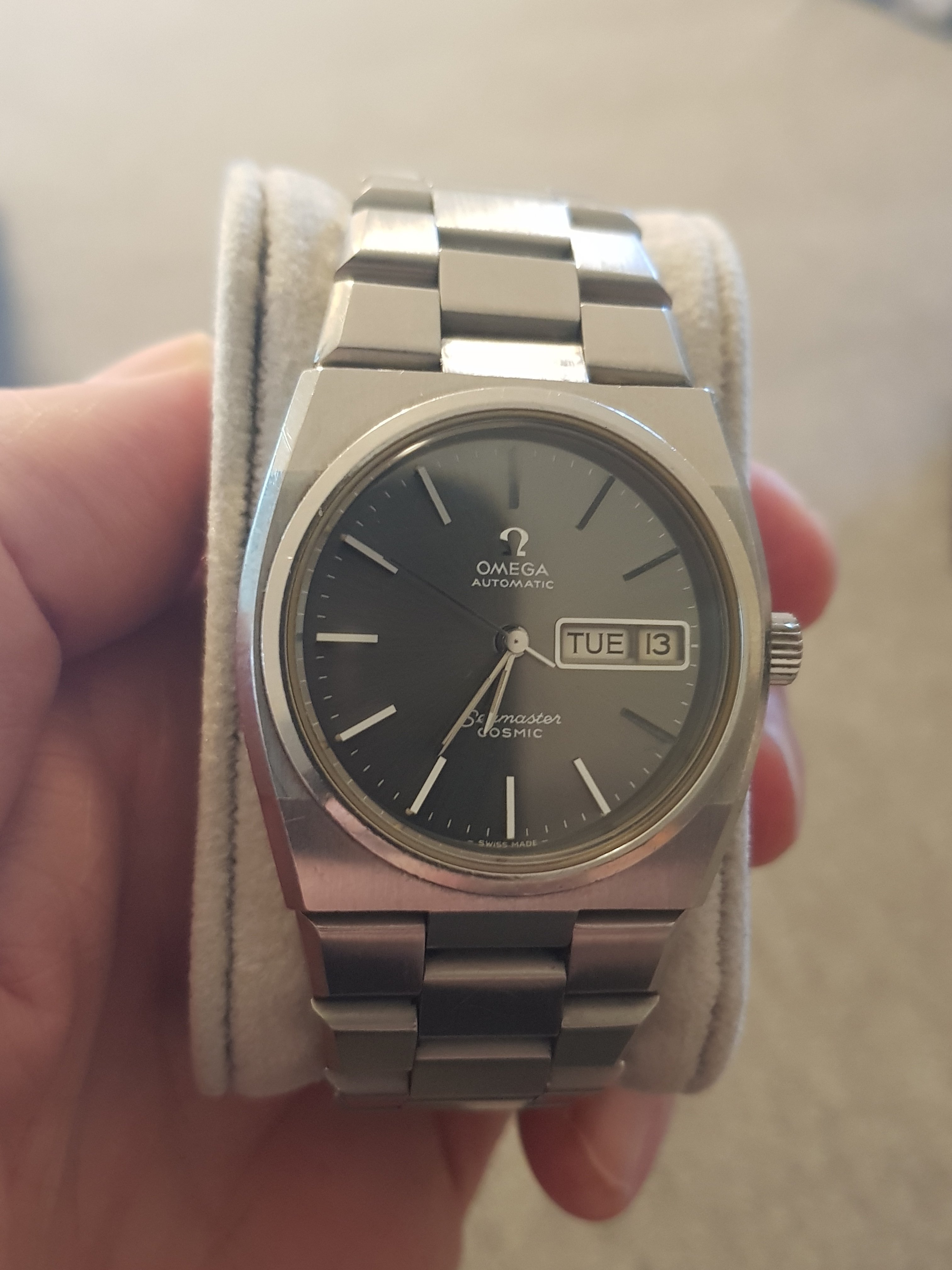 I recently purchased this Omega Seamaster Cosmic 166.0196 online. I like the size (36.5mm), grey sunburst dial, angular design and Chatelain bracelet. This watch also comes with a screw down crown - something which doesn't seem to be the case for all watches with this reference.