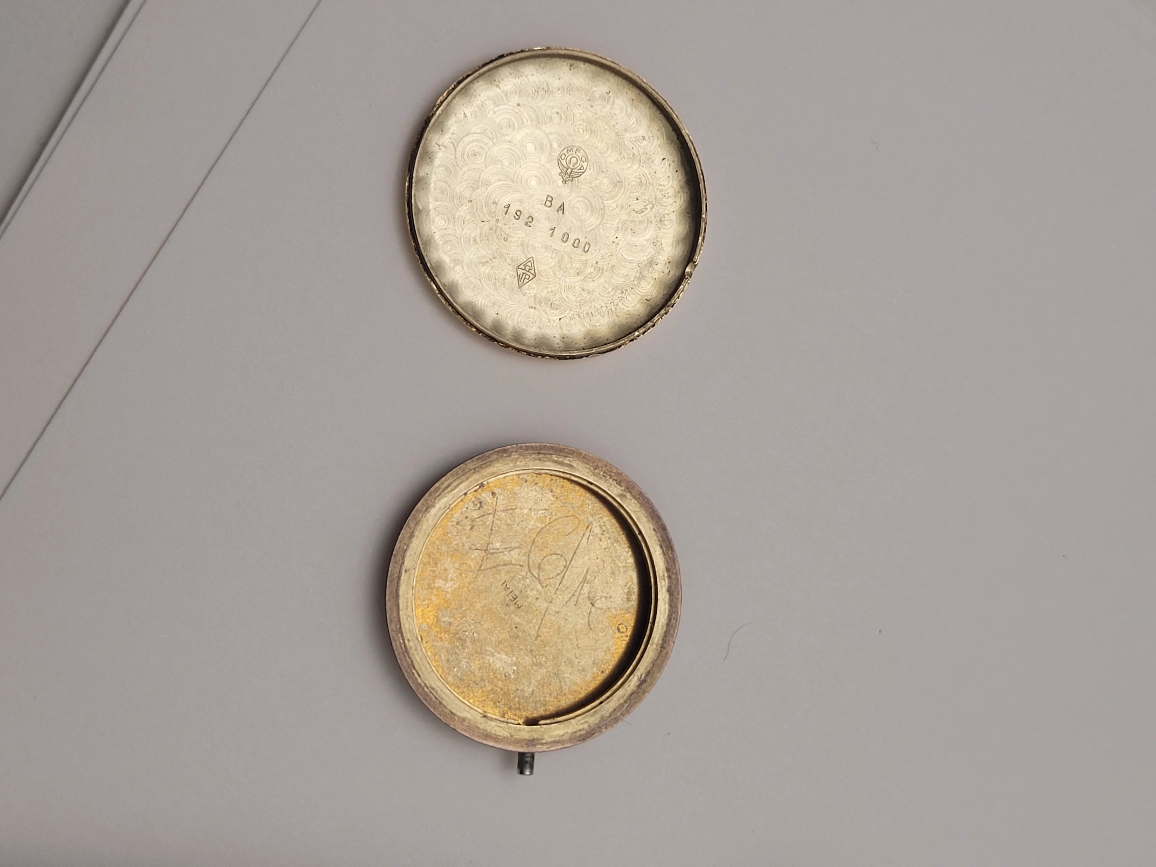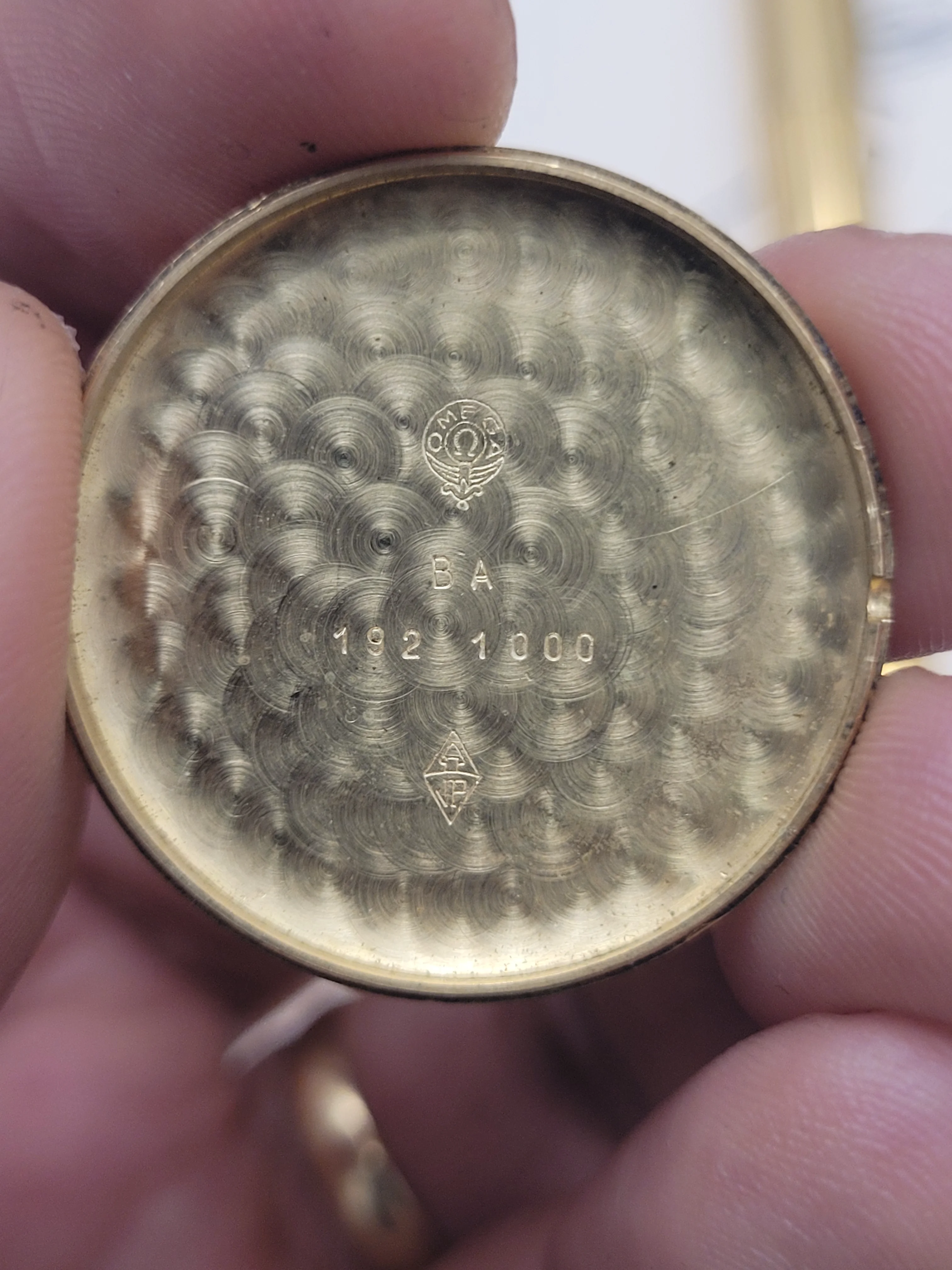 The case is 18k gold, as shown by the eagle hallmark on the back. The movent is held inside by an inner case in base metal. The interior of the back has an Omega logo that does not look like the normal one, a serial number, and the maker's mark (JP).