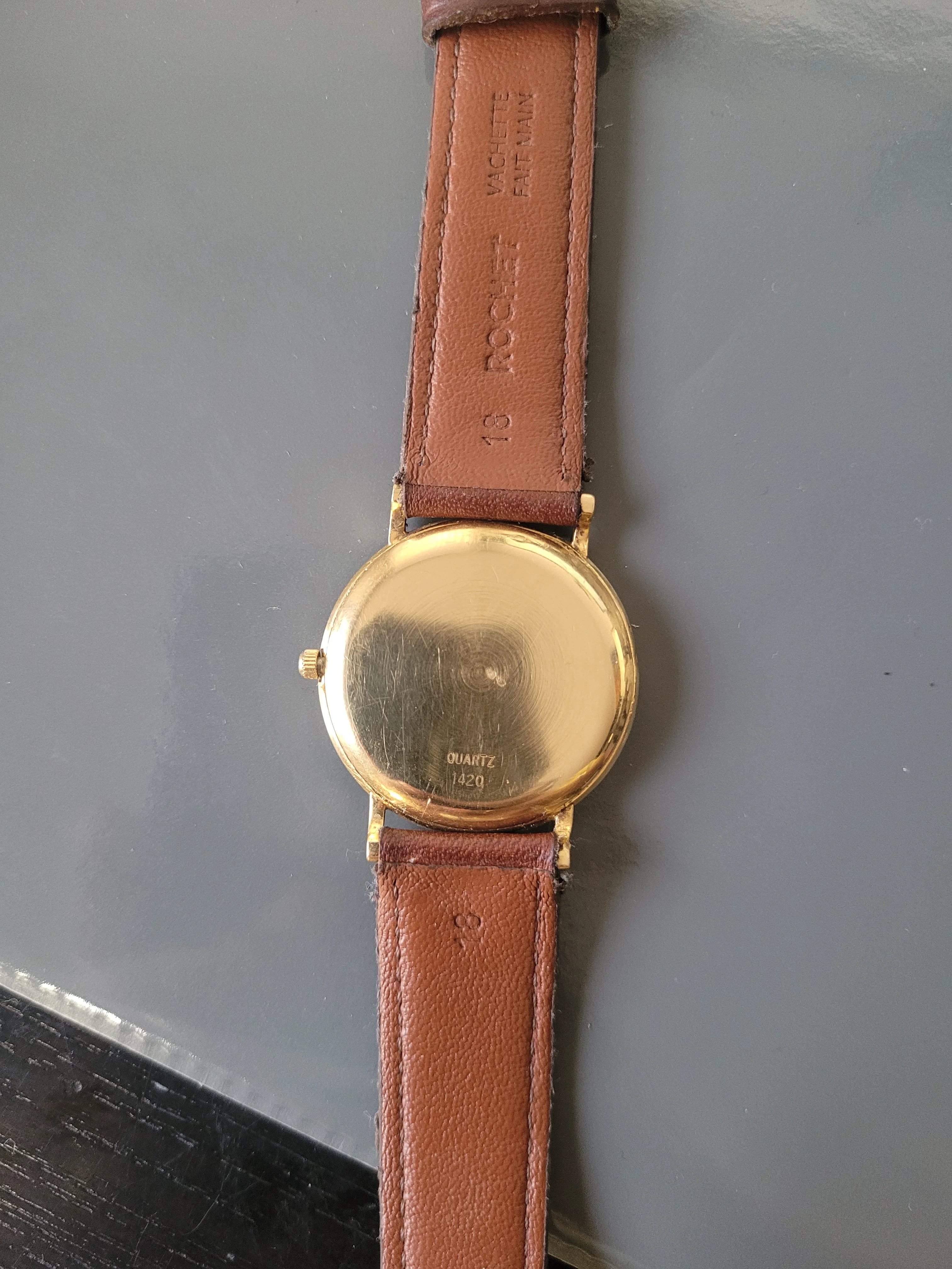 The back of the case is also stamped with "1420" for the movement and "Quartz".