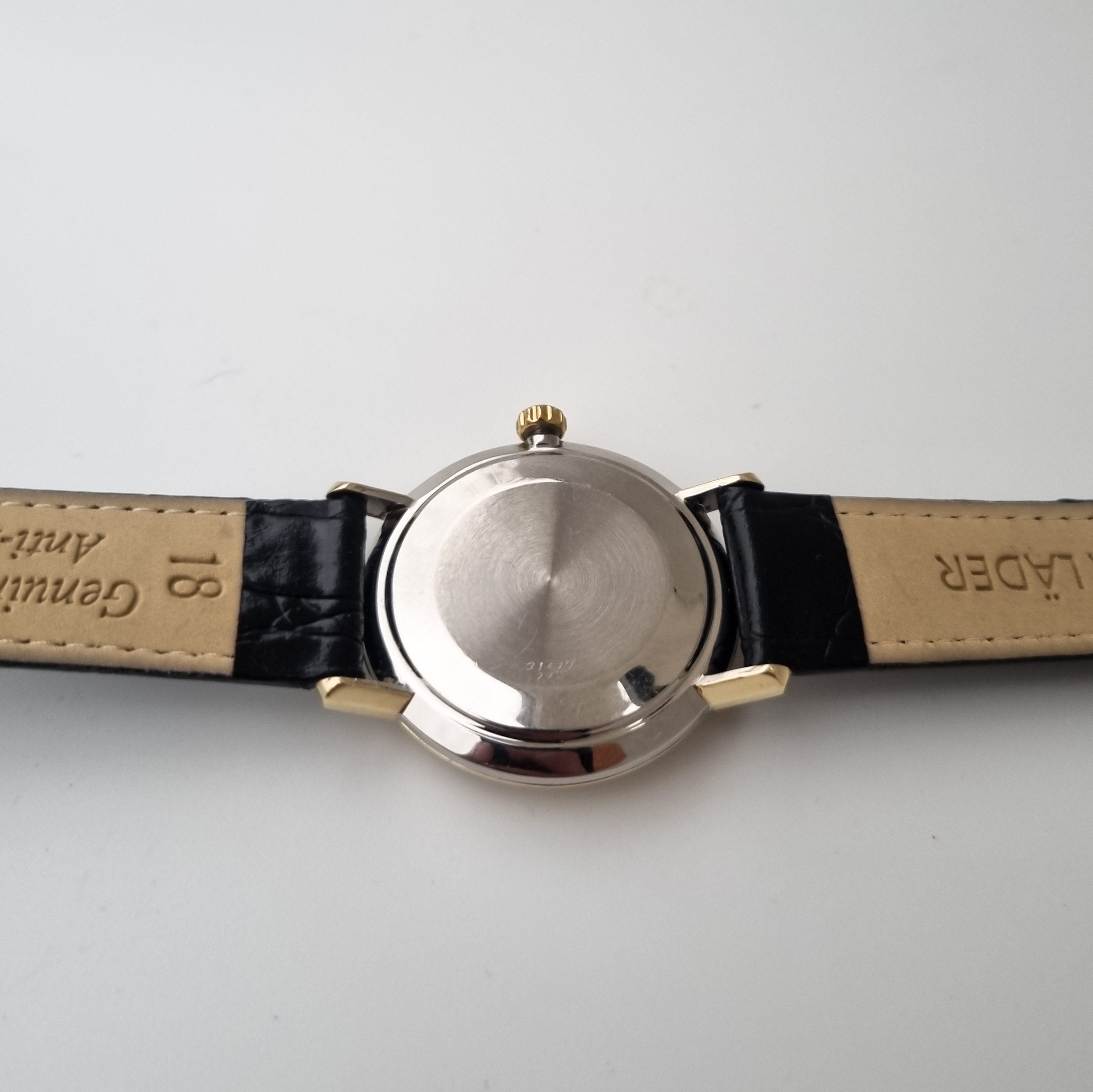 Comes on a nice new genuine black leather strap. Used only during the photo shoot.