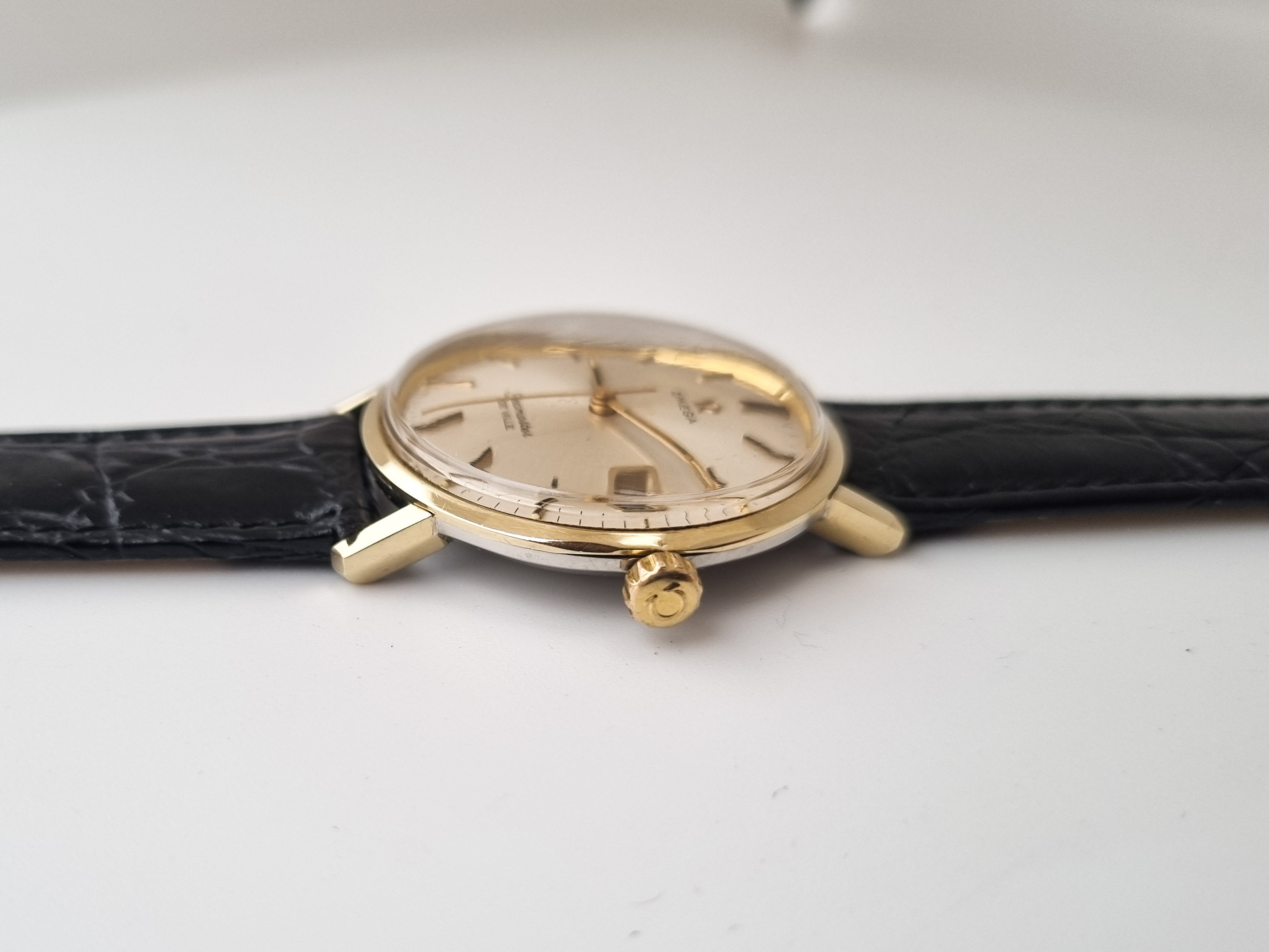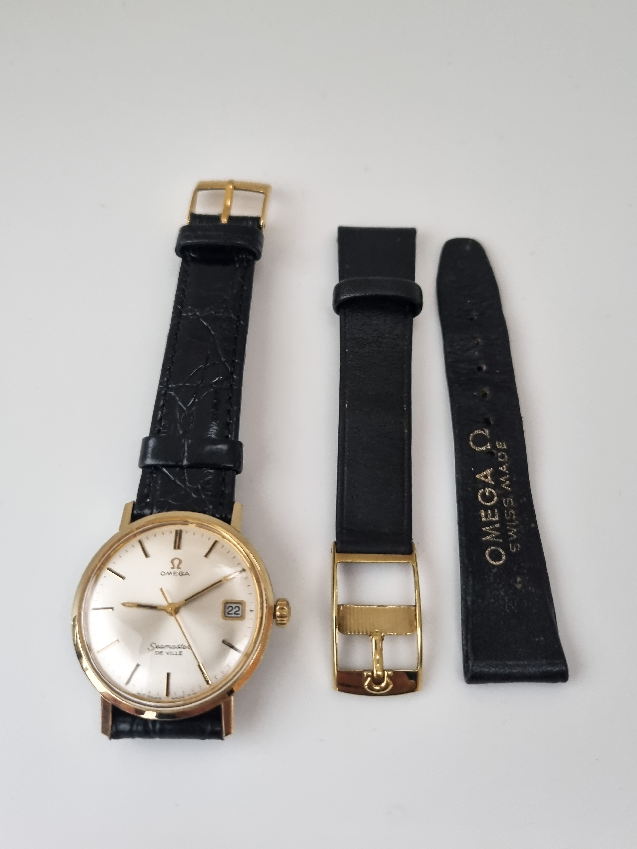 Strap: New genuine black leather + used original Omega strap & buckle