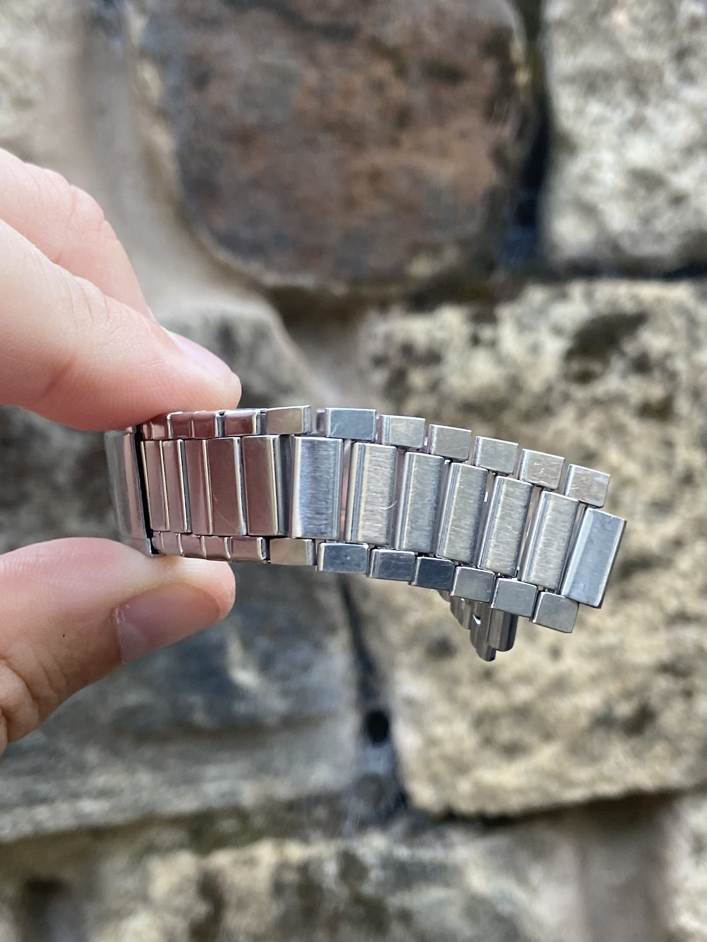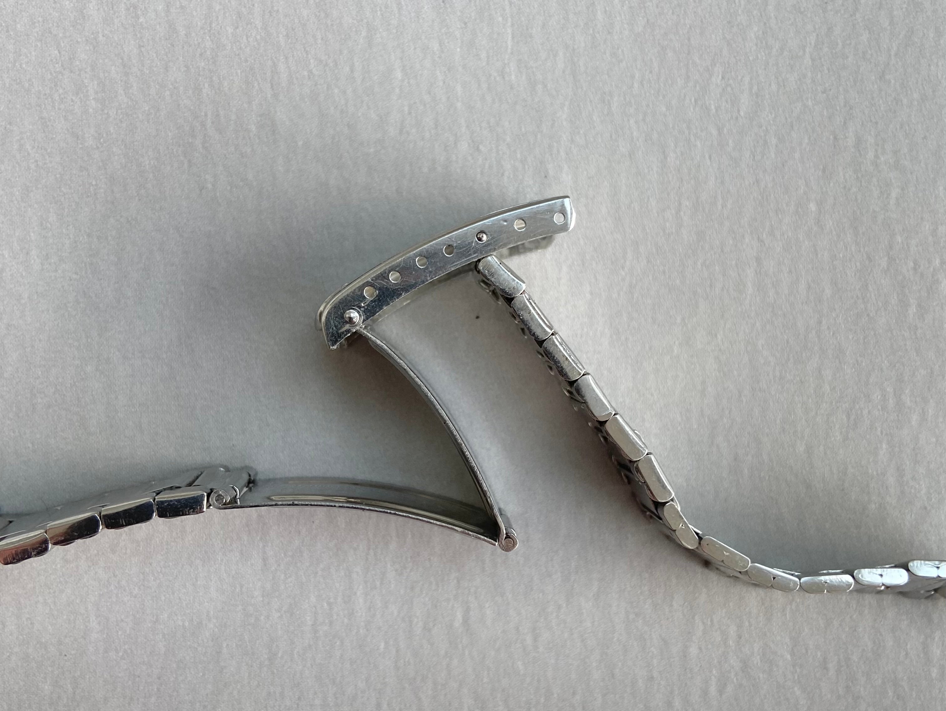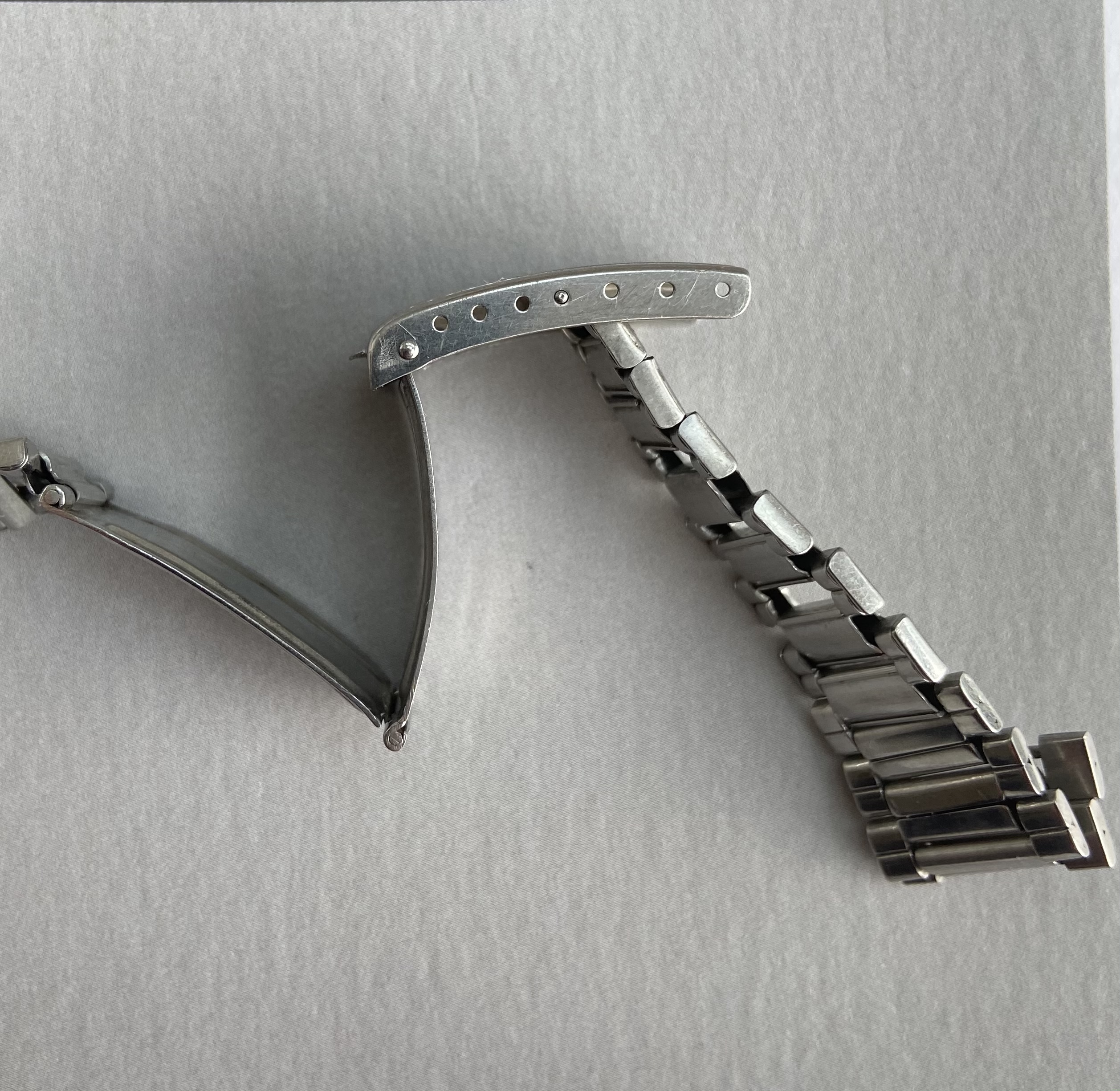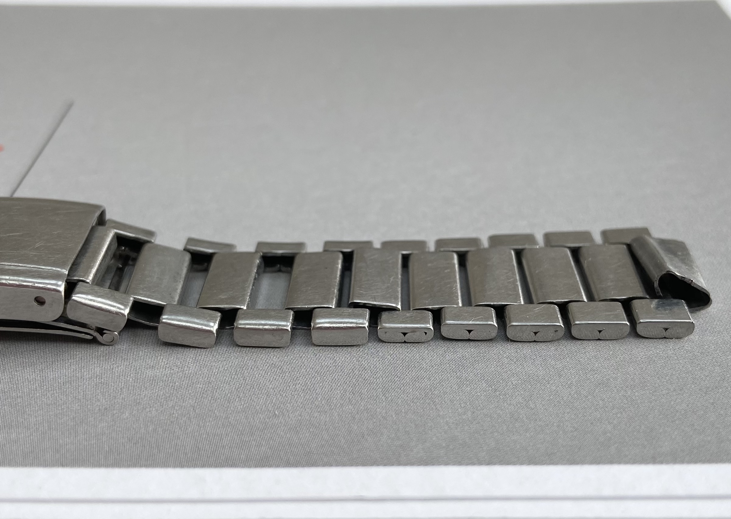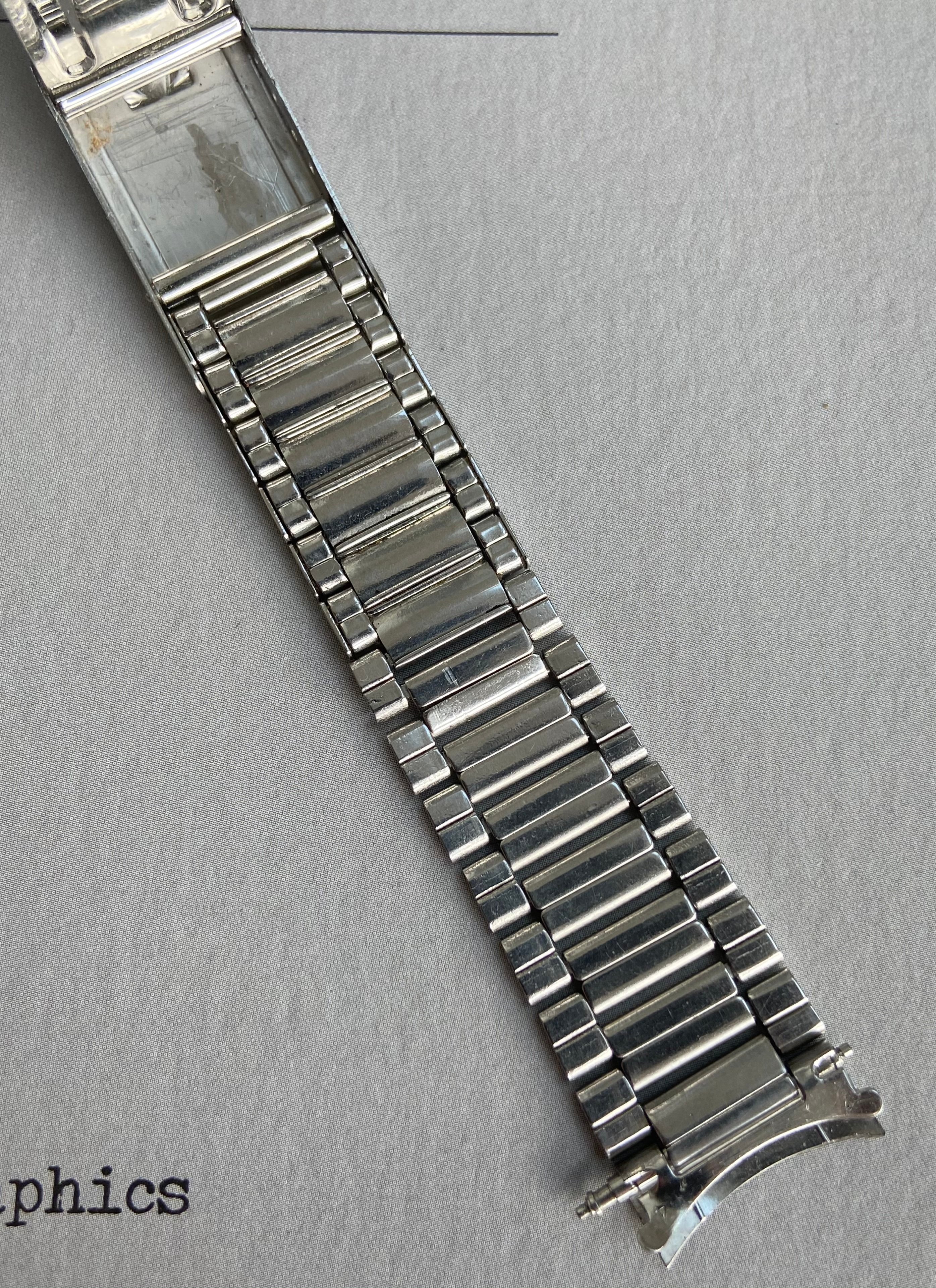 In need of restoration. The springs have gone in most of the stretch links and need replacing. The final centrelink on each side also needs reshaping as both have opened up. On the positive side, the fixed links are in generally good condition with the reverse showing little of the damage or gaps one commonly sees on these bracelets from heavy handed resizing. The clasp is also fully functional, closing securely