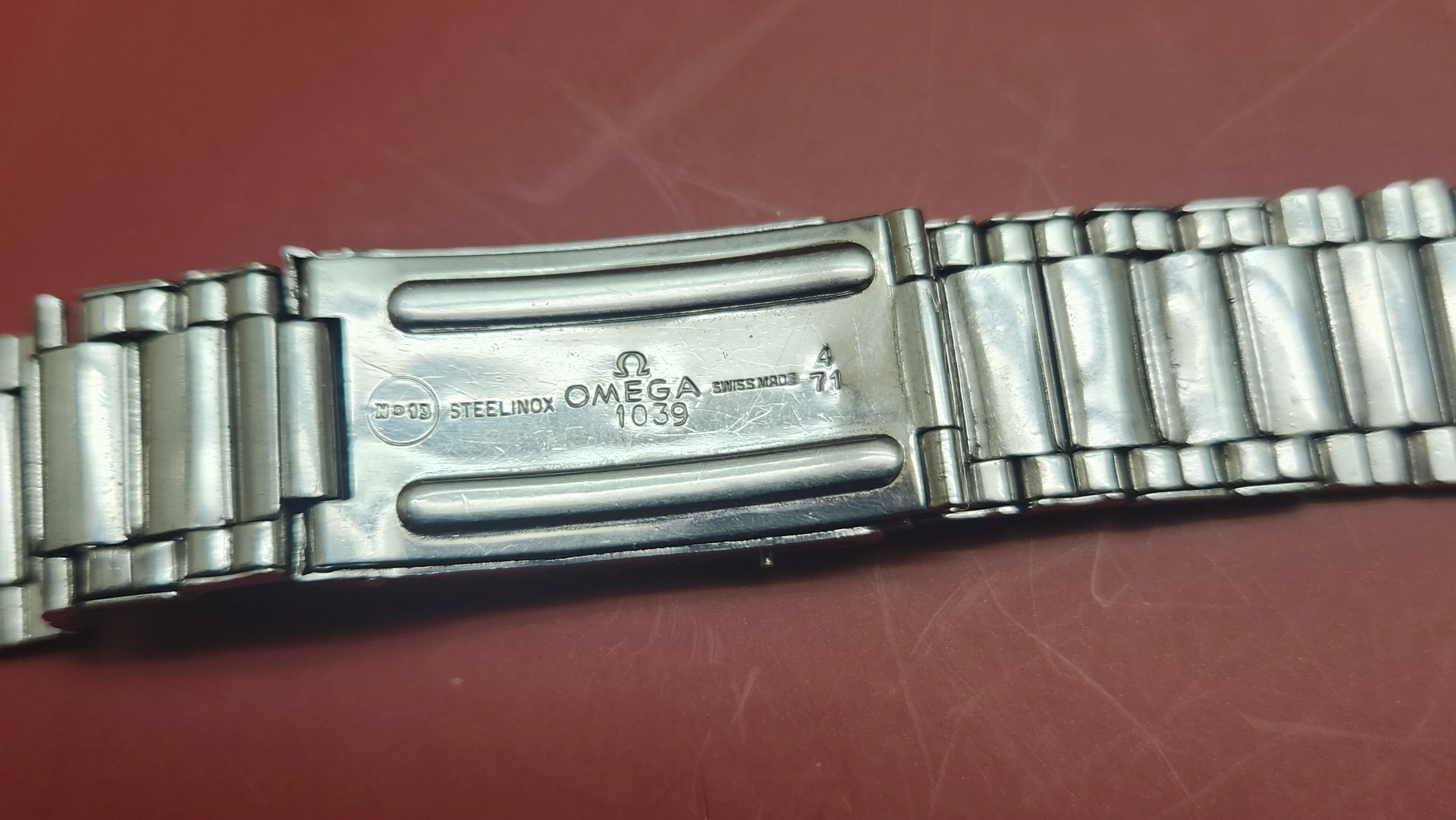It has the clasp cover of a late 7077 or 7912 with the overhanging Omega symbol and the LONG clasp. There are some tool faint marks and and signs of polishing on the clasp. The clasp leafs are from a 1039 with a 4/71 date stamp. I believe the links of the bracelet are from a 1035 since the side links are hollow, but have little play and are nice and close together (unlike what is commonly seen on the folded end links of the 7912 which have more space between the links).