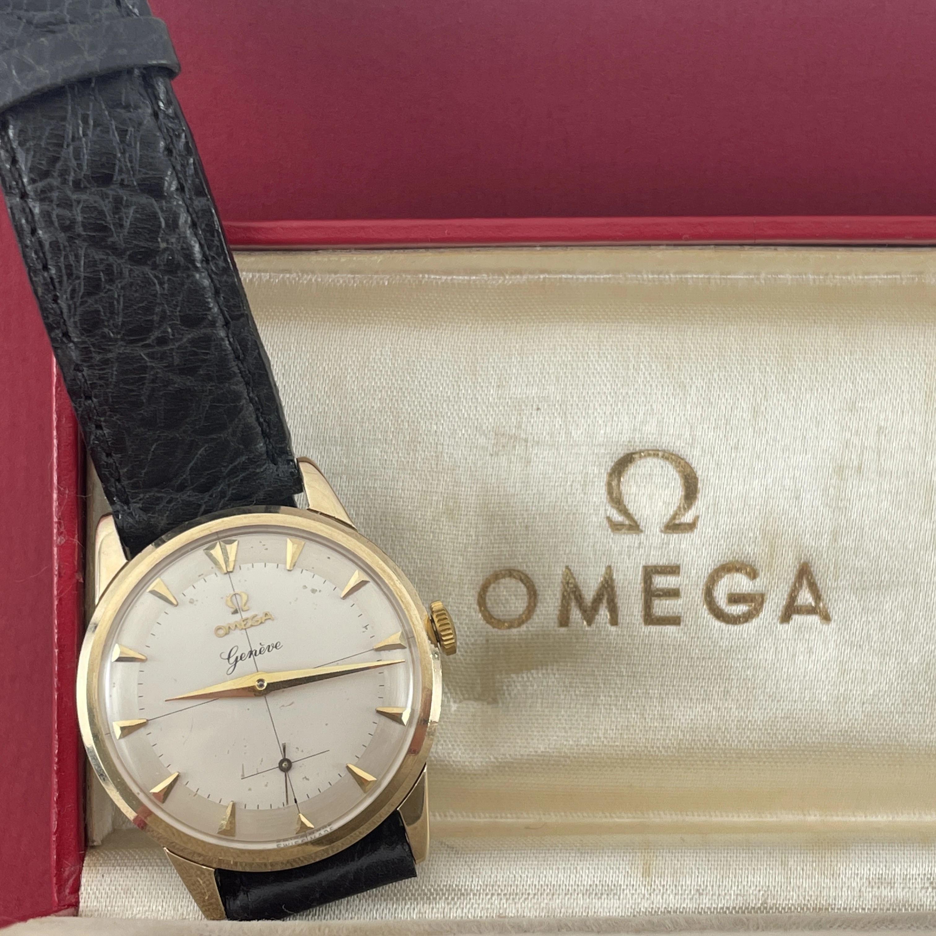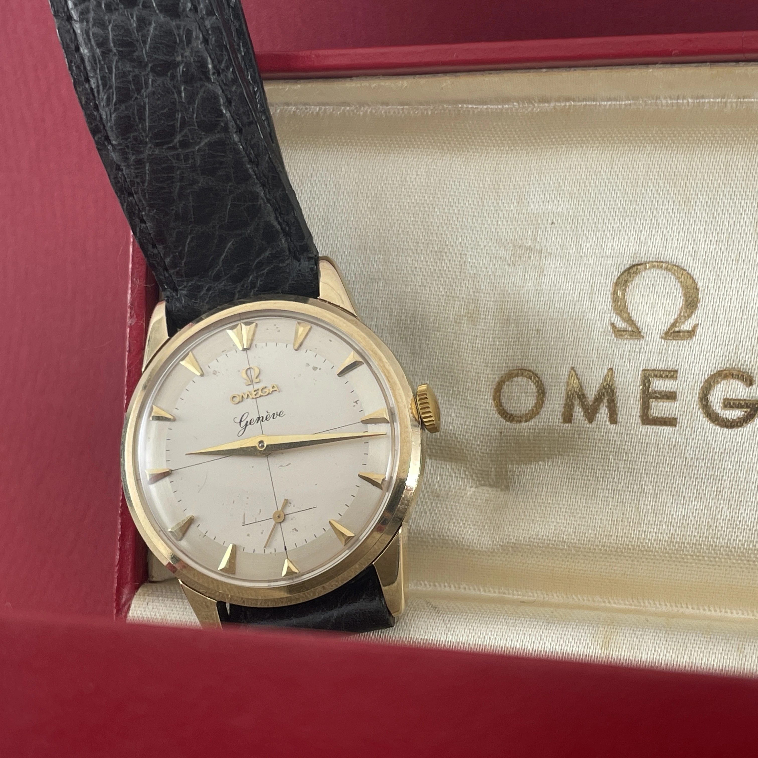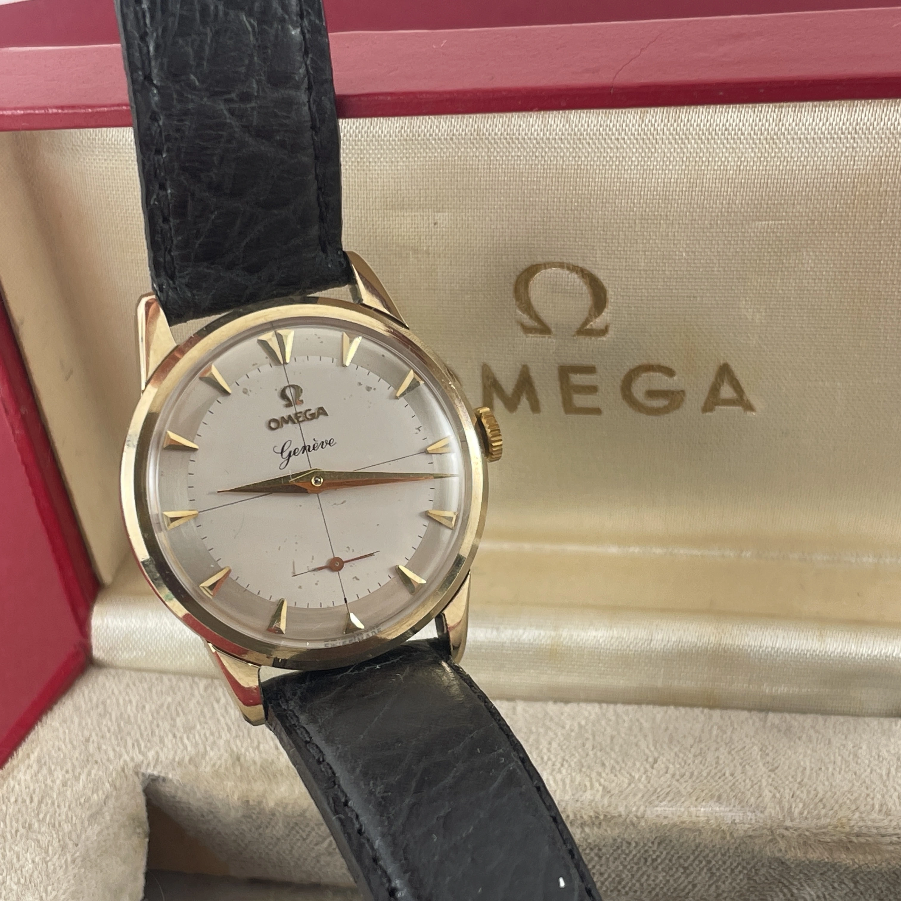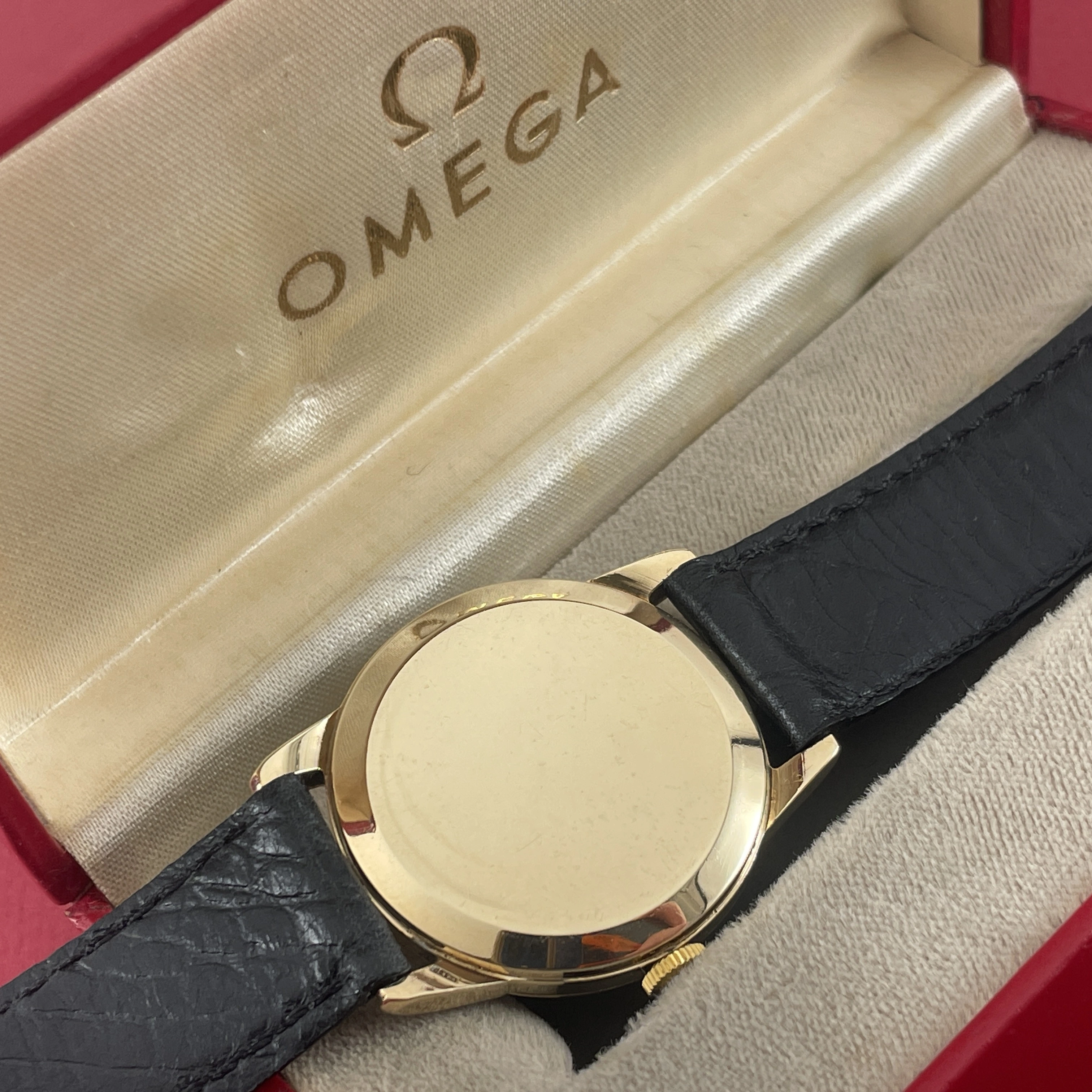 Comes with an Omega box, not sure if it is original to this watch, and is missing it’s cushion inside. On a regular leather strap.