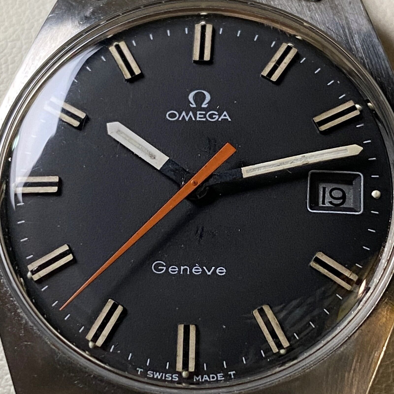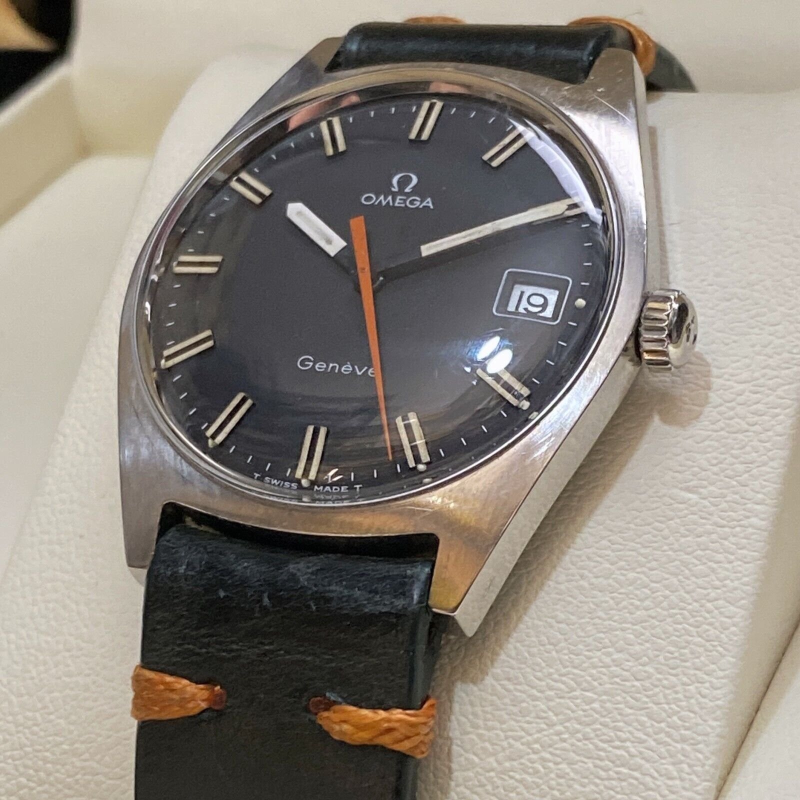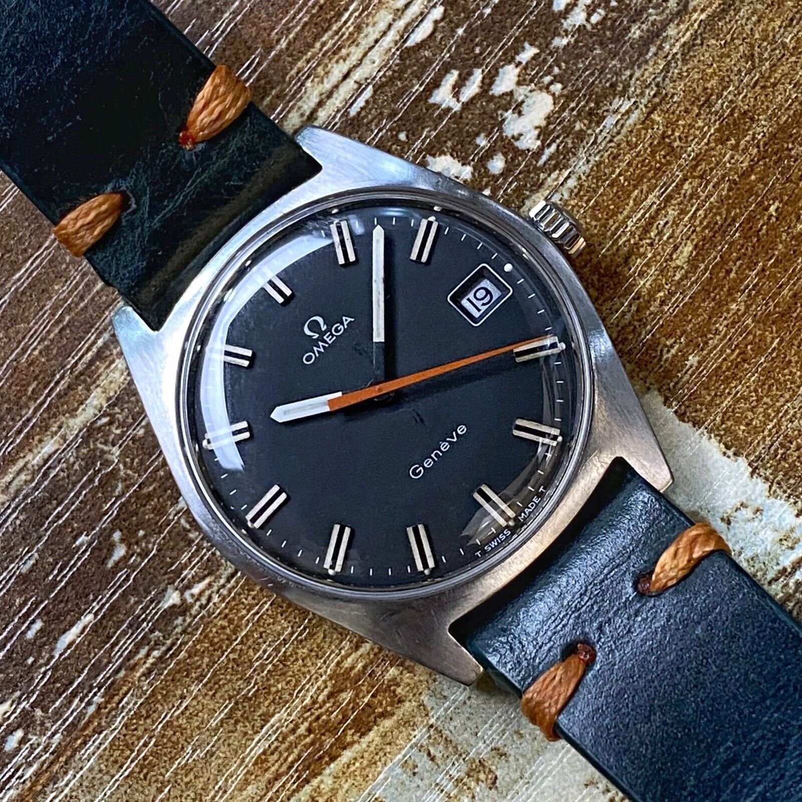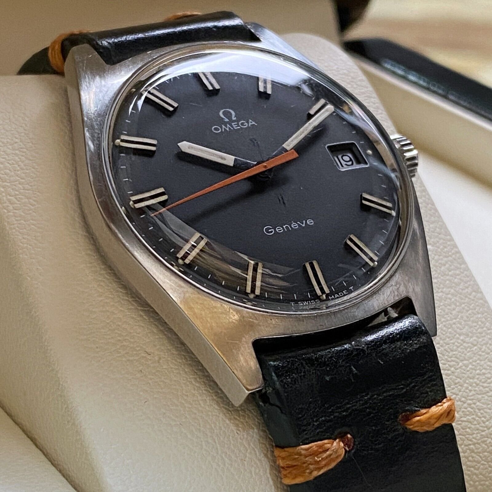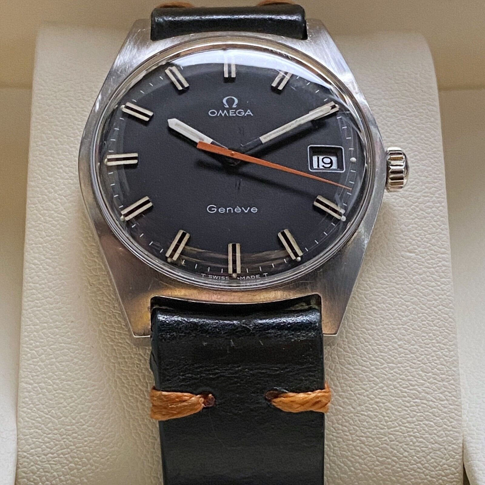The watch is a Vintage Omega Geneve ref. 136.041 Black Dial Quick-Set Date 35mm 1968 cal. 613