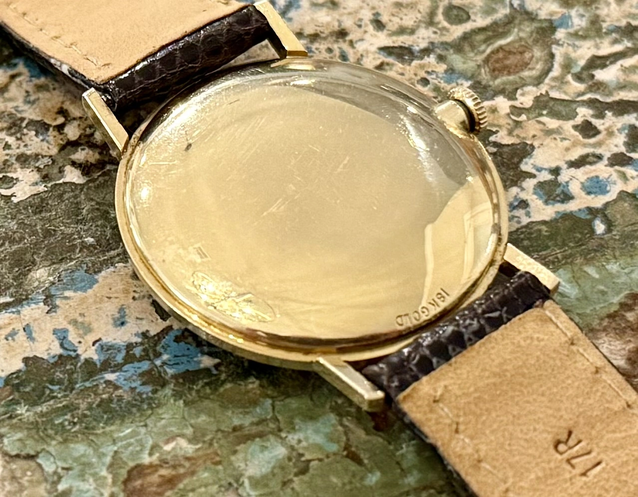·Can anyone help me identify this vintage Omega? It is my first one and I know nothing about it. The only markings on the dial are “Omega” and “Swiss Made”. The back is only stamped “18K Gold”. The case is right at 33mm in diameter. Does this have a model name/number and any ideas on when it would have been made? Also, ballpark value? It does wind and run properly (obviously the strap isn’t original). Thanks for any info!