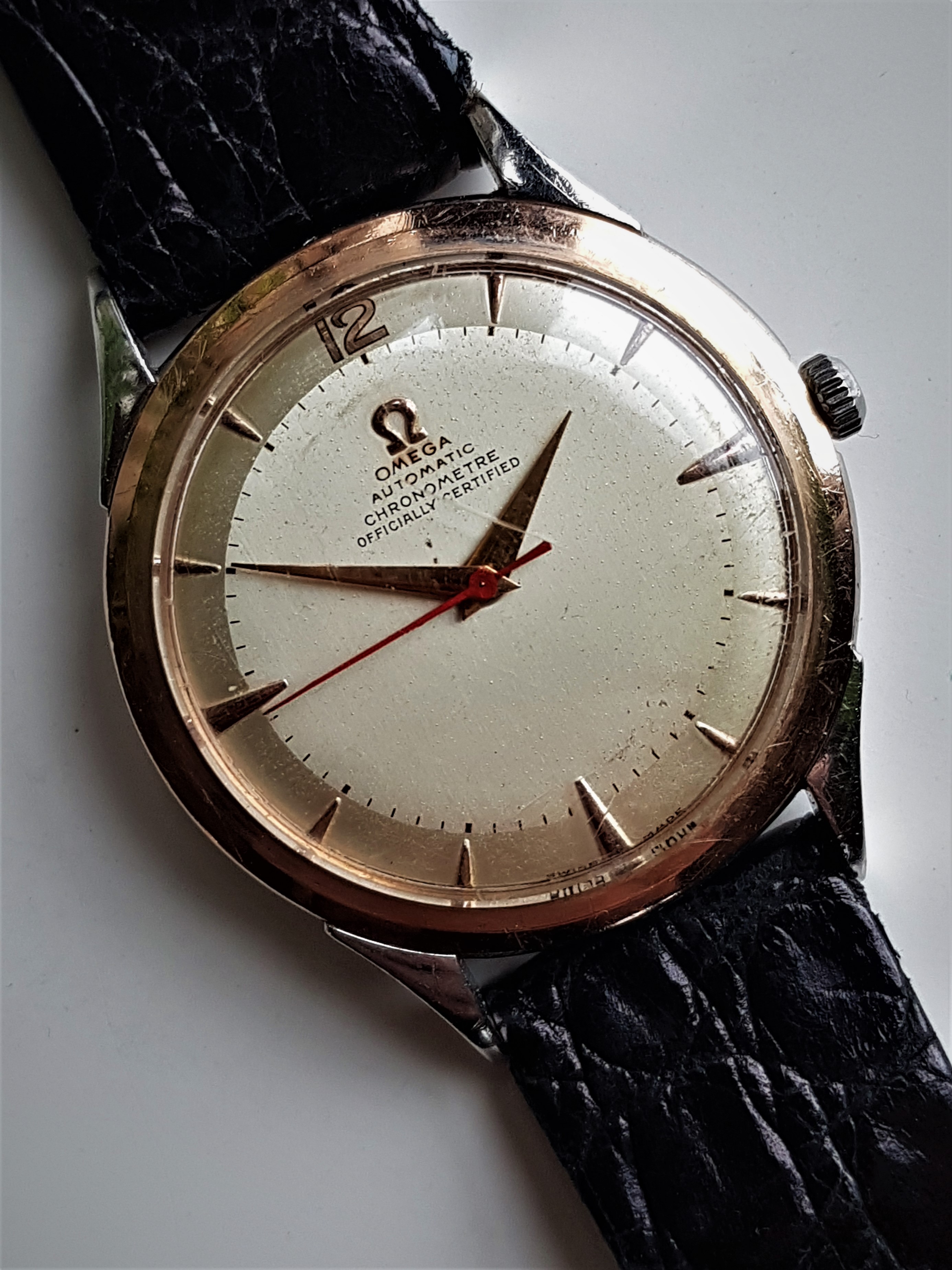 Posts 24,392 Likes 54,283 Dan S ·Feb 4, 2022 These red sweep hands show up periodically and some of them are legit. I acquired one recently but it hasn't arrived yet, so I won't jinx the shipping with a photo. I have not seen one on a chronometer-version previously. https://omegaforums.net/threads/vintage-omega-seamasters-with-red-seconds-hands.65373/ https://omegaforums.net/threads/seamaster-351-red-second-hand.5944/