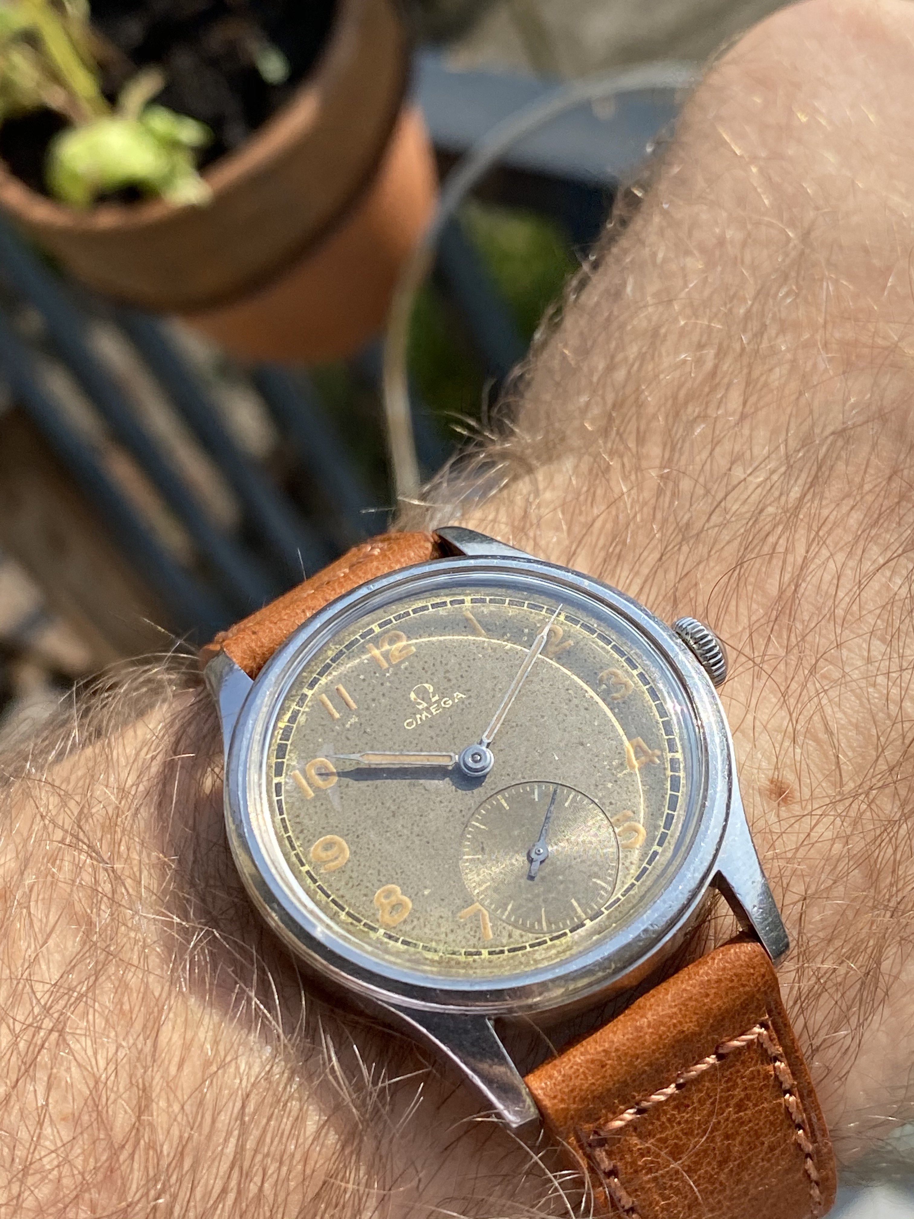 The patina is amazing and has aged quite well. As you can tell on the picuteres, the tone of the dial changes along with the light. The watch has been expertly relumed by James Hyman so it got that patinated radium look.