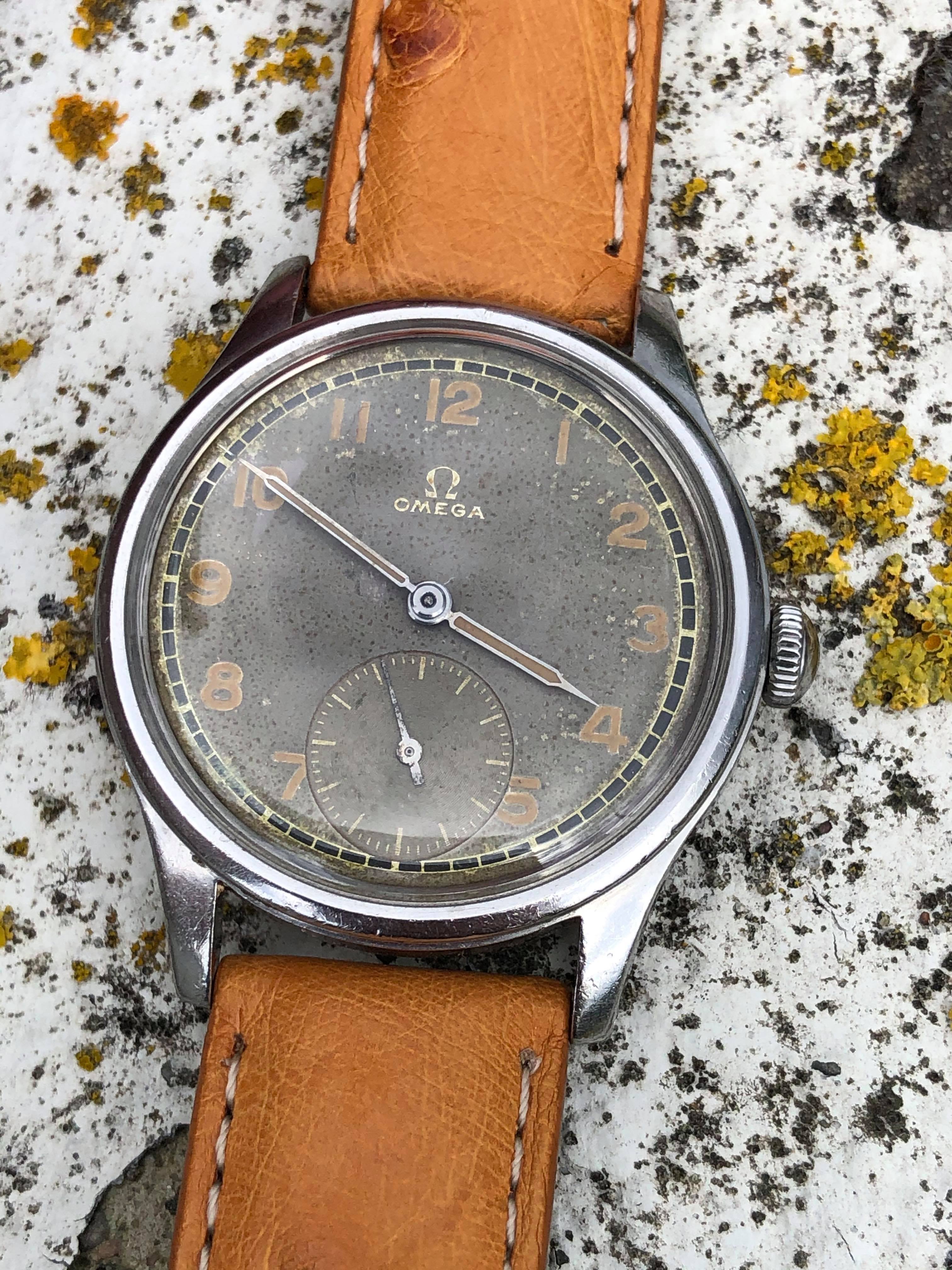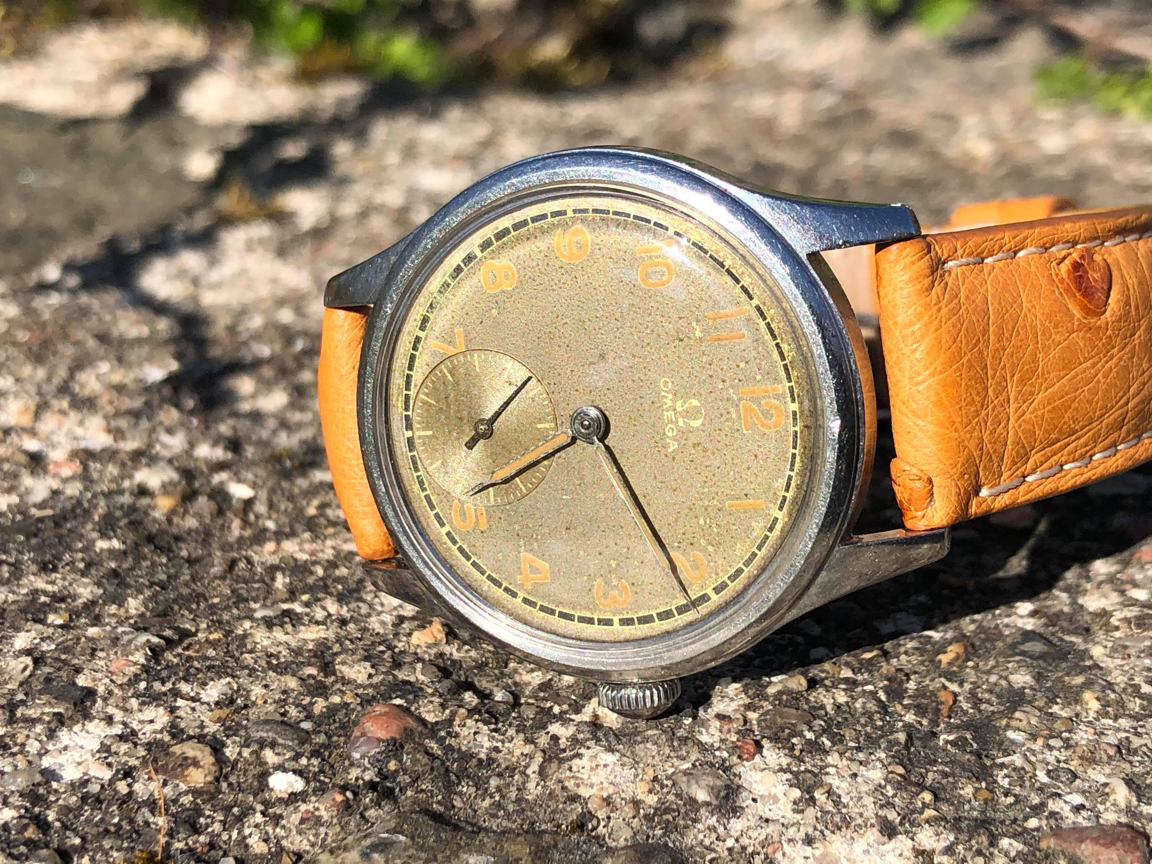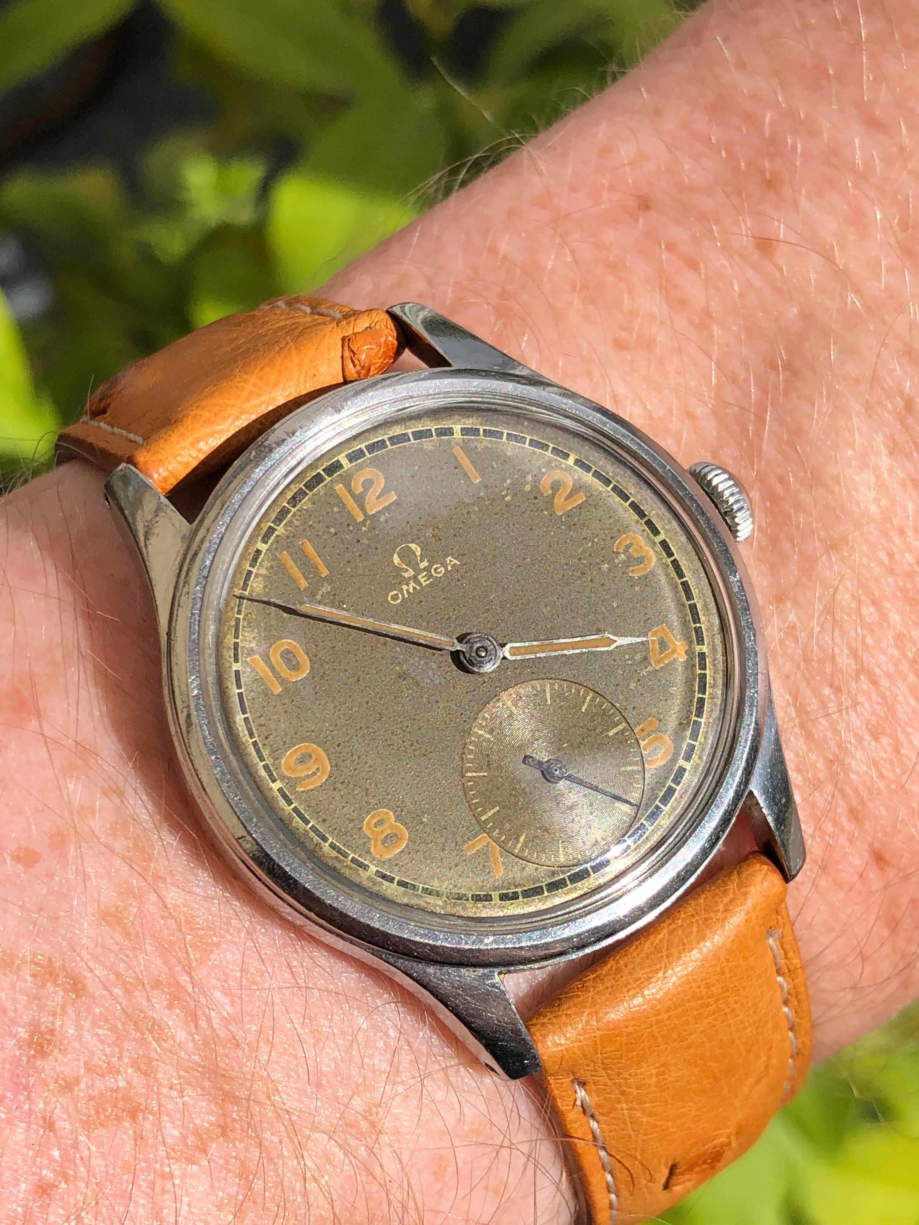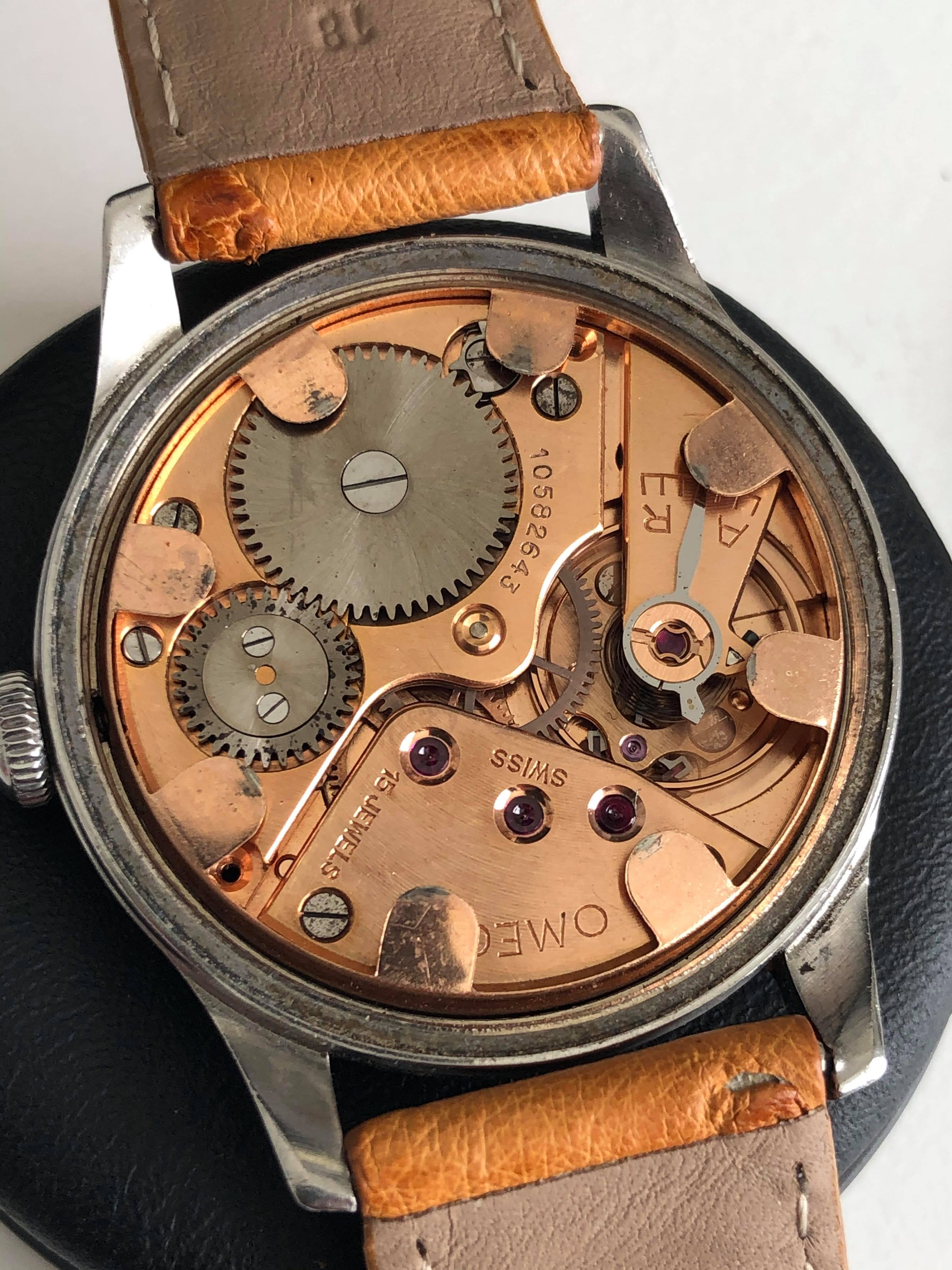 The watch measures around 35mm without the original "bowlerhat" style Omega crown. The case of course has signs of wear due to it 75 years of age, but it still remains in good condition.