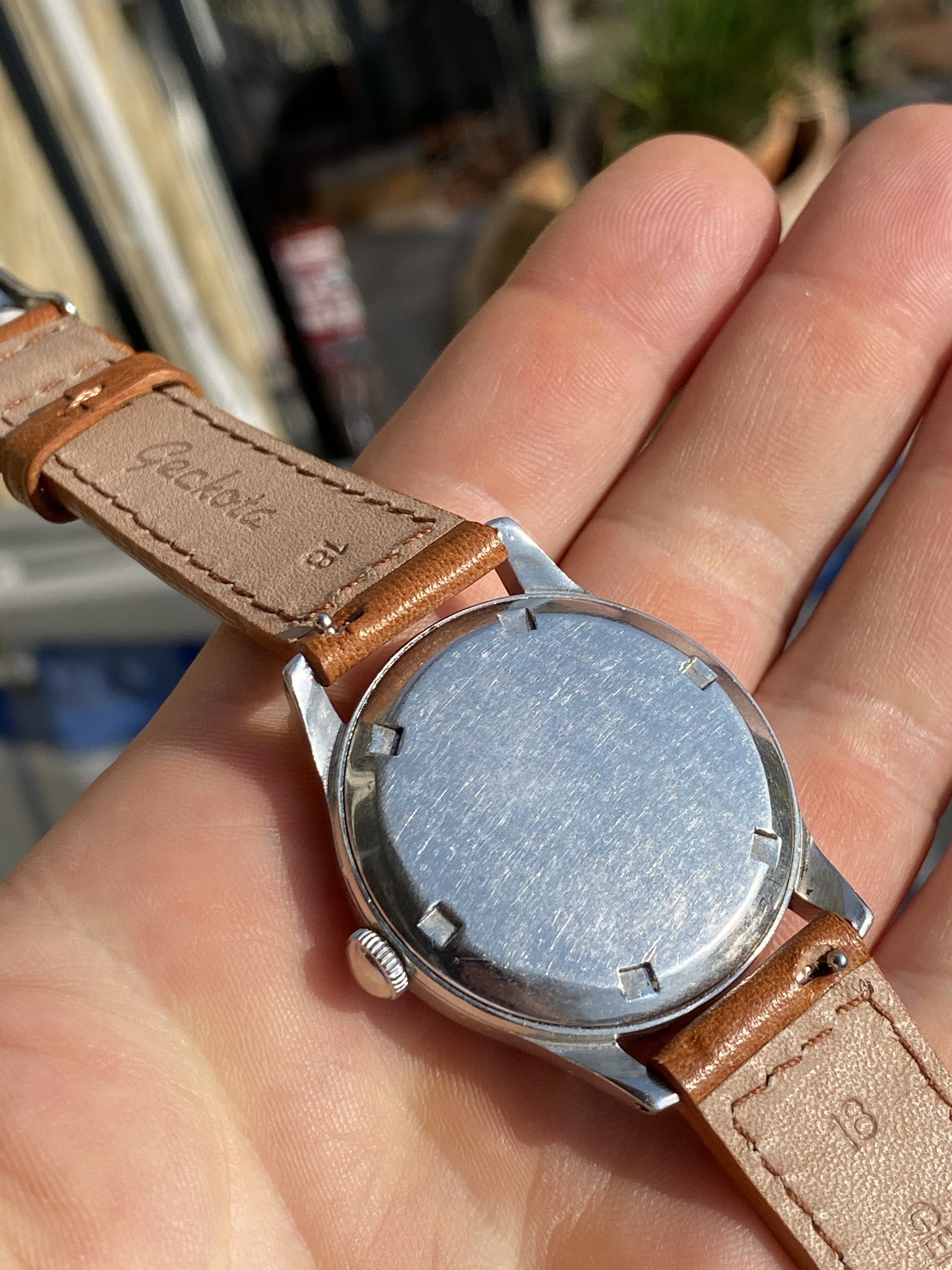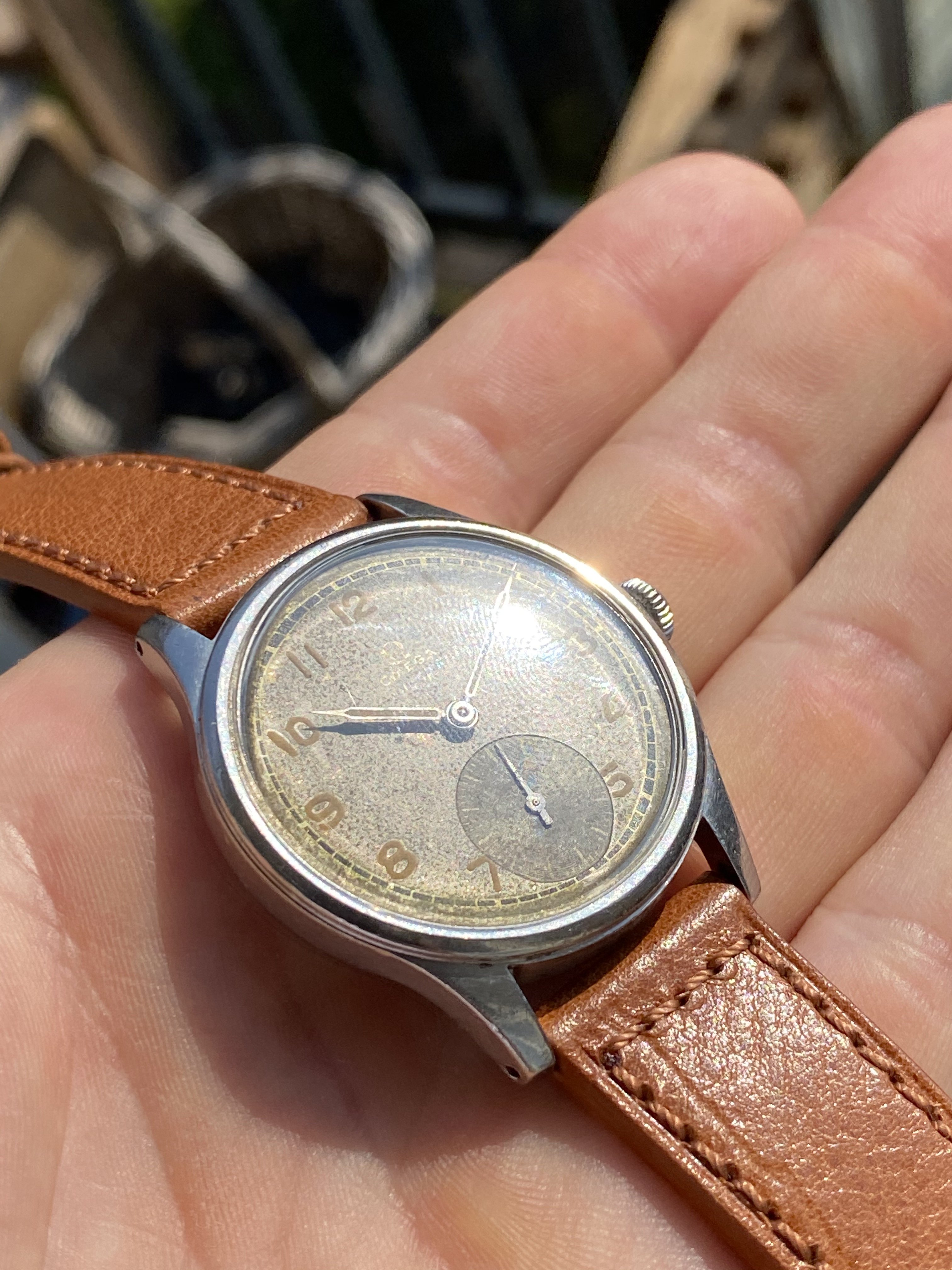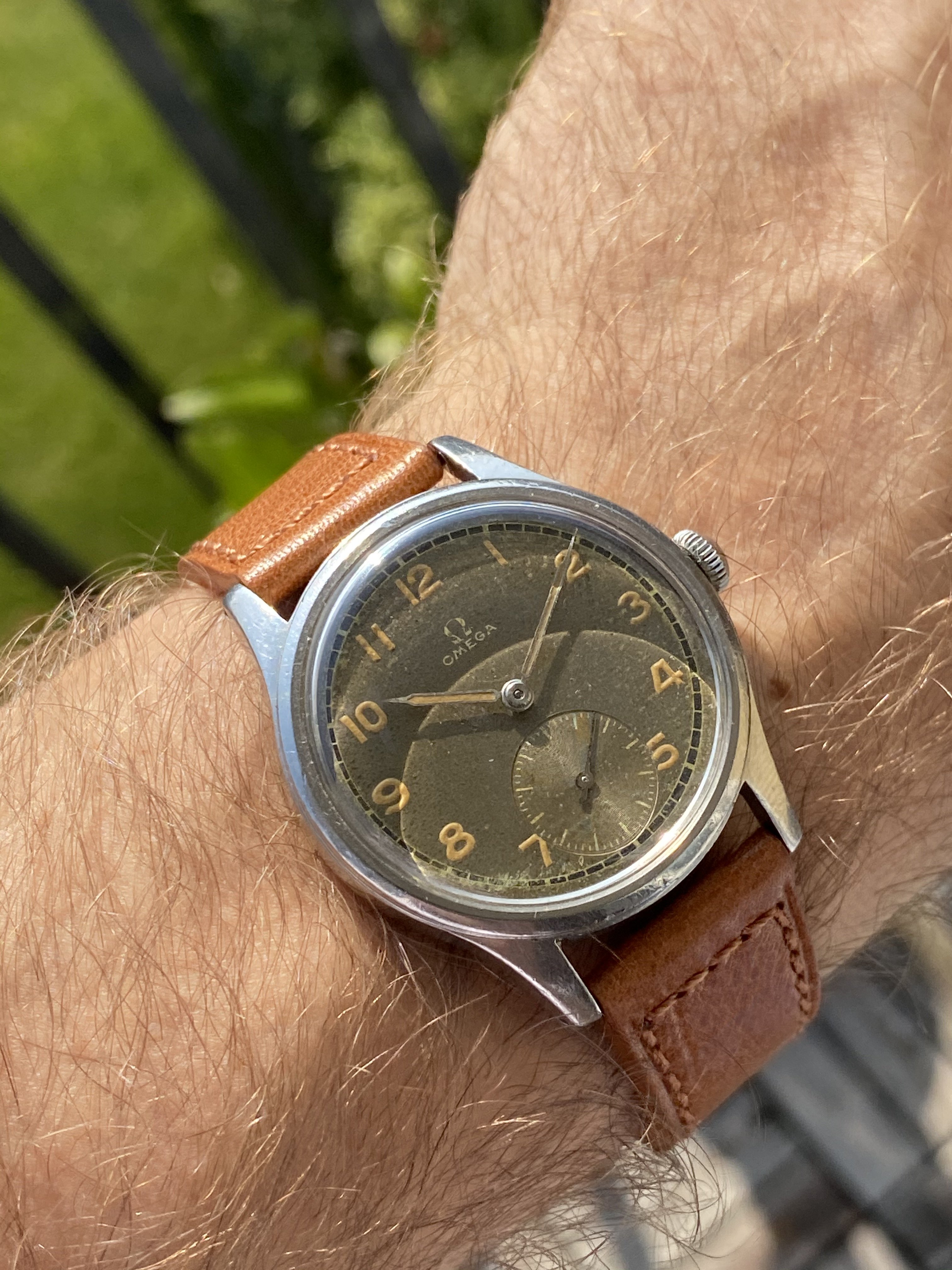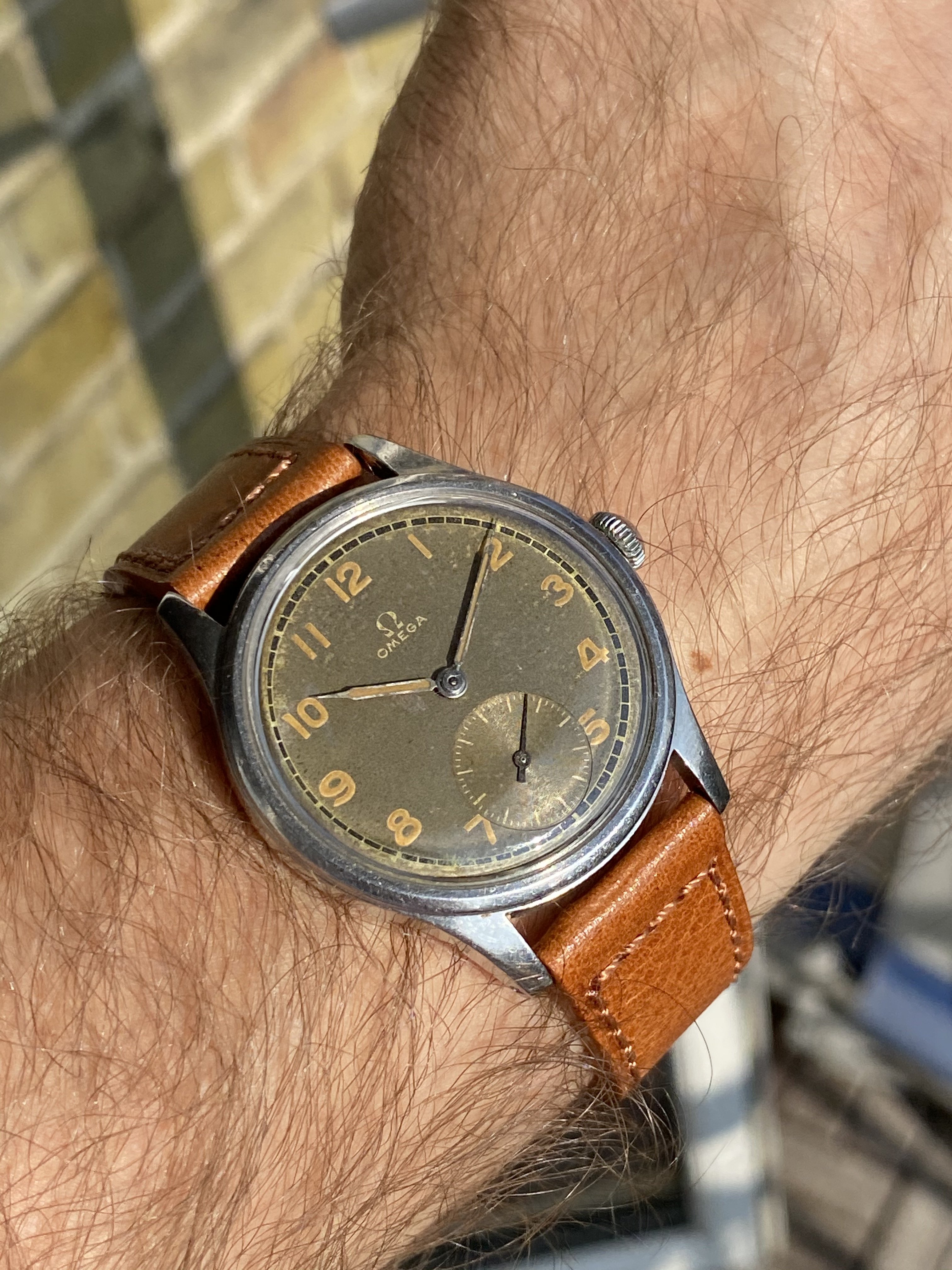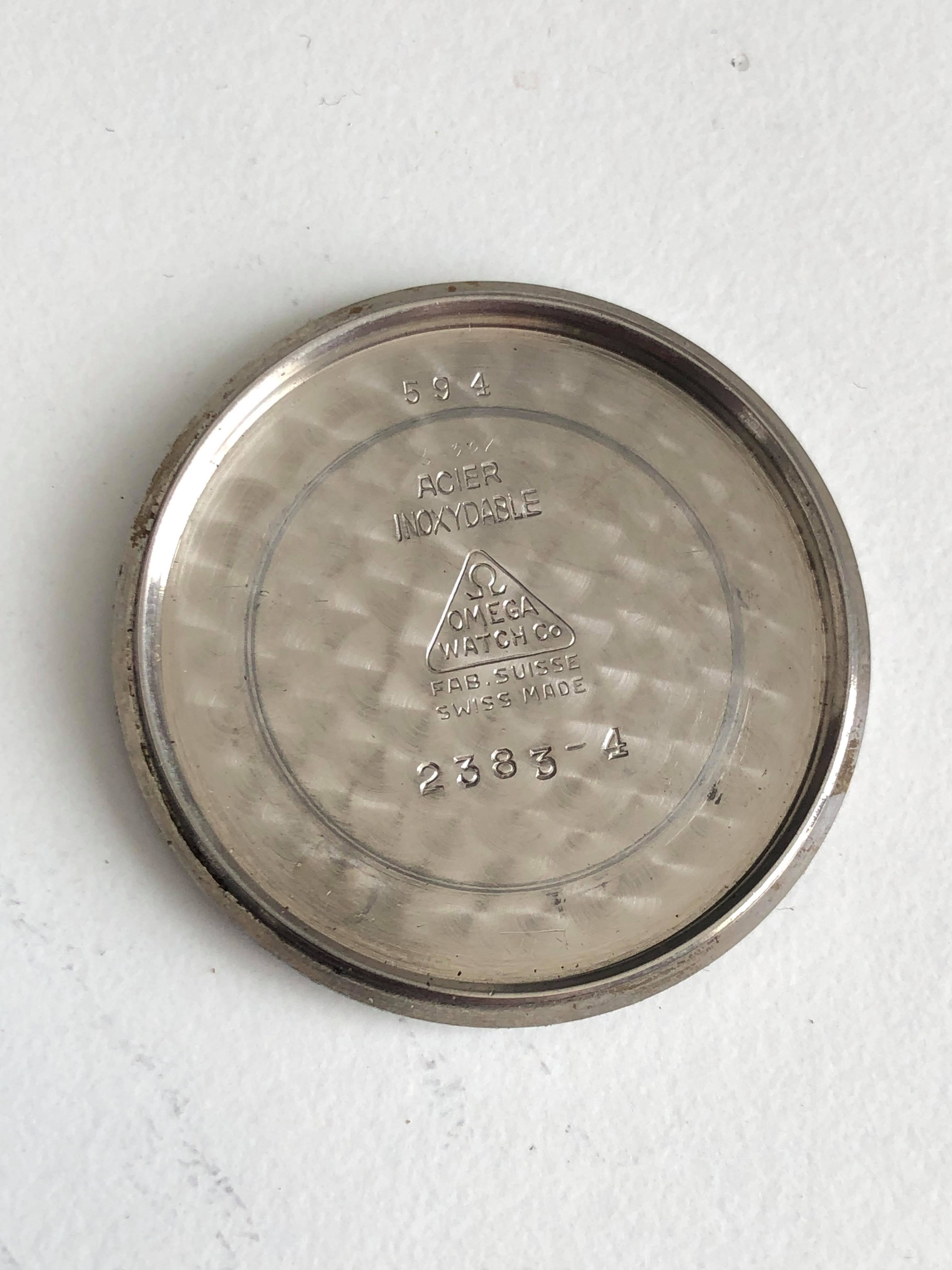 The watch measures around 35mm without the original "bowlerhat" style Omega crown. The case of course has signs of wear due to it 75 years of age, but it still remains in good condition.