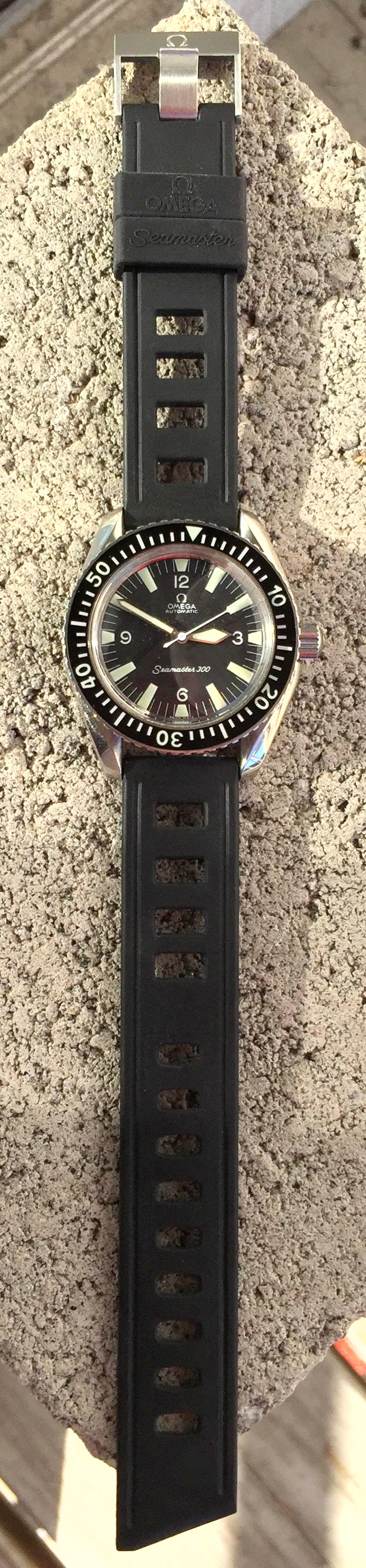 ·There has been a vintage Omega rubber strap, Isofrane style, on eBay forever and ever. At $279, without buckles and keepers, a little too expensive. But... buckle and keepers are available separately, so I took a chance. My offer of $229 was accepted, and I got a buckle from Authentic Watches and the keepers from Otto Frei. The keepers are from a recent Seamaster strap and are marked Omega and Seamaster. I suspect the originals were unmarked, but this way is more fun.