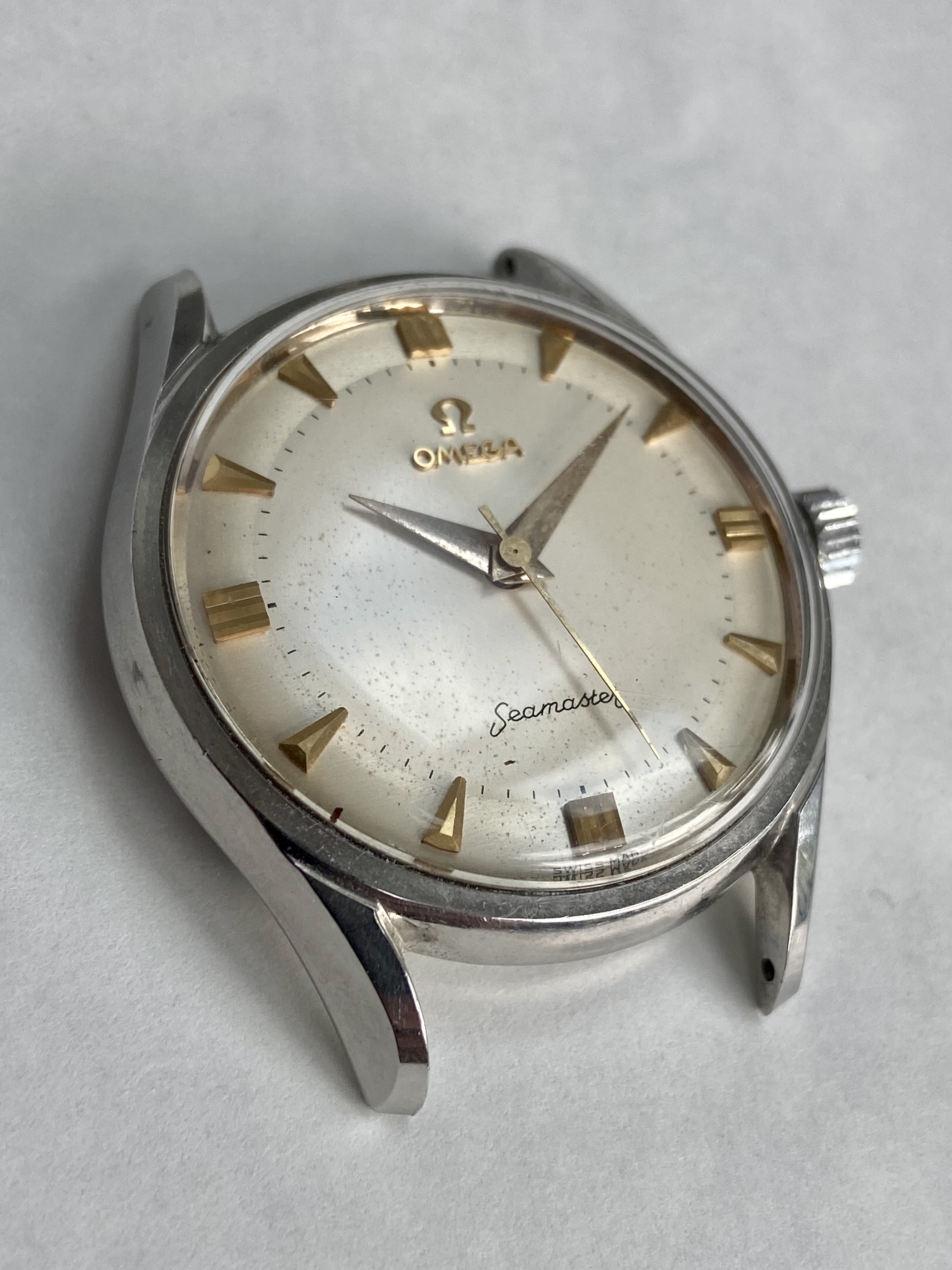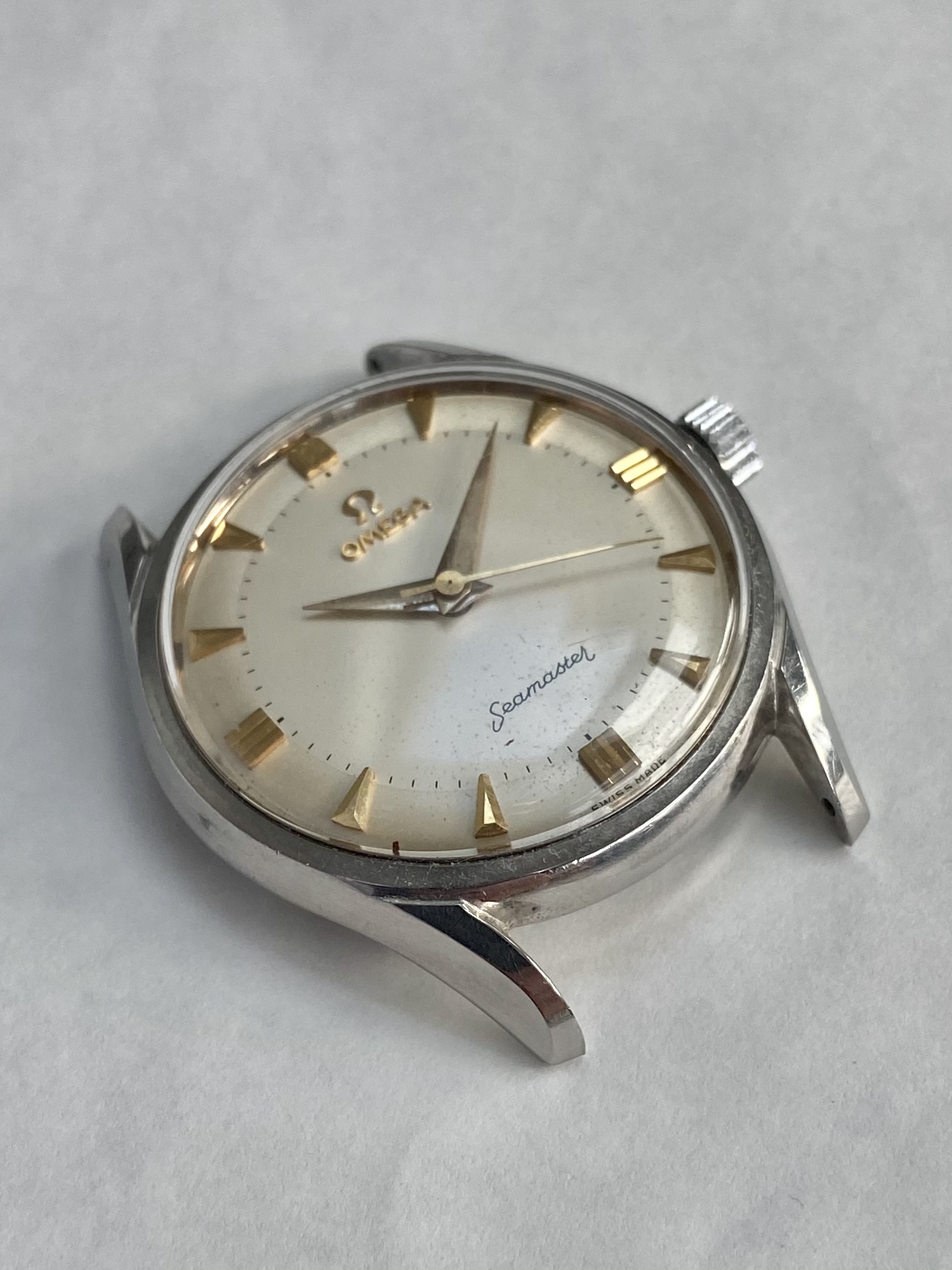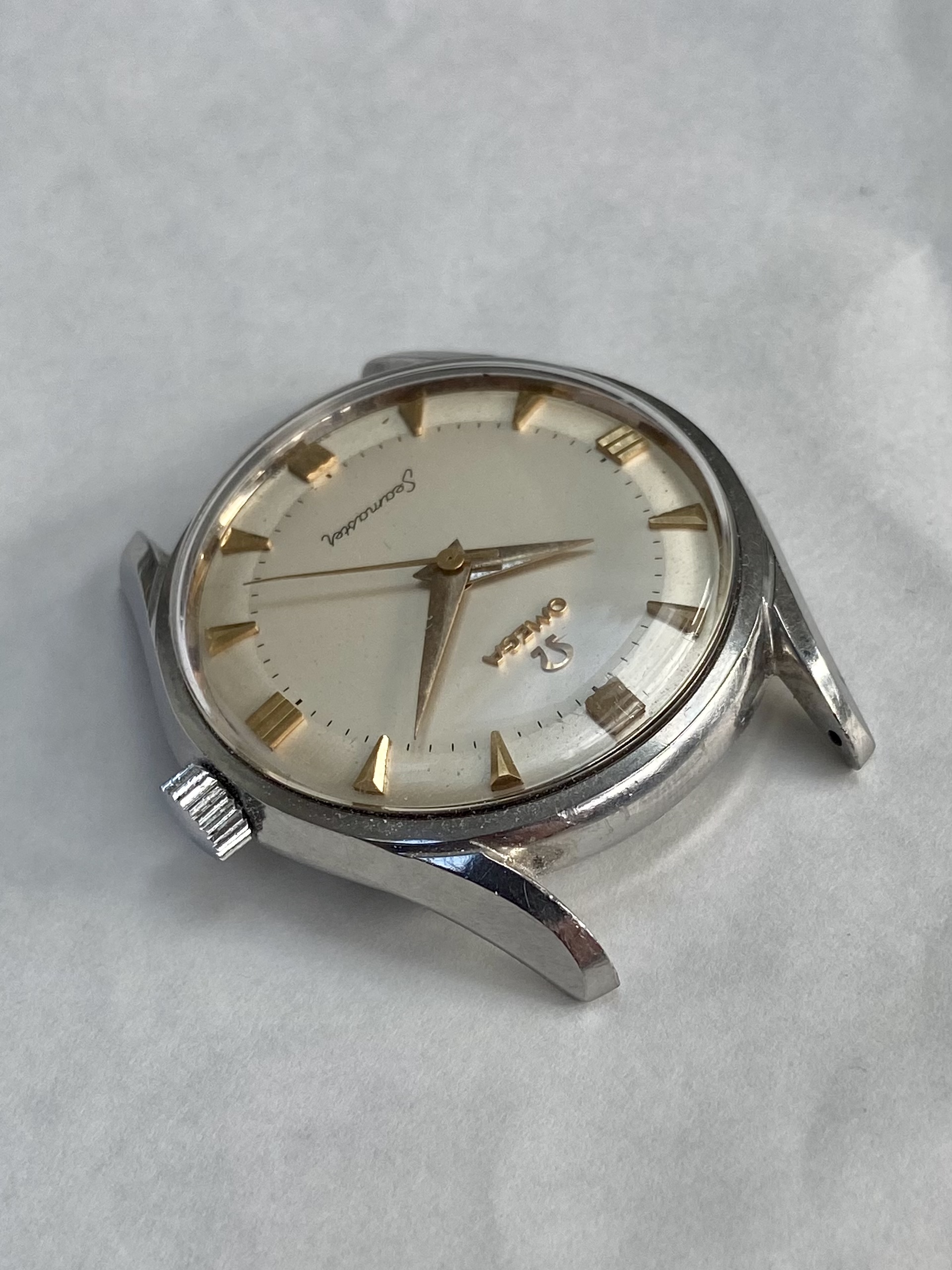 Original dial with applied omega logo and shark tooth hour markers and matching hands. No lume. Very good condition with very slight spotting to the lacquer but this is only visible at certain angles. I’ve tried to photograph this but as it’s so light it’s hard to capture it.