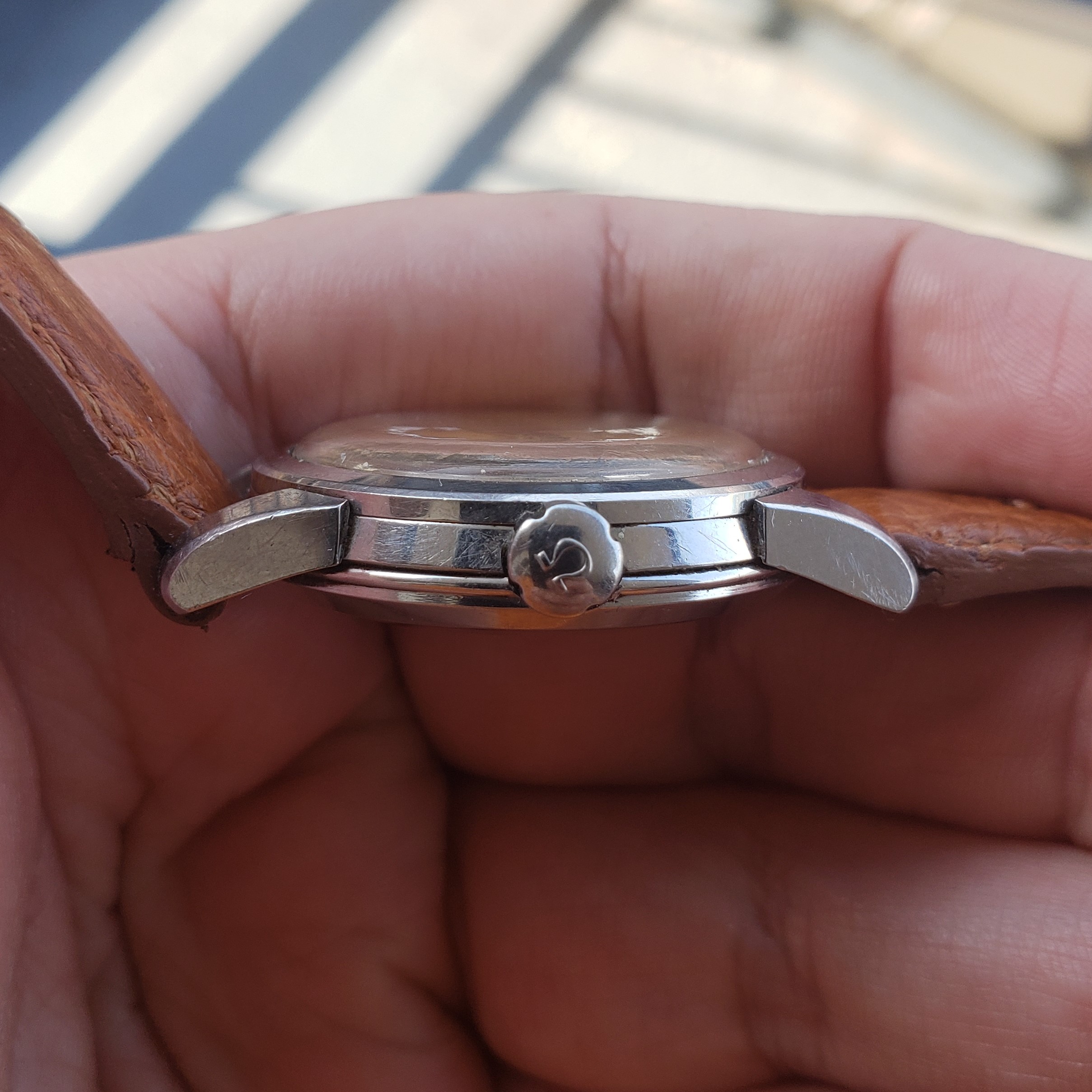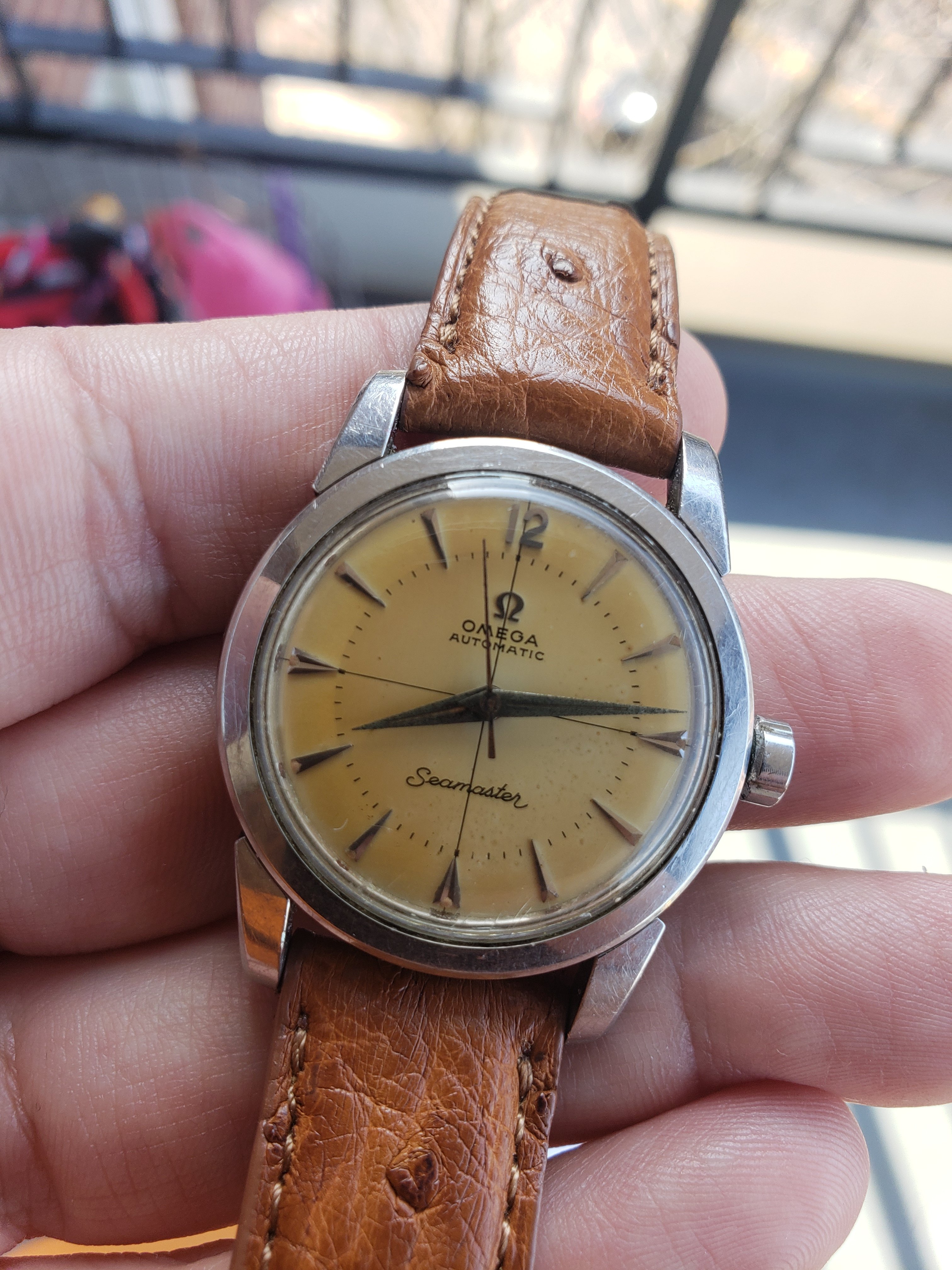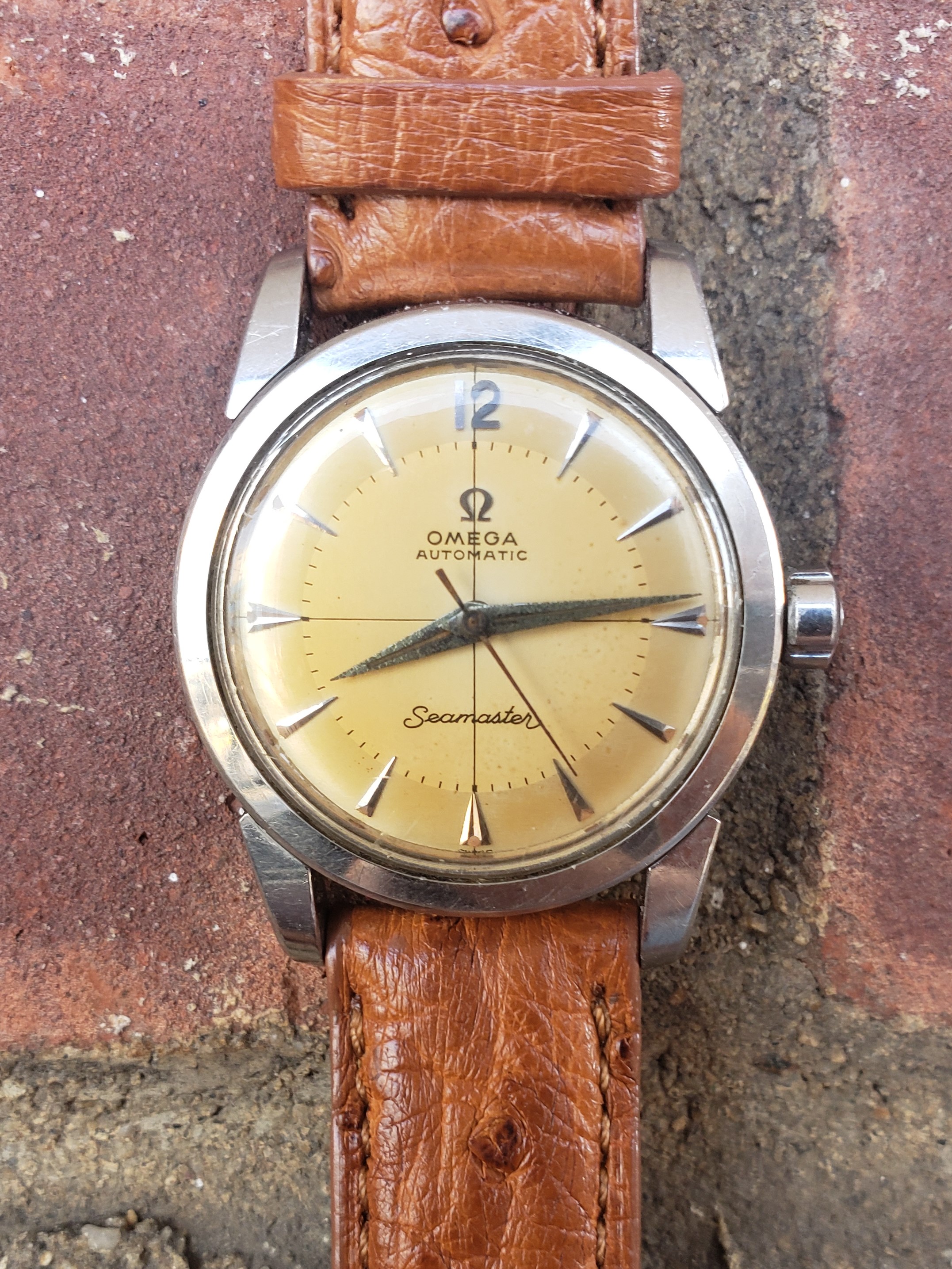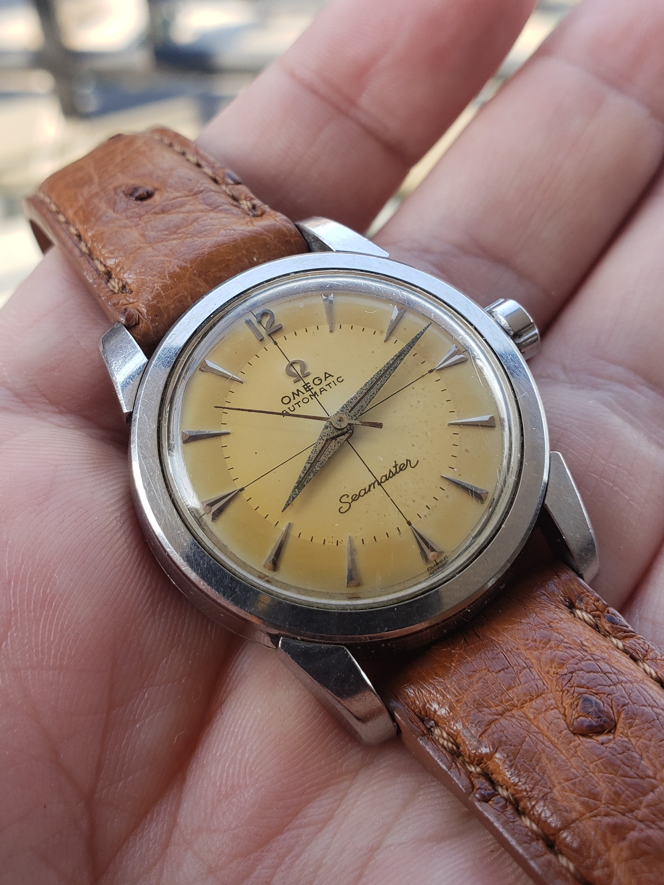 Dial has a crosshair. Lume has that nice orange/brown hue. Dial is a tobacco cream patina. I got this from an estate and when I pulled off the band the watch wreaked of tobacco smell, so that *may* explain the color. It is pretty uniform - see pictures. Crown is clover type. Crystal has omega logo in center. The watch is all original. I think an honest watch.