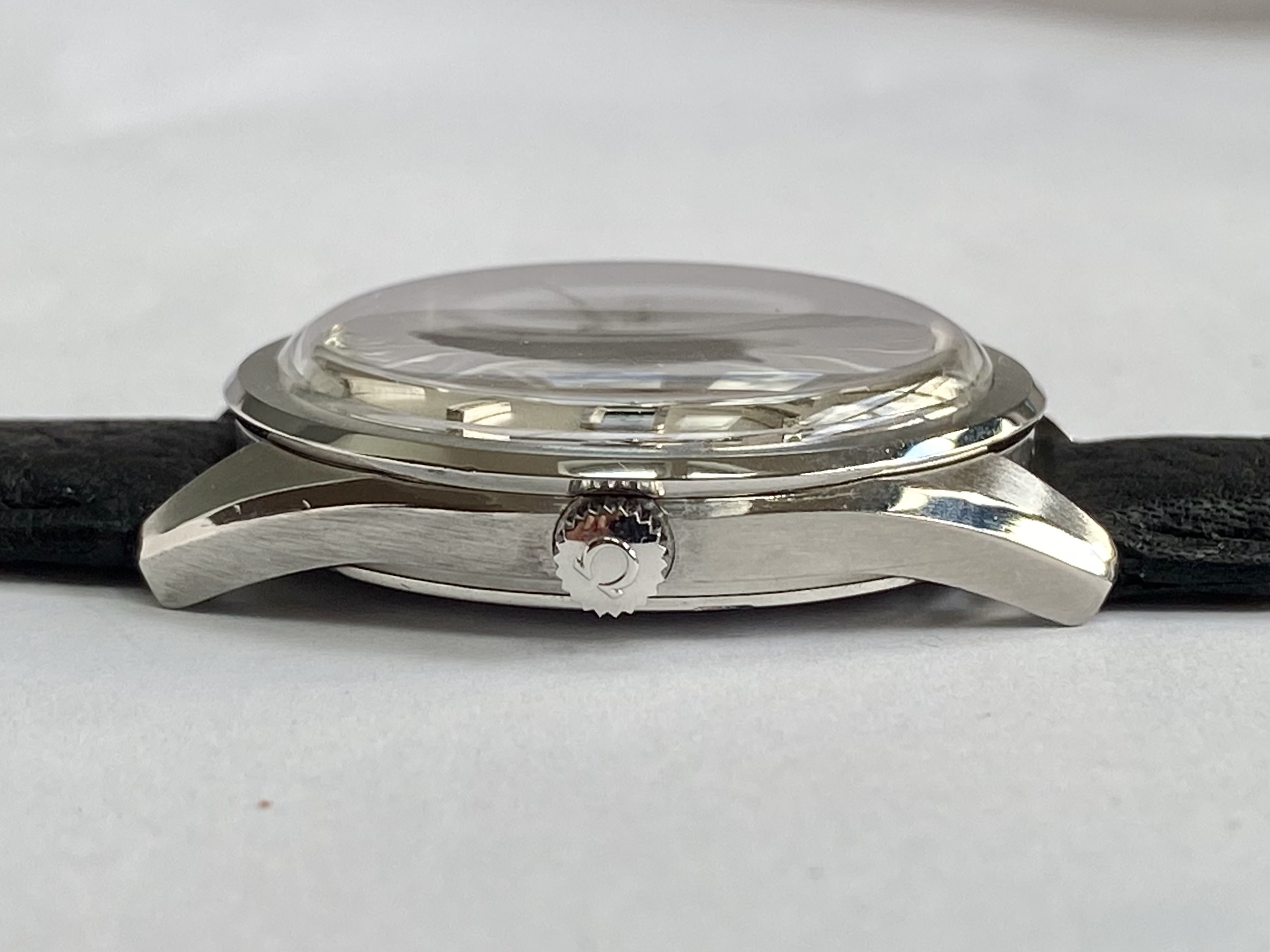 Silver sparkle dial, factory original, not refinished or restored. Applied Omega logo and hour markers. Excellent condition. With matching hands.