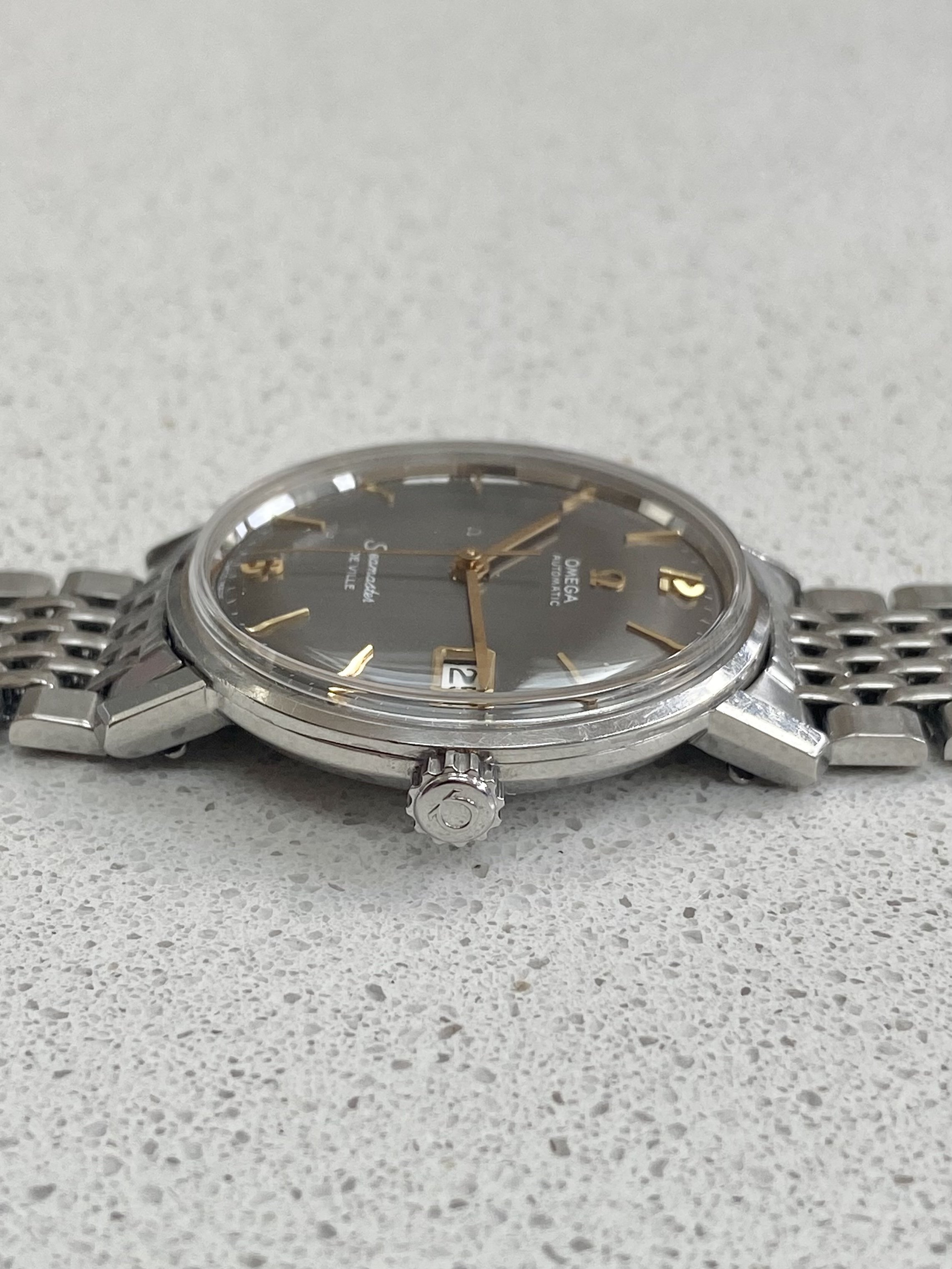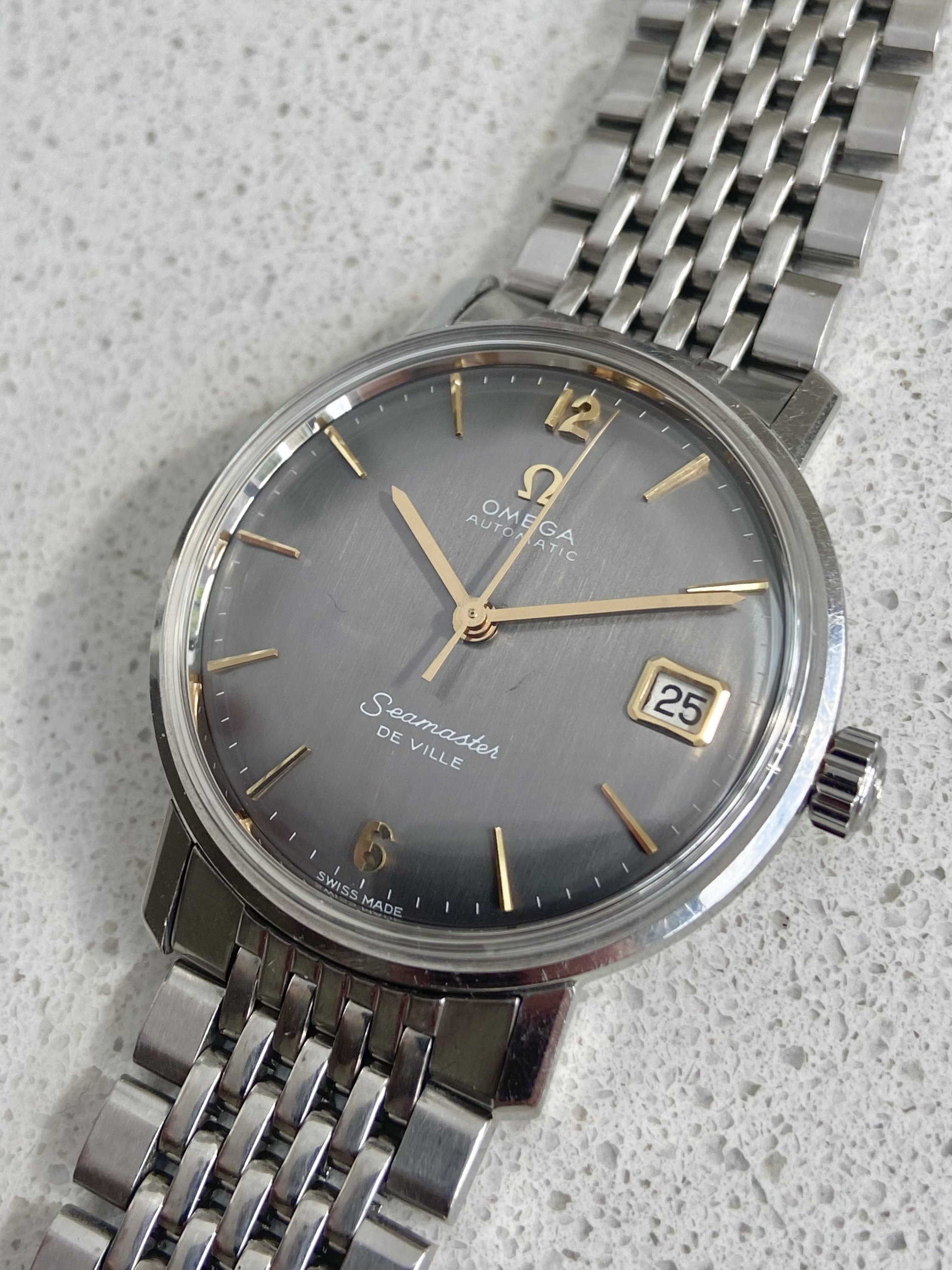 Factory original and very uncommon grey dial in good condition, not restored, refinished or repainted. With applied Omega logo, hour markers and arabics.
