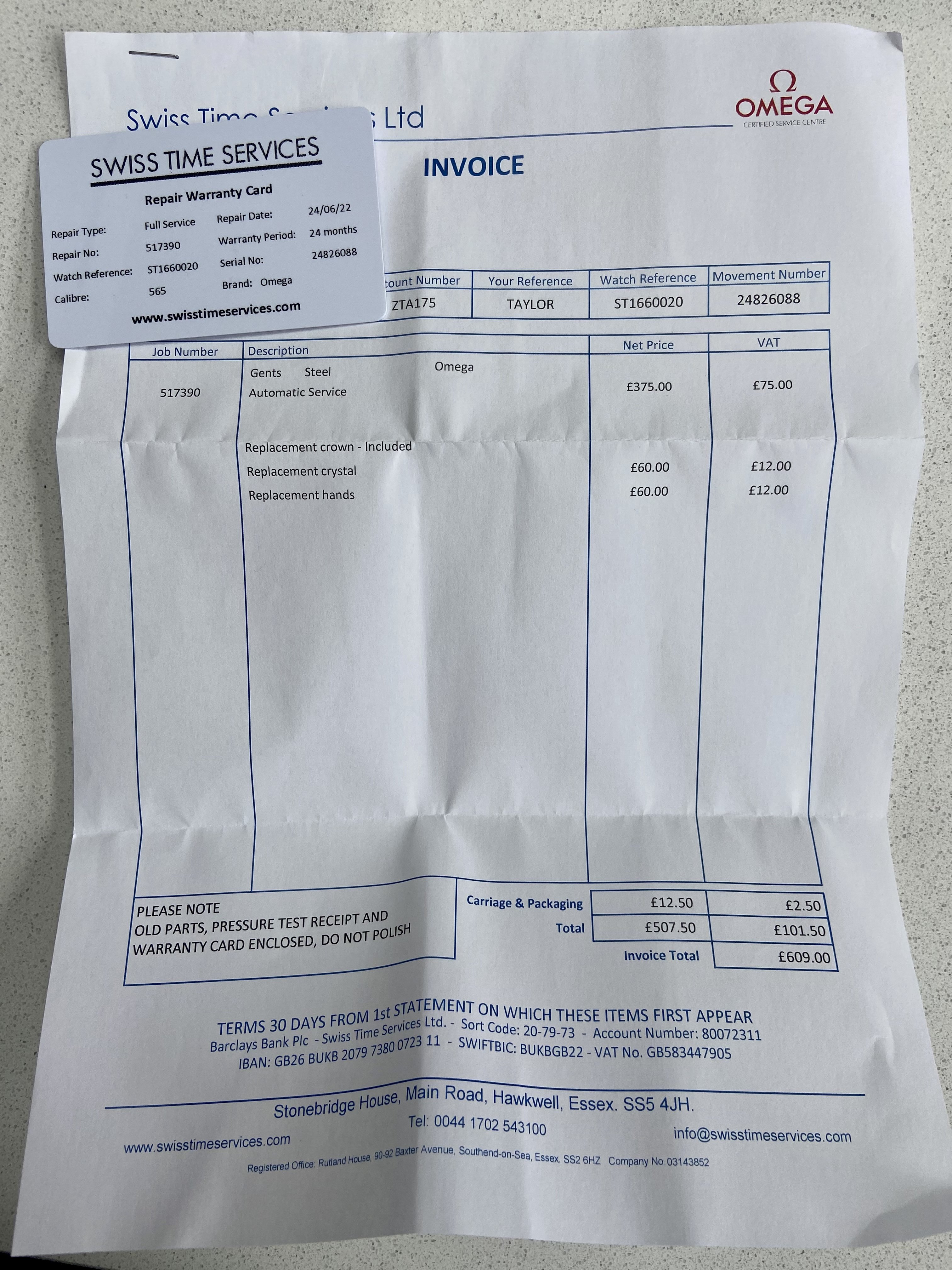 The watch was fully serviced by Swiss Time Services in the UK in 2022, where it received a new crystal, new old stock hand set and a new crown. It passed a pressure test and runs perfectly.
