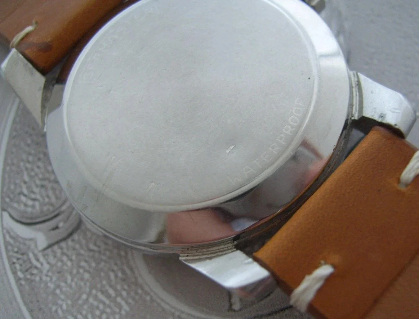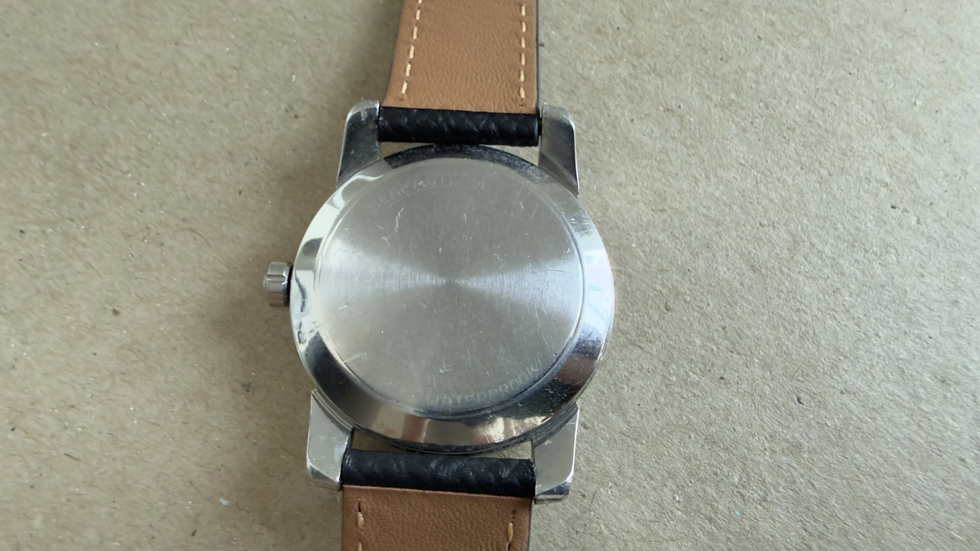 Comes on a light brown, handmade leather strap in like-new condition (note: not worn, but has been stored in a watch case, hence the slight creases in the strap).