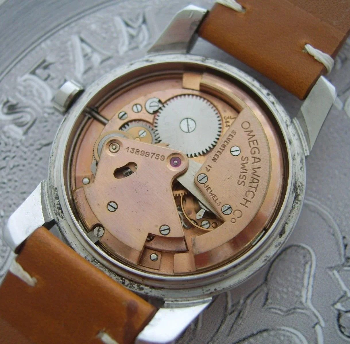 Hammer automatic Omega caliber 344, 17 jewels, over 70 years old. Beautifully patinated dial, original and not refinished. Gold indices and hands, Original crown. Case size is 34.5 mm excluding the crown.