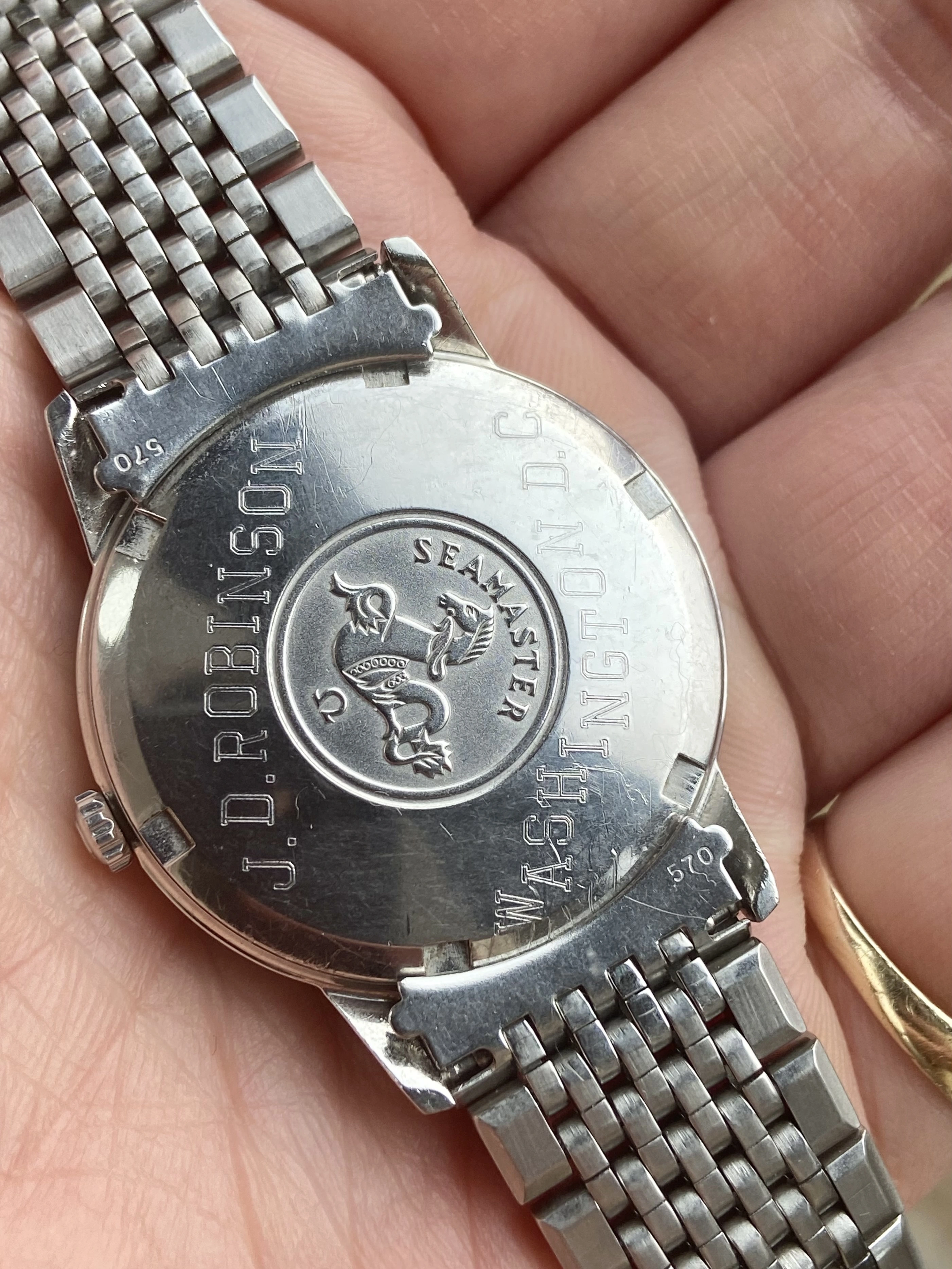 34mm Stainless steel case ref 165.002. In good condition, nice and thick with sharp lines and edges. Some light surface wear but no damage or corrosion. Engraving to the rear “J.D.Robinson Washington DC”.