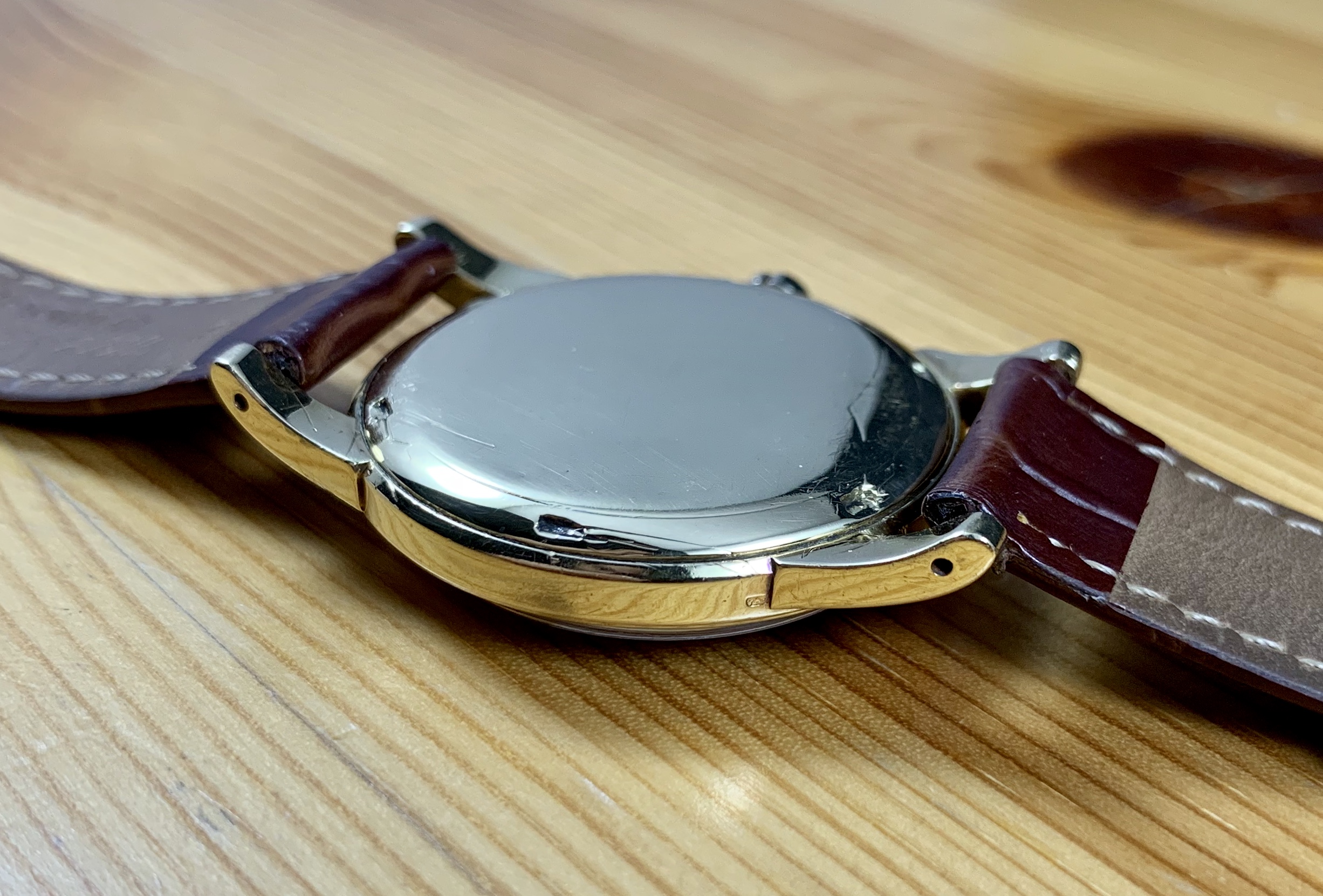 Solid 18k gold case with beefy lugs.