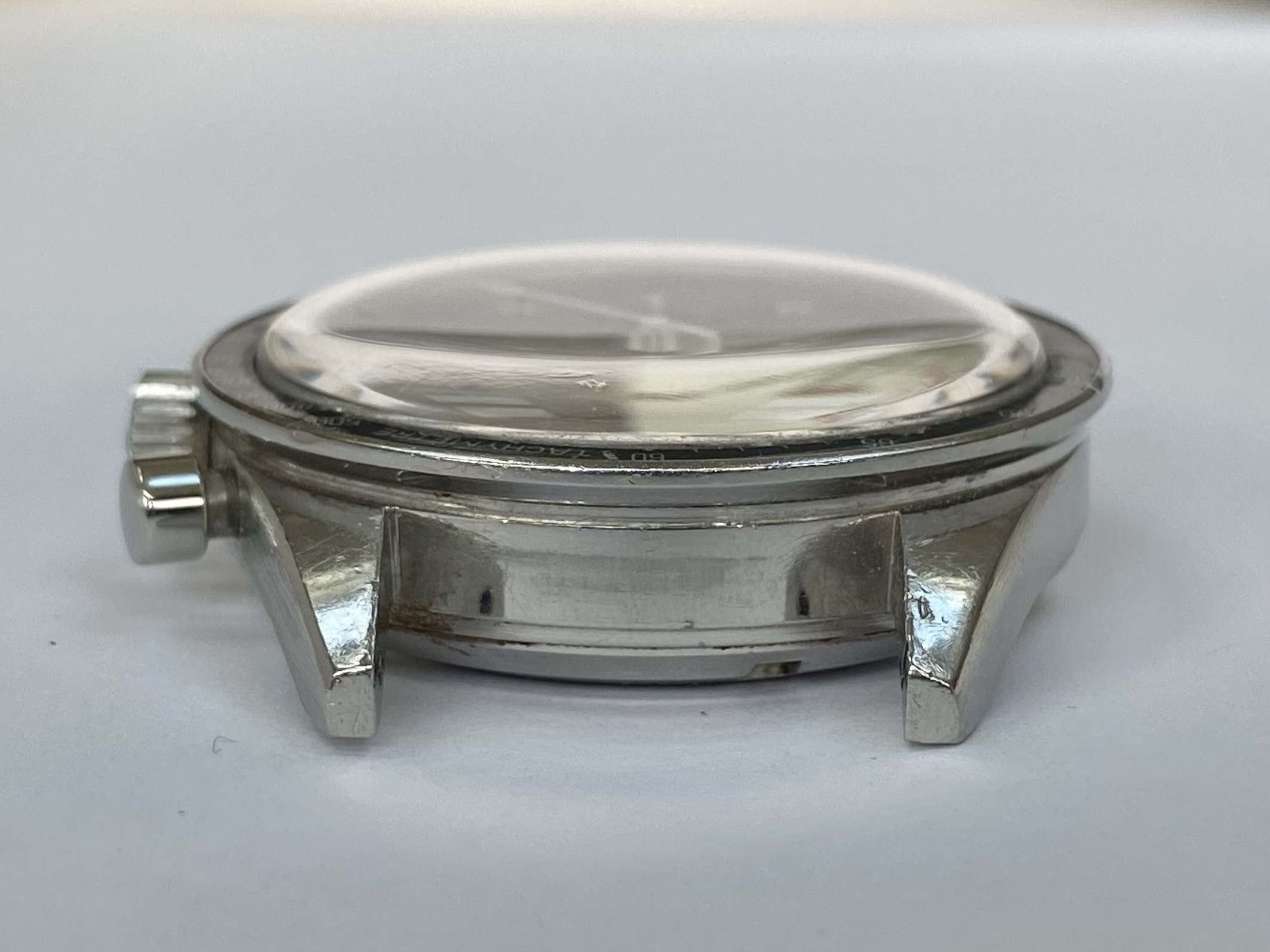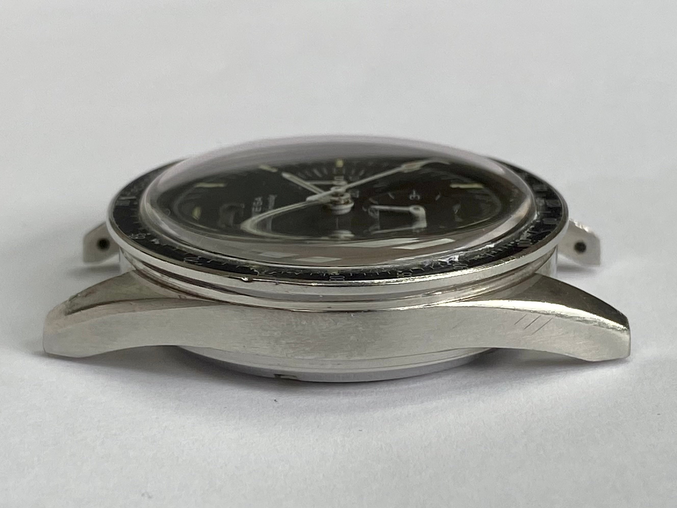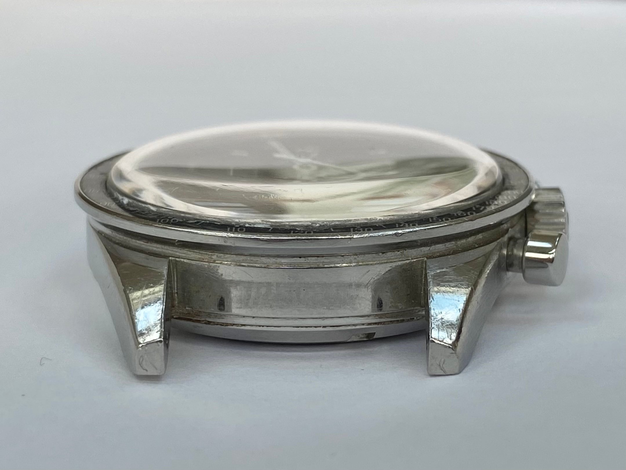 Original stainless steel straight lug case in very good unpolished condition, with surface wear as to be expected. No corrosion or damage. Never been polished or restored and retains thick lugs with the original brushed sides, polished tops and strong facets the -65’s are known for.