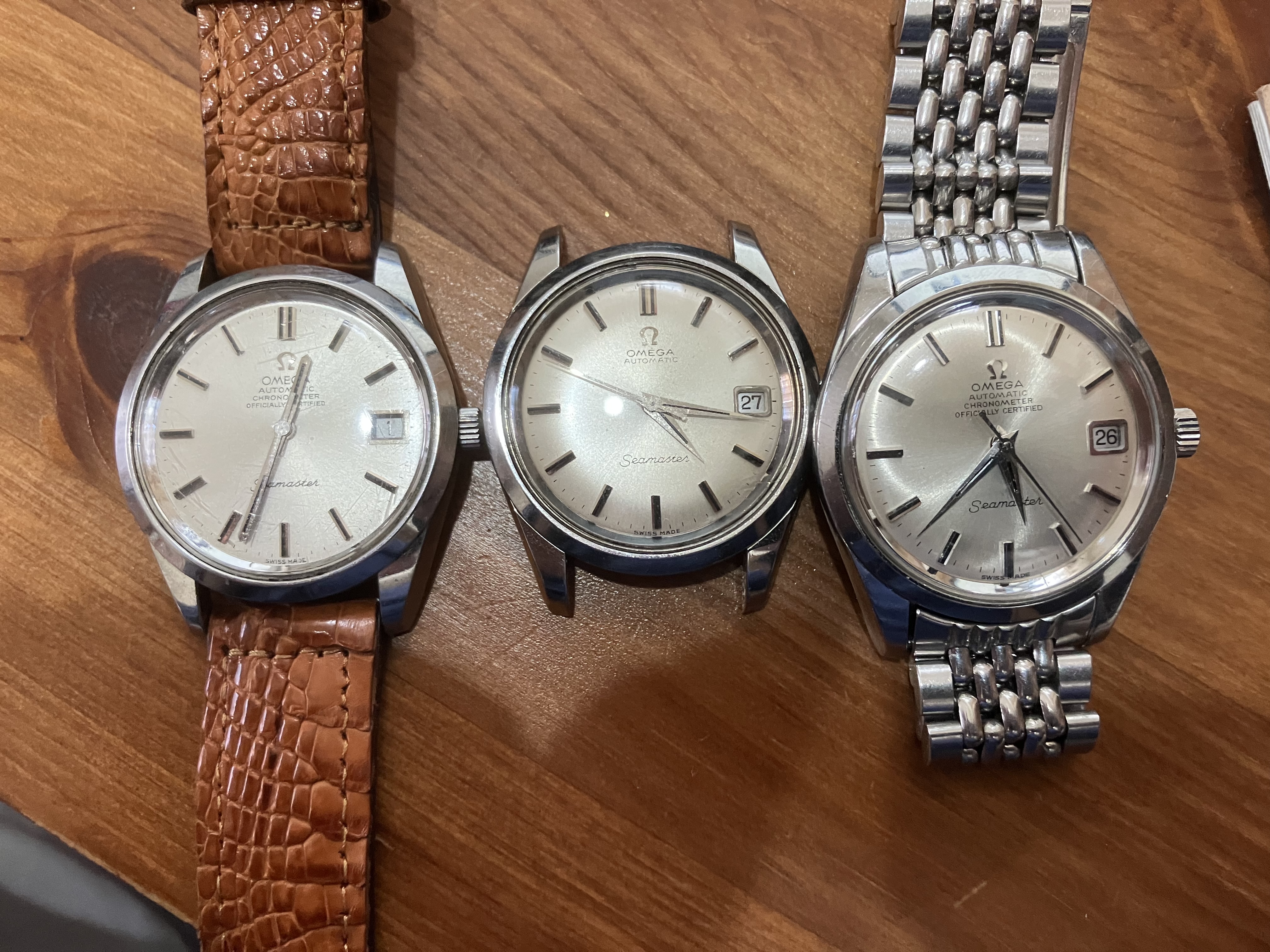 L-R: 168.0001, 166.010, 168.024. The rightmost watch is sitting slightly closer to the camera but has the same case as the middle watch.