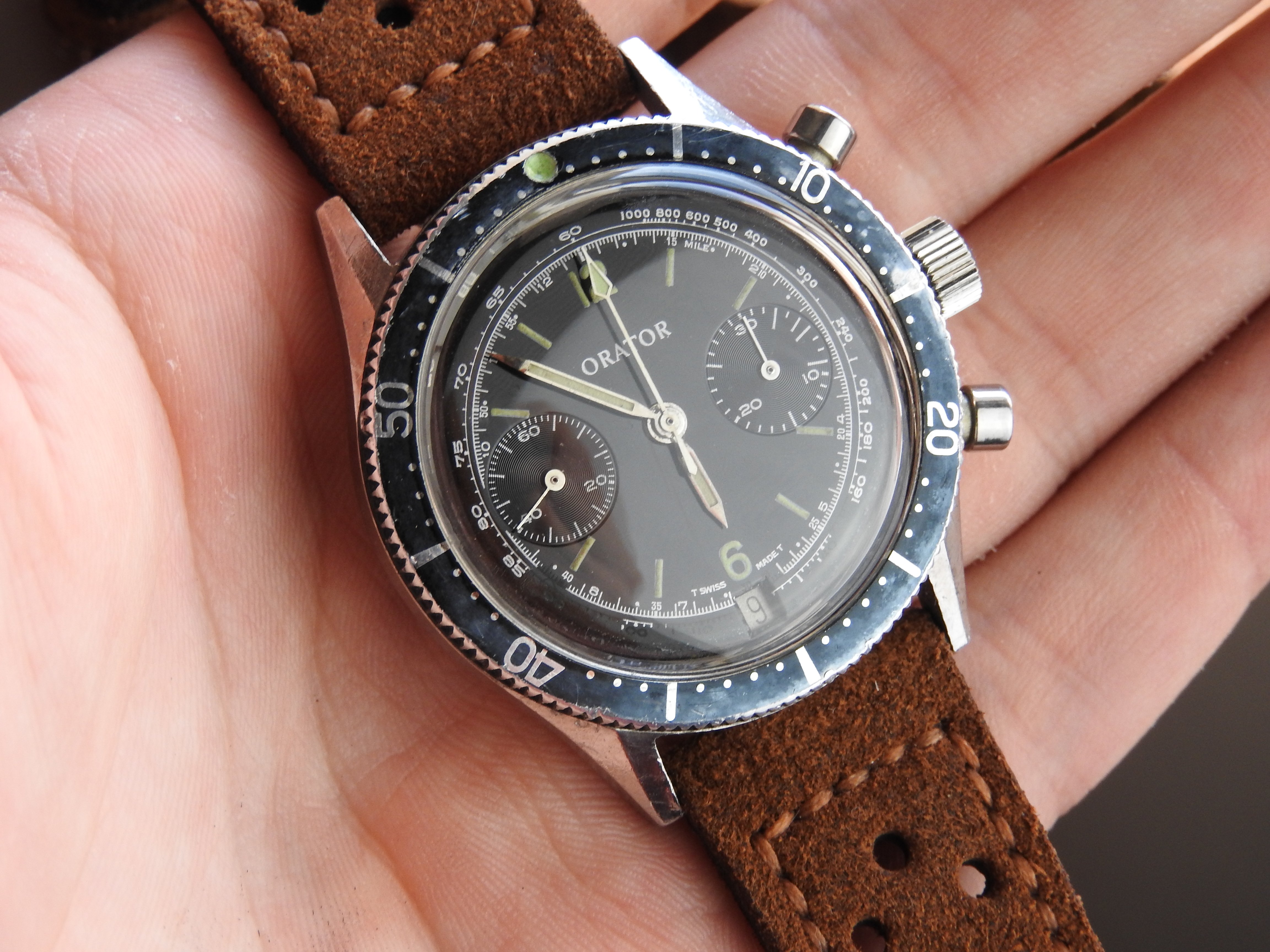 ·This Orator diving chronograph was produced in 1967 and measures 39mm. It was a watch brand owned by A. Schild & co, that produced watches under names such as Aqua Lung.